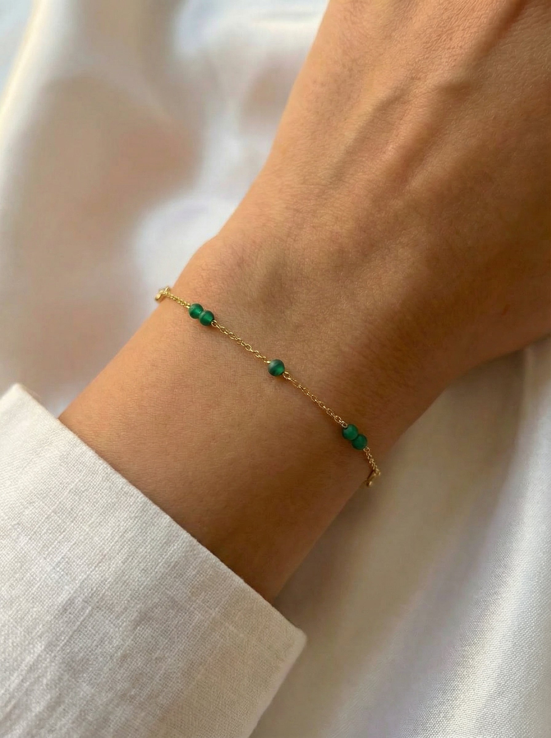 Βραχιόλι ροζάριο από χρυσό 14 ή 9 καρατίων, διακοσμημένο με μικρά πράσινα ζιργκόν που χαρίζουν μια φρέσκια, κομψή πινελιά στον καρπό. Η minimal αλυσίδα του το κάνει ιδανικό για καθημερινή χρήση, ενώ ο χρωματικός συνδυασμός το βοηθά να φοριέται εύκολα είτε μόνο του είτε σε layering με άλλα λεπτά βραχιόλια.