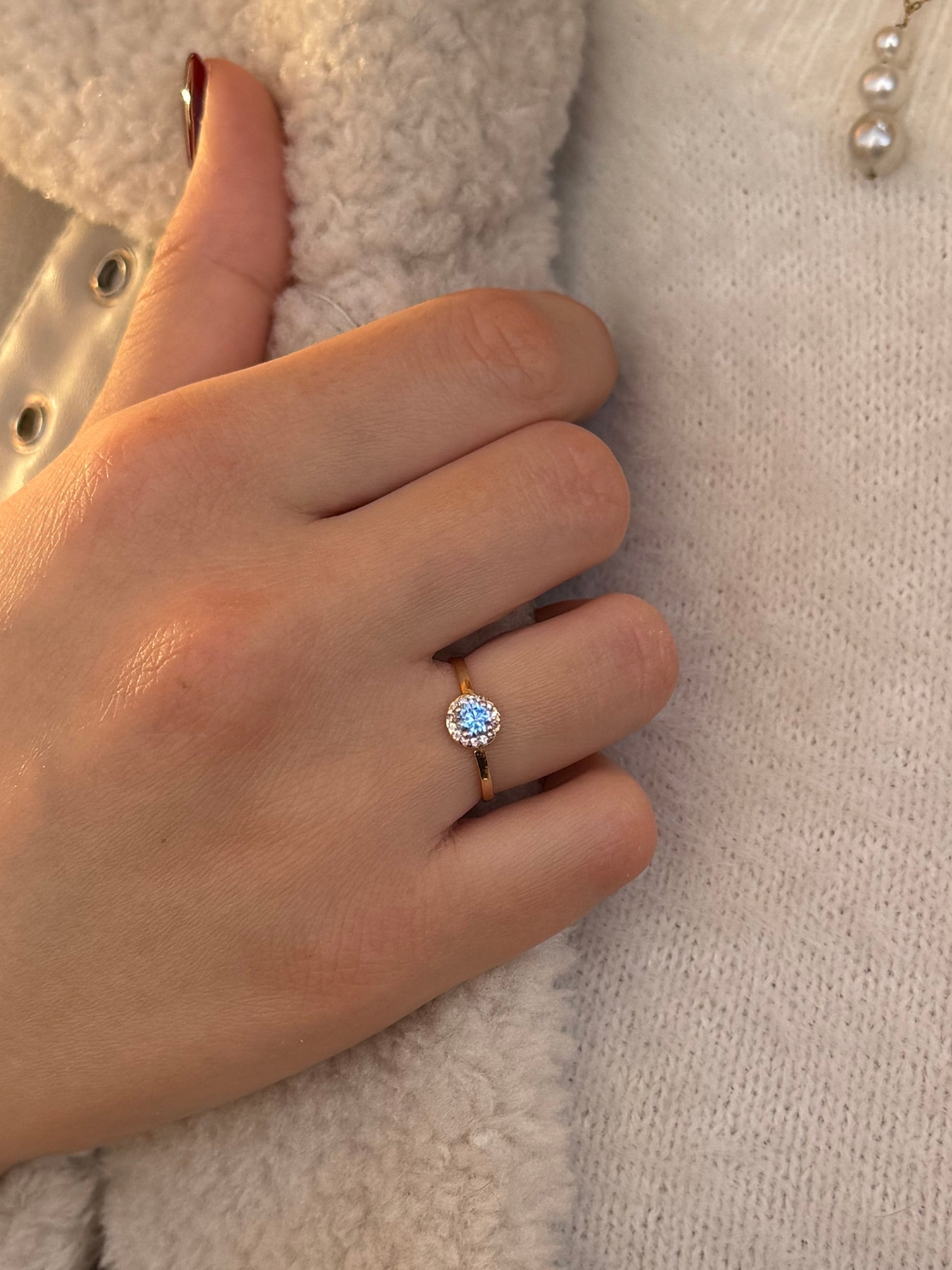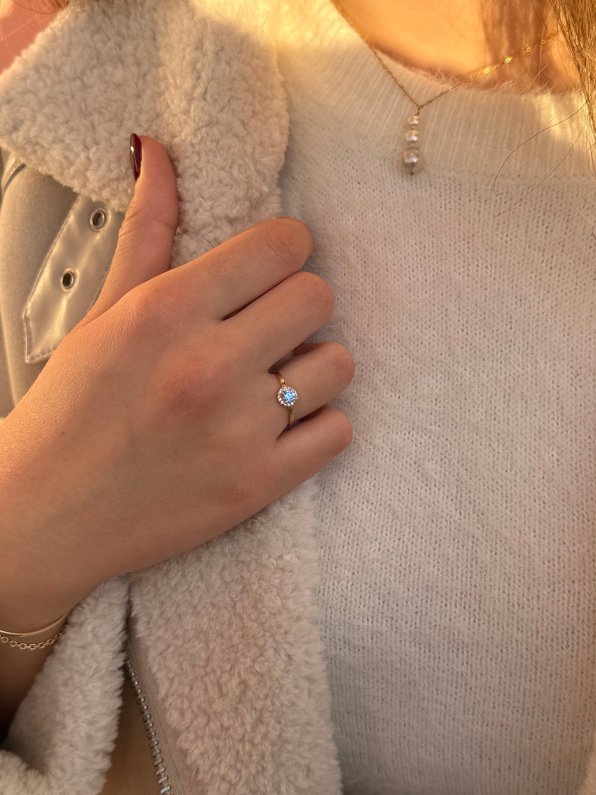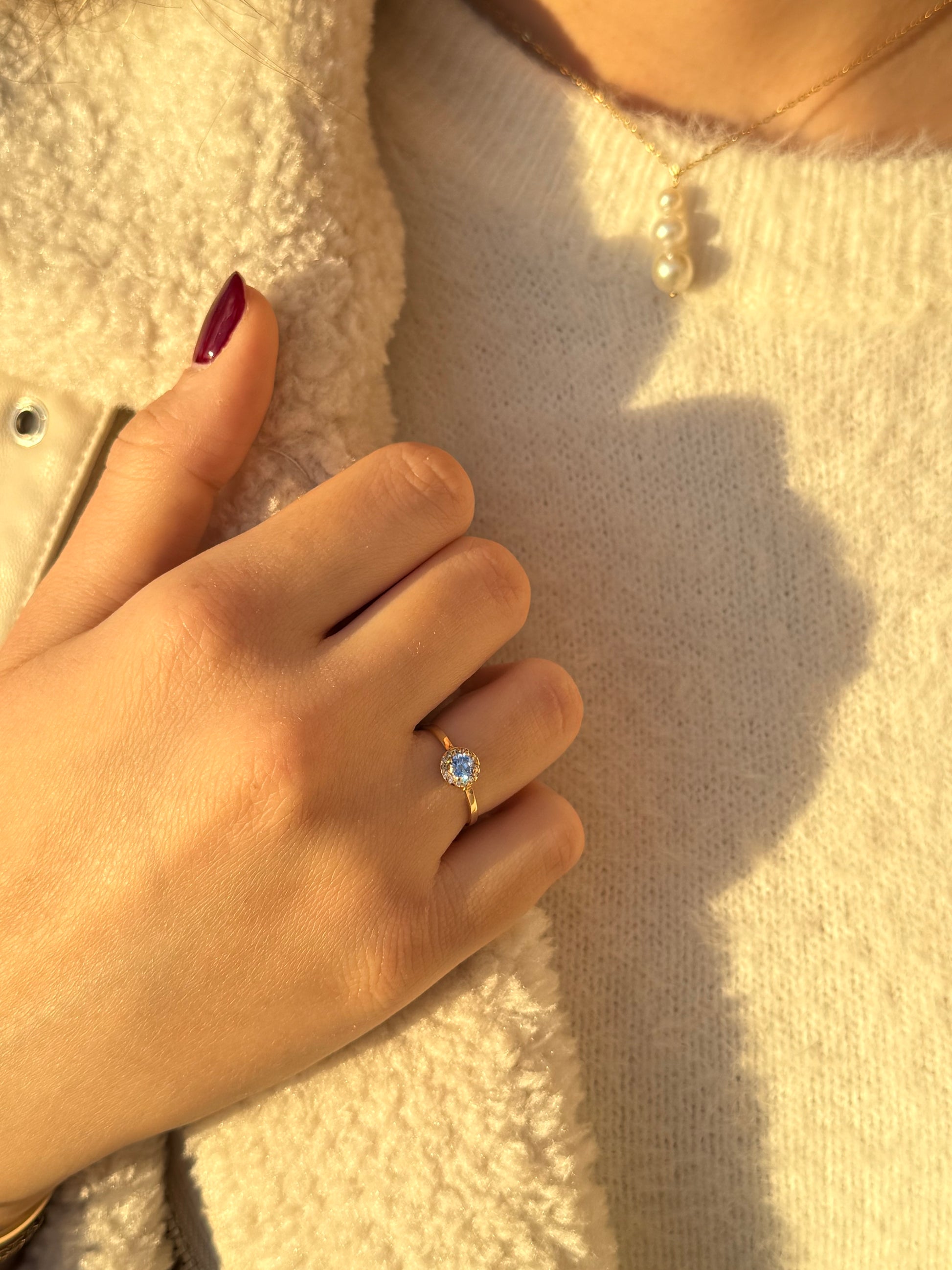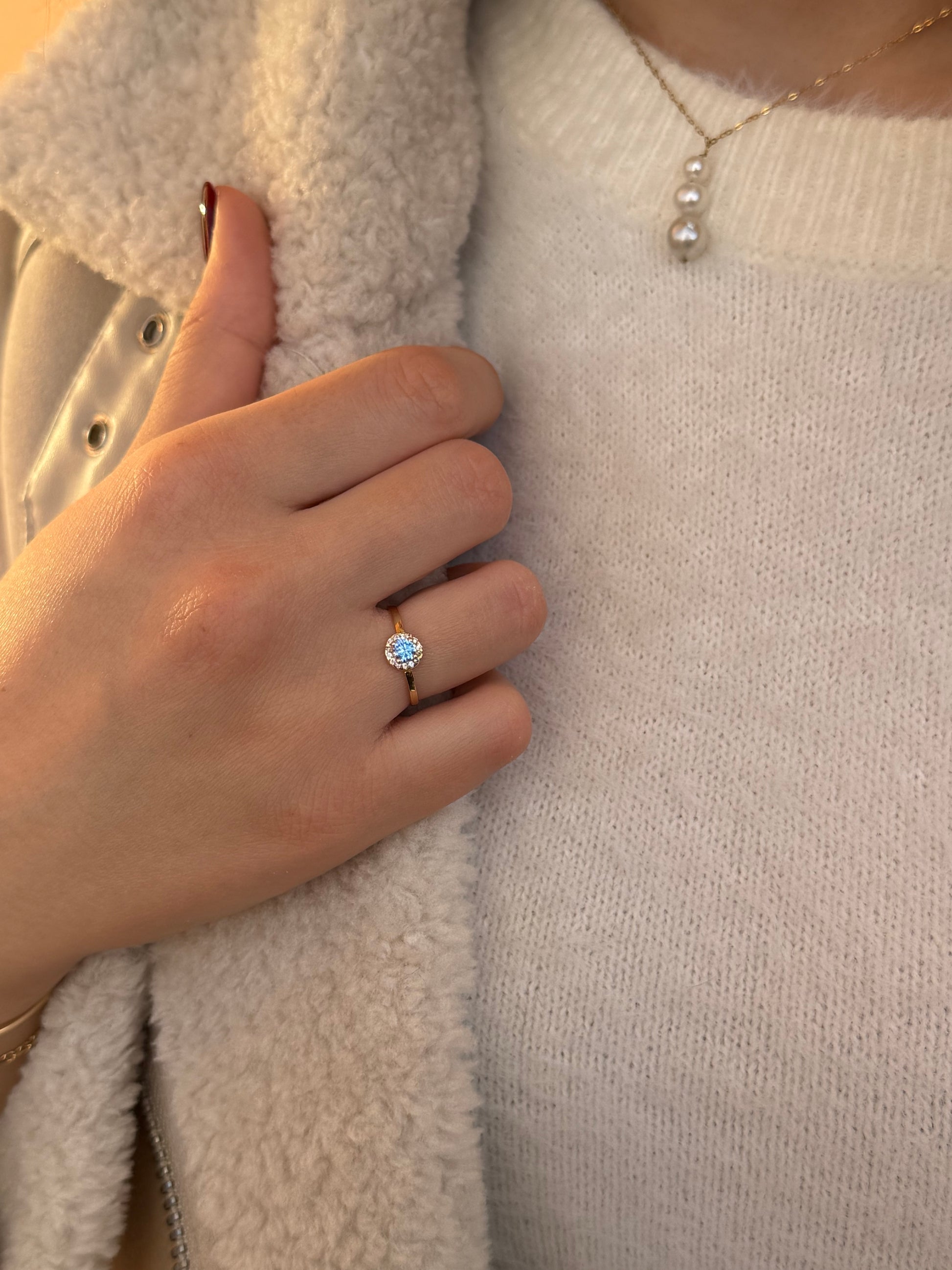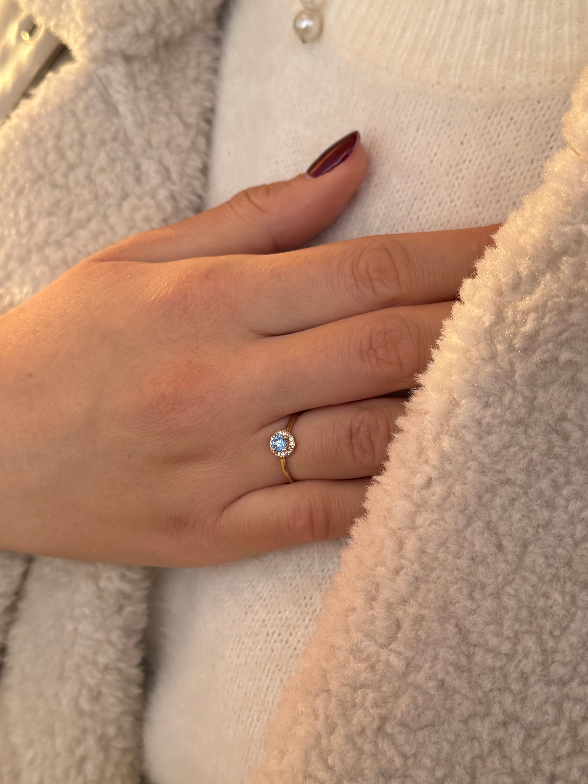Κομψό και διαχρονικό δαχτυλίδι ροζέτα σε χρυσό 14 καρατίων, με κεντρική γαλάζια πέτρα ζιργκόν που χαρίζει φρέσκια λάμψη και κομψότητα στο χέρι. Τα λευκά ζιργκόν που την αγκαλιάζουν φωτίζουν ακόμη περισσότερο το χρώμα της, δημιουργώντας ένα elegant και διακριτικό αποτέλεσμα που ταιριάζει σε όλες τις ηλικίες και σε κάθε εμφάνιση. Ιδανικό για καθημερινό στιλ αλλά και για πιο ιδιαίτερες στιγμές.