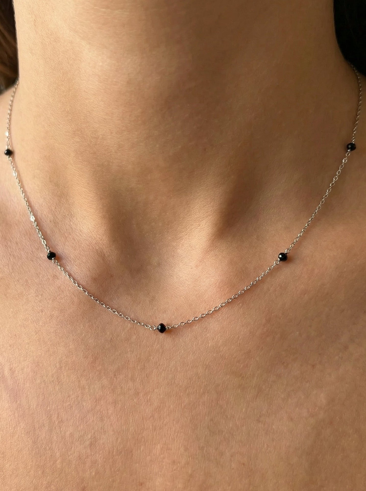 Kομψό κολιέ σε Κ14 λευκόχρυσο, διακοσμημένο με μικρές μαύρες πέτρες κατά μήκος της αλυσίδας.
