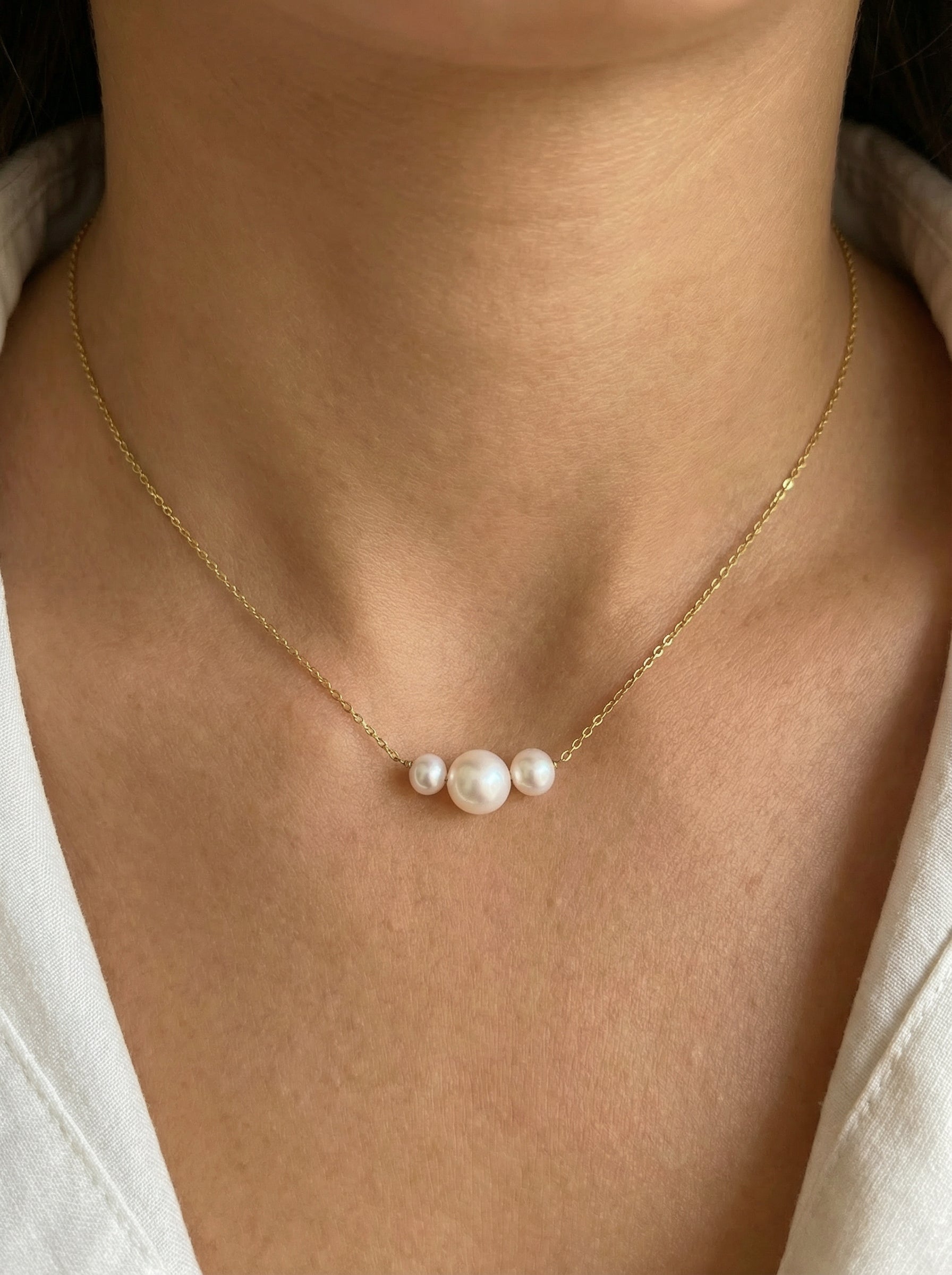 Κολιέ σε Κ14 ή Κ9 χρυσό με τρία φυσικά λευκά μαργαριτάρια τοποθετημένα σε αρμονική διάταξη «συννεφάκι».