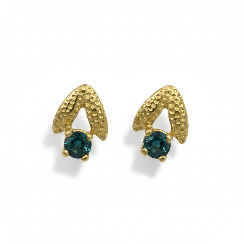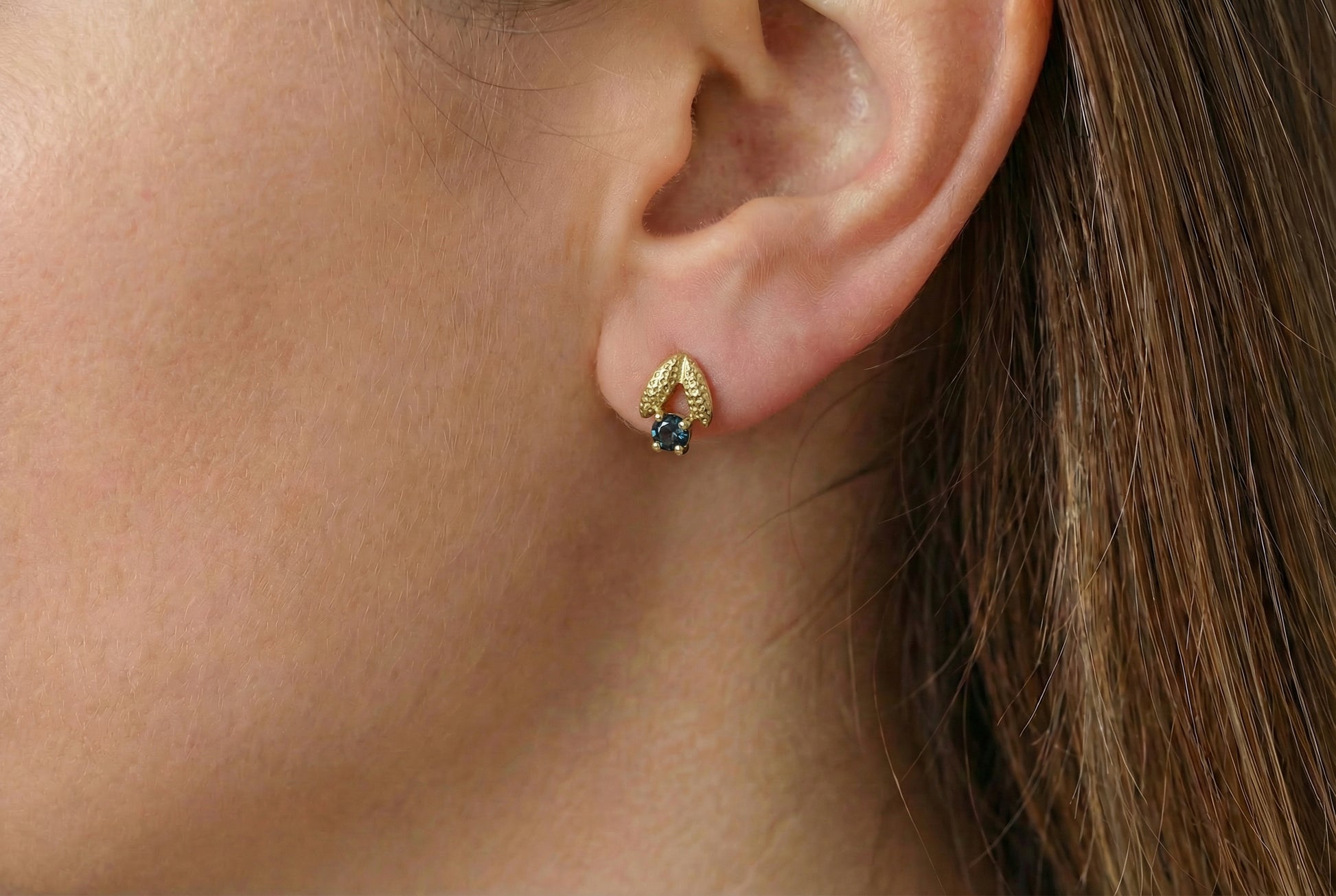 Κομψά σκουλαρίκια καρφωτά σε χρυσό Κ14, με λεπτομέρεια φύλλου και ένα σκούρο πράσινο ζιργκόν στη βάση που προσφέρει διακριτική λάμψη. Το ανάγλυφο σχέδιο δημιουργεί μια ιδιαίτερη υφή, κάνοντάς τα να ξεχωρίζουν χωρίς να είναι υπερβολικά. Ένα κομψό, καθημερινό κόσμημα που ταιριάζει σε κάθε ηλικία. 💙