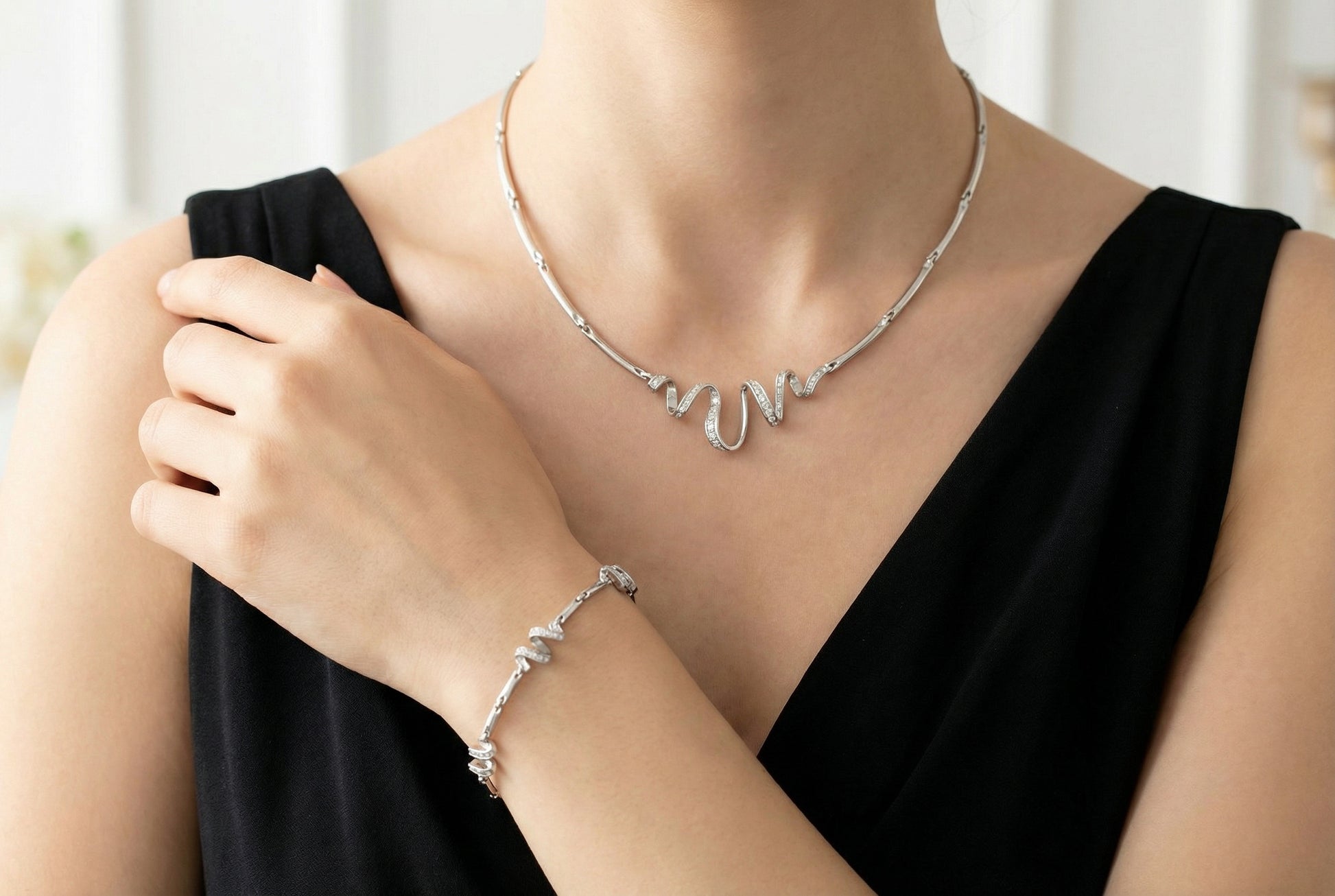 Πολυτελές σετ κοσμημάτων από λευκόχρυσο 14 καρατίων, διακοσμημένο με λαμπερά λευκά ζιργκόν και σχεδιασμένο σε ένα κομψό, μοντέρνο κυματιστό μοτίβο, που αποπνέει διακριτική λάμψη, κίνηση και διαχρονικό στυλ.
