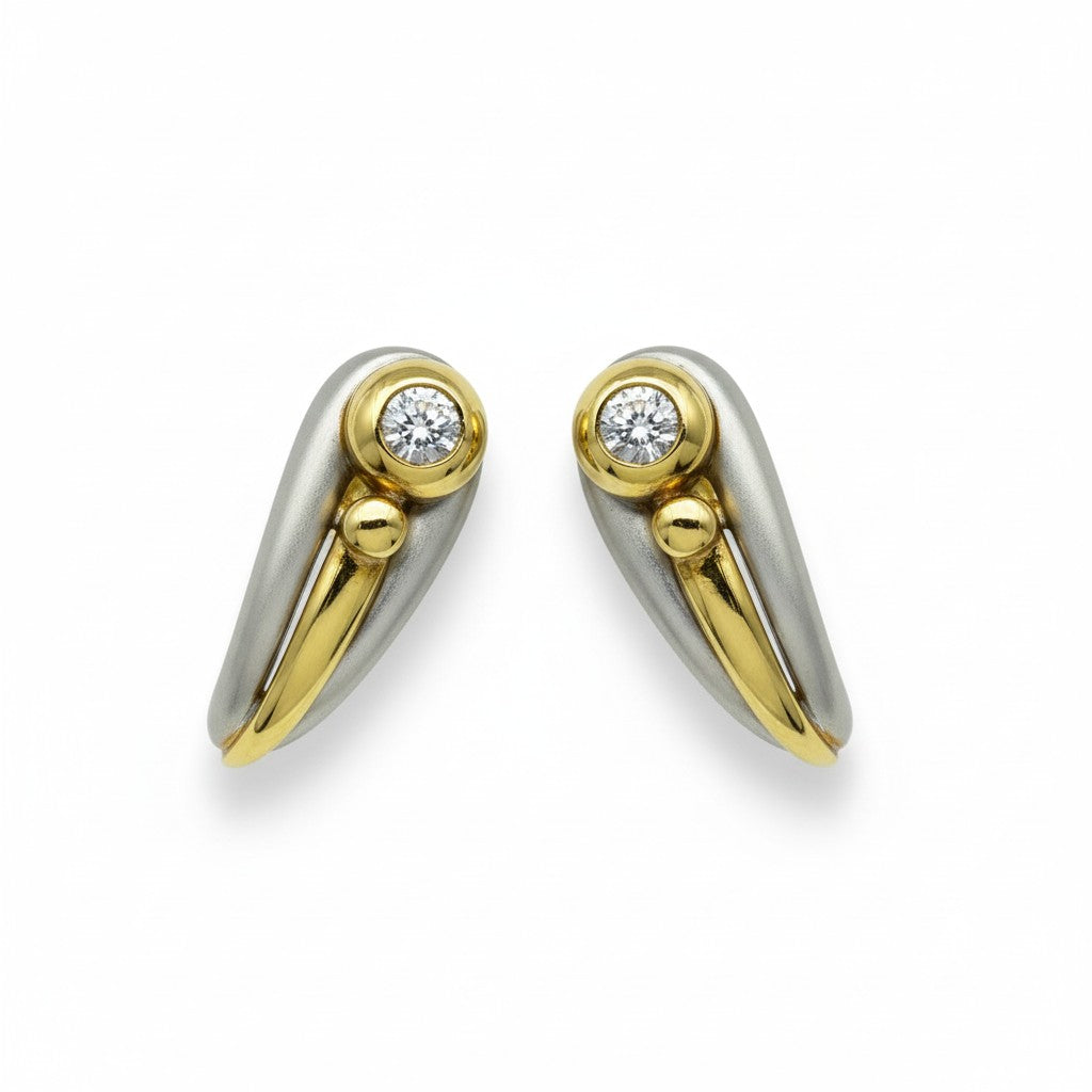 Κομψά σκουλαρίκια από χρυσό 14 καρατίων σε δίχρωμο σχέδιο, με λευκό ζιργκόν κοπής brilliant στο επάνω μέρος που χαρίζει έντονη λάμψη. Ο συνδυασμός λευκού και κίτρινου χρυσού δημιουργεί μια μοντέρνα, αρχιτεκτονική αισθητική που τα κάνει ιδανικά για καθημερινή χρήση αλλά και για πιο ιδιαίτερες εμφανίσεις. ✨