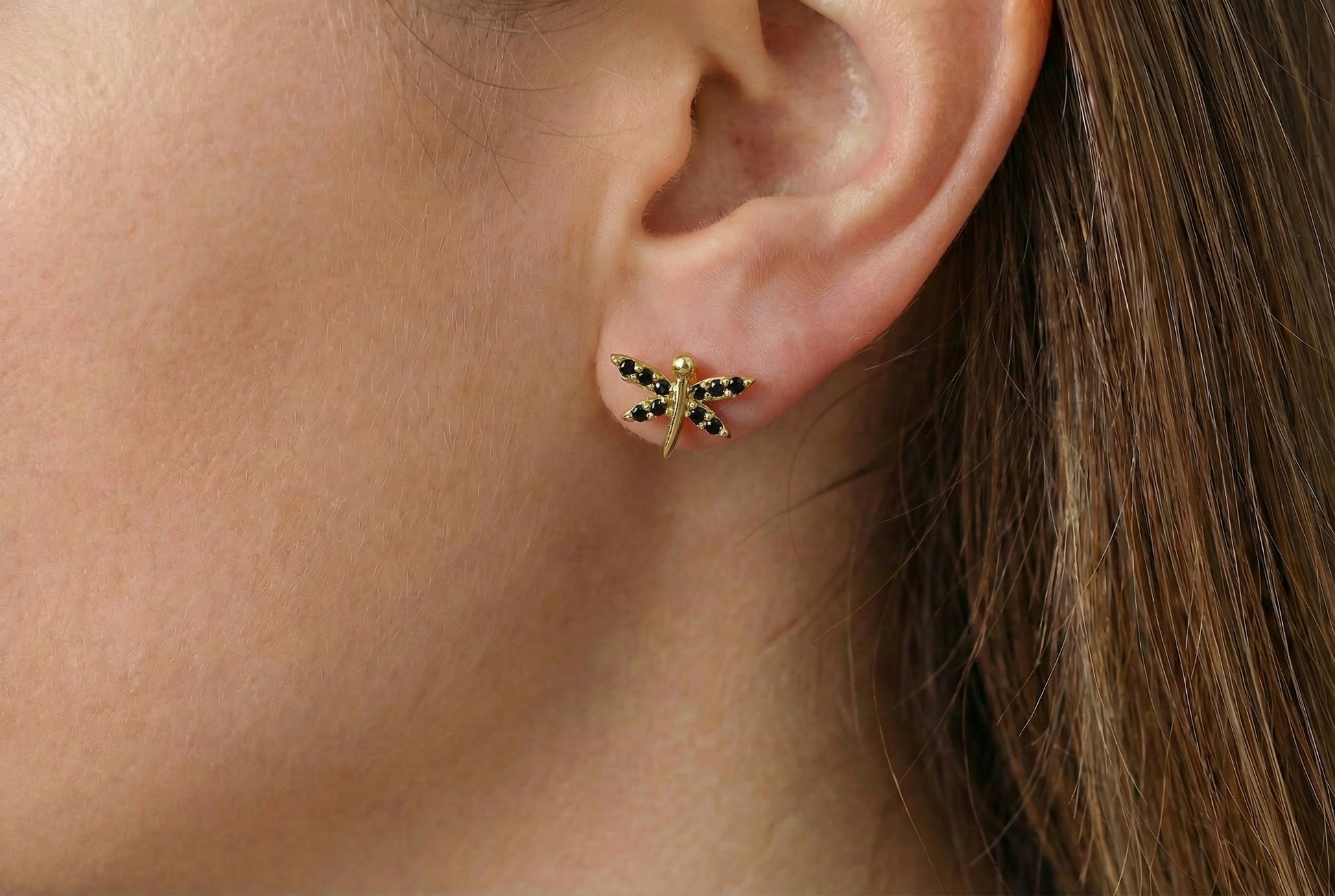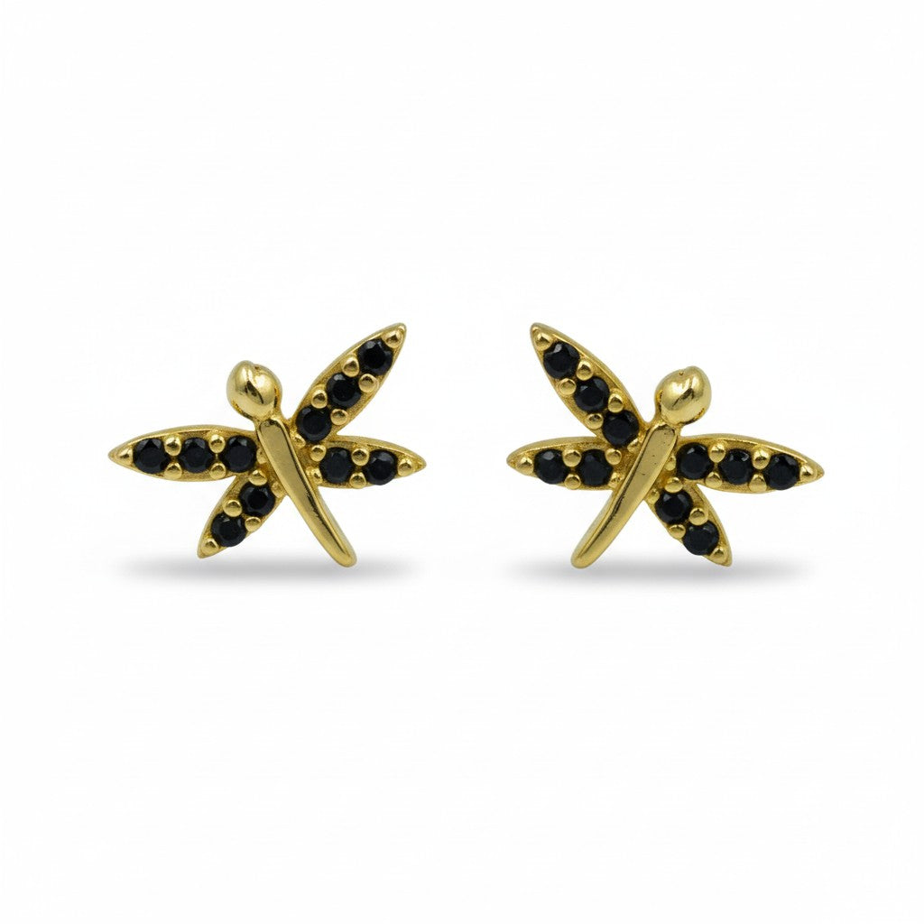 Κομψά σκουλαρίκια καρφωτά σε χρυσό Κ14, σε σχέδιο λιβελούλας, διακοσμημένα με μαύρα ζιργκόν.Ένα διακριτικό σχέδιο, ιδανικό για καθημερινή χρήση και για όλες τις ηλικίες.