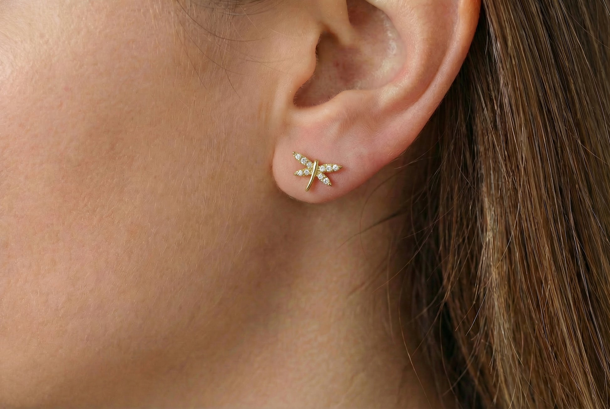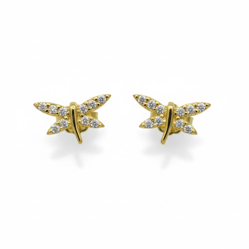 Κομψά σκουλαρίκια καρφωτά σε χρυσό Κ14, σε σχέδιο λιβελούλας, διακοσμημένα με λαμπερά λευκά ζιργκόν.Ένα διακριτικό σχέδιο, ιδανικό για καθημερινή χρήση και για όλες τις ηλικίες.