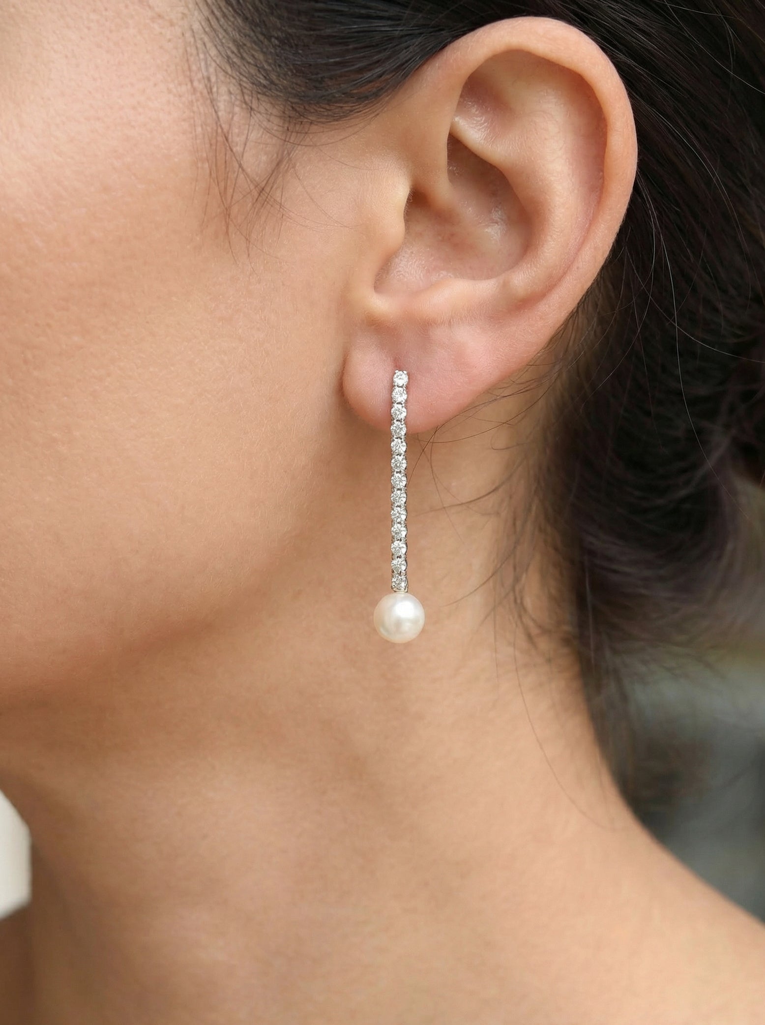 Εκλεπτυσμένα και διαχρονικά γυναικεία λευκόχρυσα σκουλαρίκια από χρυσό 14 καρατίων, με κάθετο κρεμαστό σχέδιο από λαμπερά ζιργκόν που καταλήγουν σε φυσικό μαργαριτάρι. Η κομψή γραμμή και η διακριτική λάμψη τους αναδεικνύουν το πρόσωπο με φινέτσα, προσφέροντας ένα αποτέλεσμα που ισορροπεί ιδανικά ανάμεσα στο κλασικό και το σύγχρονο.