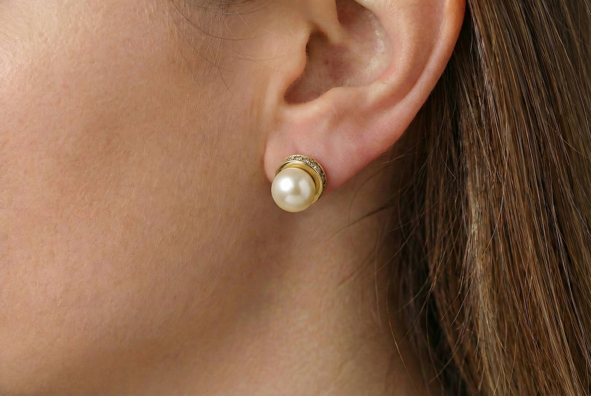 Κομψά καρφωτά σκουλαρίκια από χρυσό Κ14, διακοσμημένα με φυσικό λευκό μαργαριτάρι και λεπτή σειρά από λευκά ζιργκόν που χαρίζουν διακριτική λάμψη.