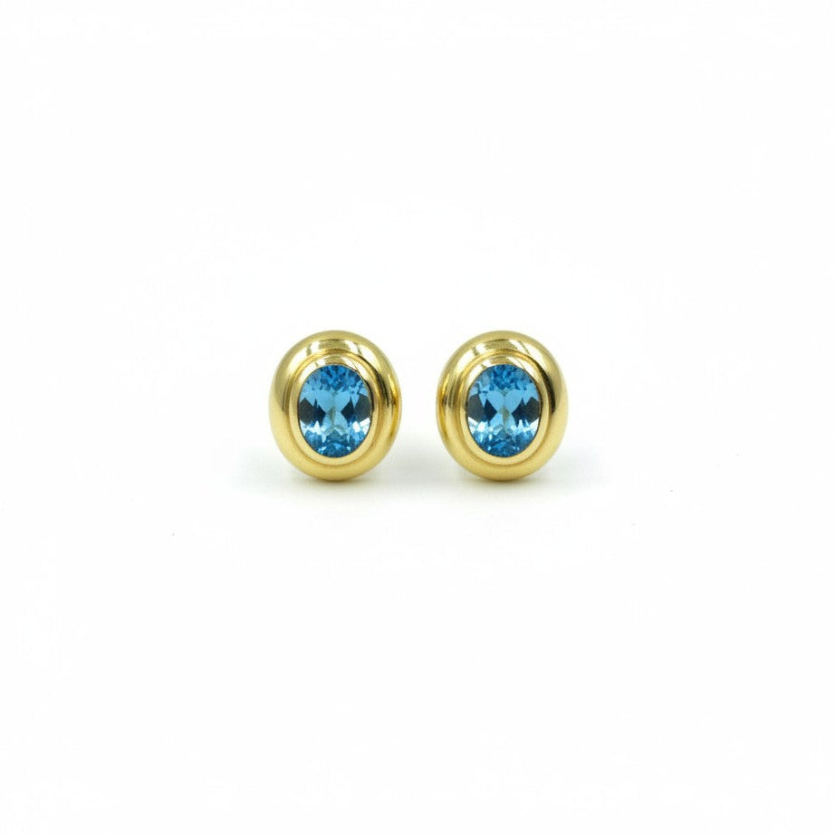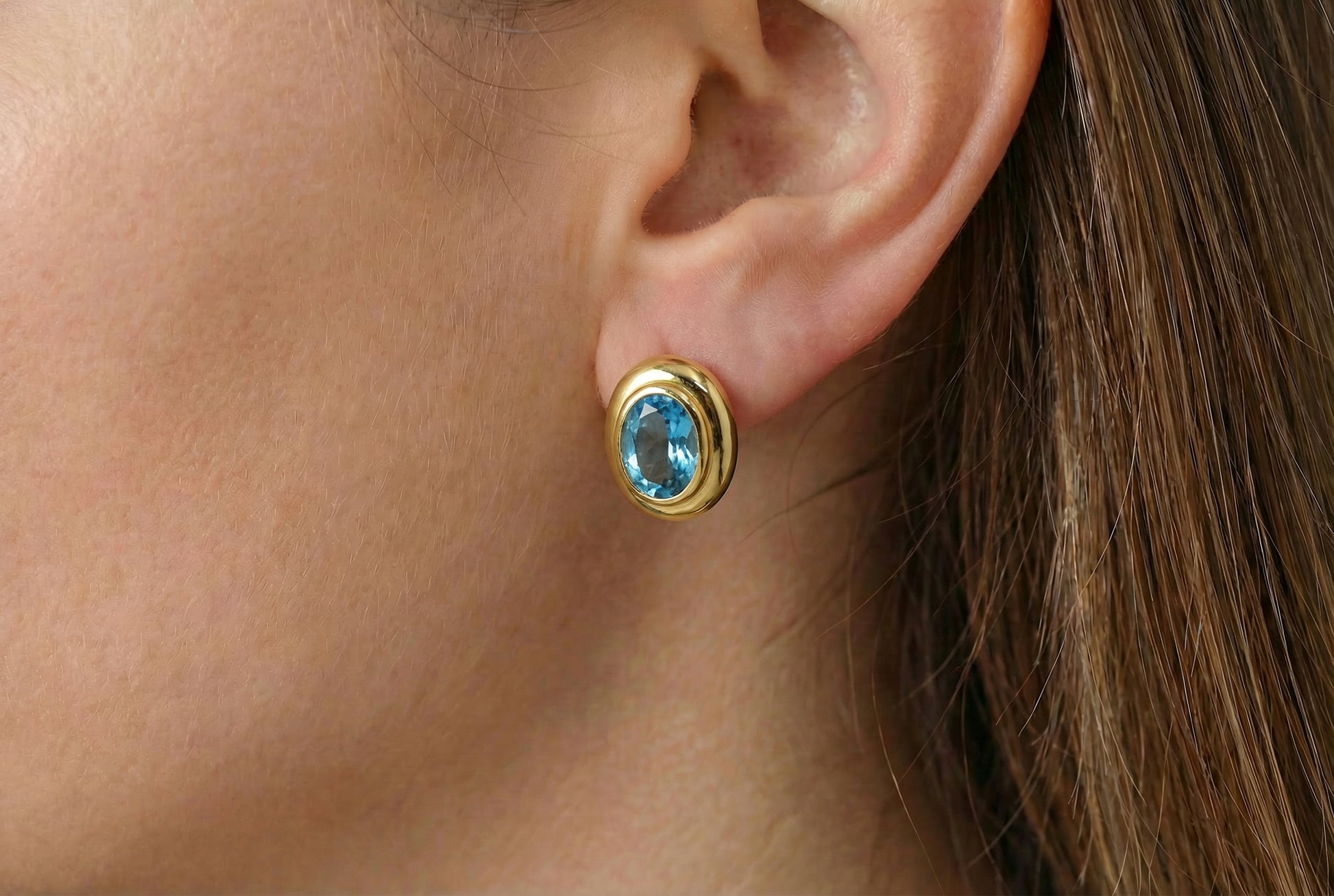 Κομψά σκουλαρίκια από χρυσό 14 καρατίων, με εντυπωσιακή οβάλ μπλε πέτρα σε μοντέρνα κλειστή στεφάνη. Η έντονη λάμψη της πέτρας σε συνδυασμό με το ζεστό χρώμα του χρυσού δημιουργούν ένα elegant κόσμημα που φοριέται από το πρωί έως το βράδυ. ✨