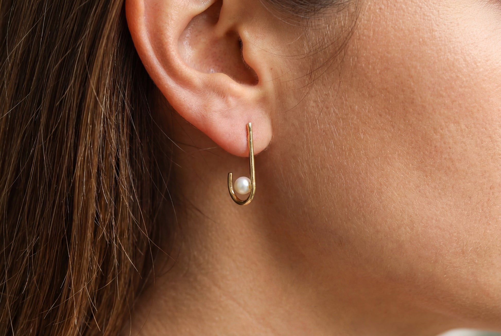 Κομψά σκουλαρίκια σε σχήμα U, κατασκευασμένα σε χρυσό Κ9 ή Κ14, διακοσμημένα με μία λευκή πέρλα στο κάτω μέρος. Ένα διαχρονικό σχέδιο που προσθέτει φινέτσα σε κάθε εμφάνιση — από το πρωινό look μέχρι τις πιο ιδιαίτερες στιγμές σας.