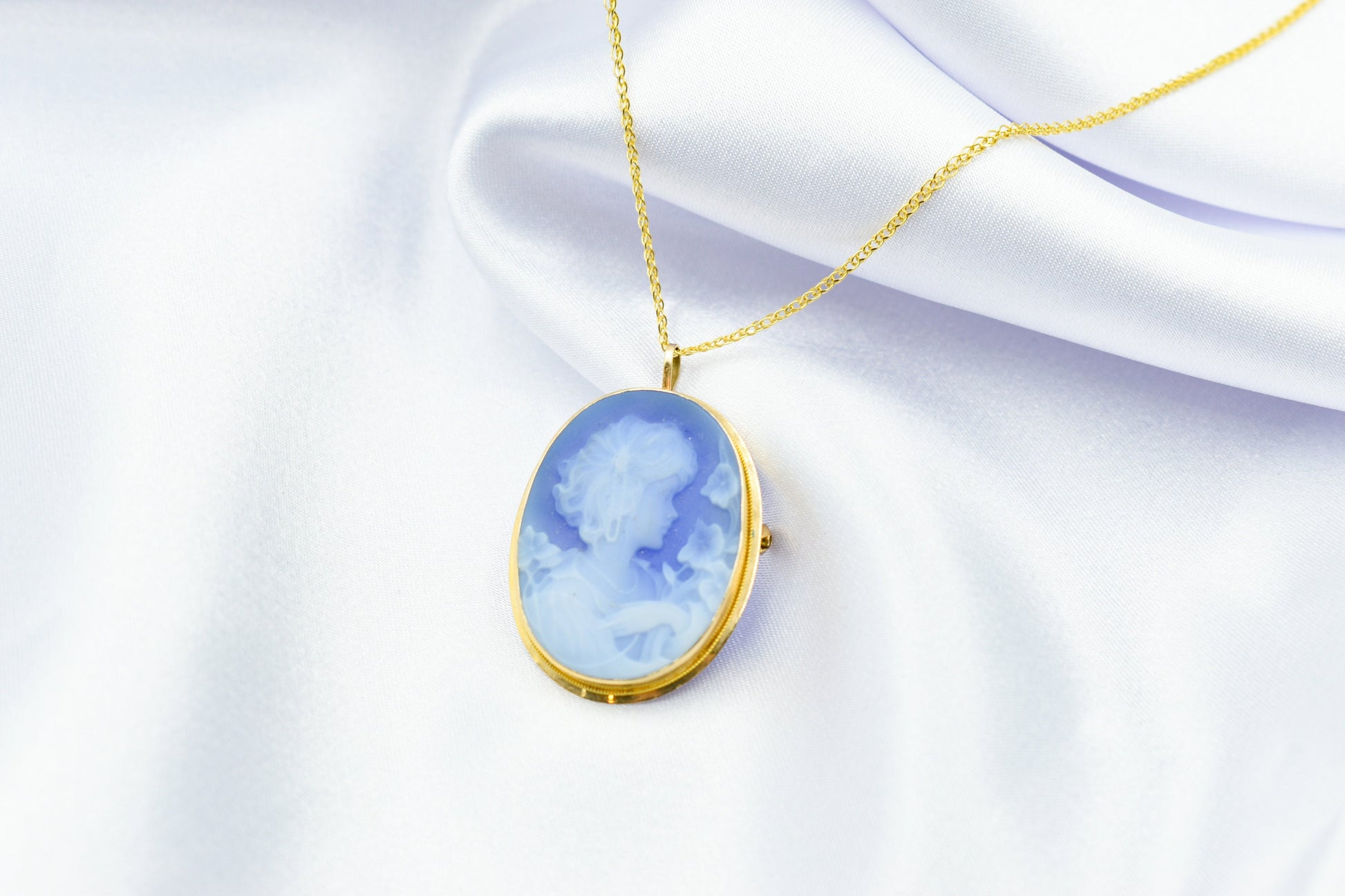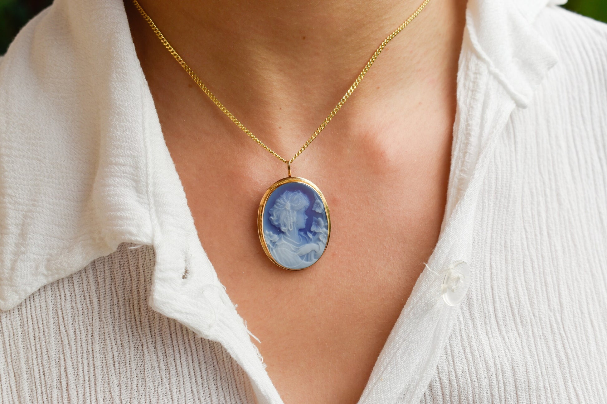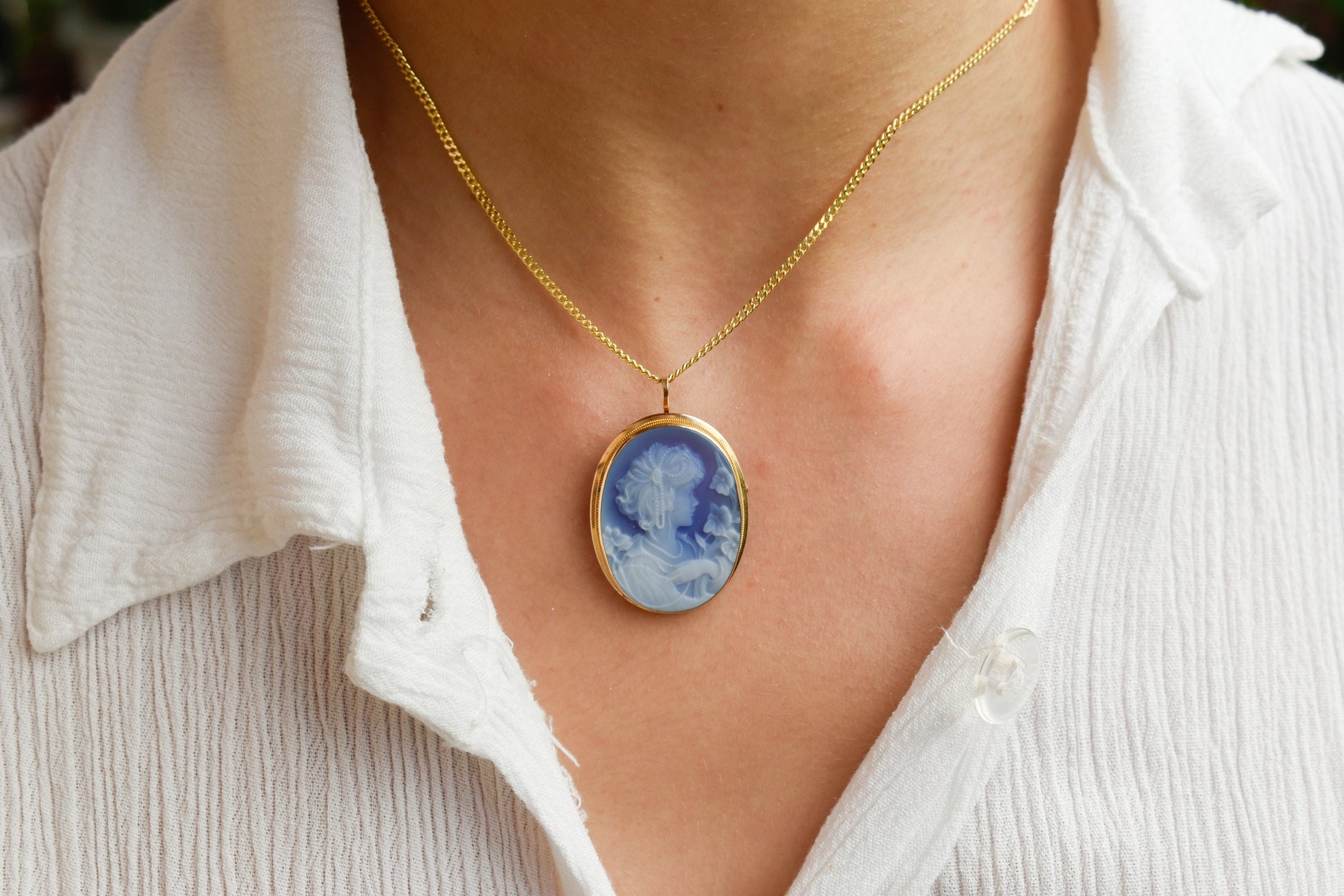 Ένα εντυπωσιακό χρυσό καμέο 14 καρατίων με χειροποίητο όστρακο σε μπλε χρώμα, μεγαλύτερο σε μέγεθος από τα κλασικά καμέο και ιδανικό για όσους θέλουν ένα πιο statement κόσμημα. Το ανάγλυφο προφίλ δίνει μια αίσθηση κλασικής τέχνης και vintage κομψότητας, ενώ το χρυσό πλαίσιο τονίζει υπέροχα το μπλε φόντο του καμέο. ✨