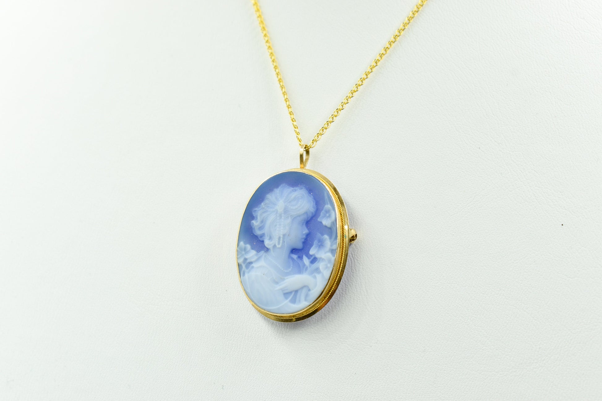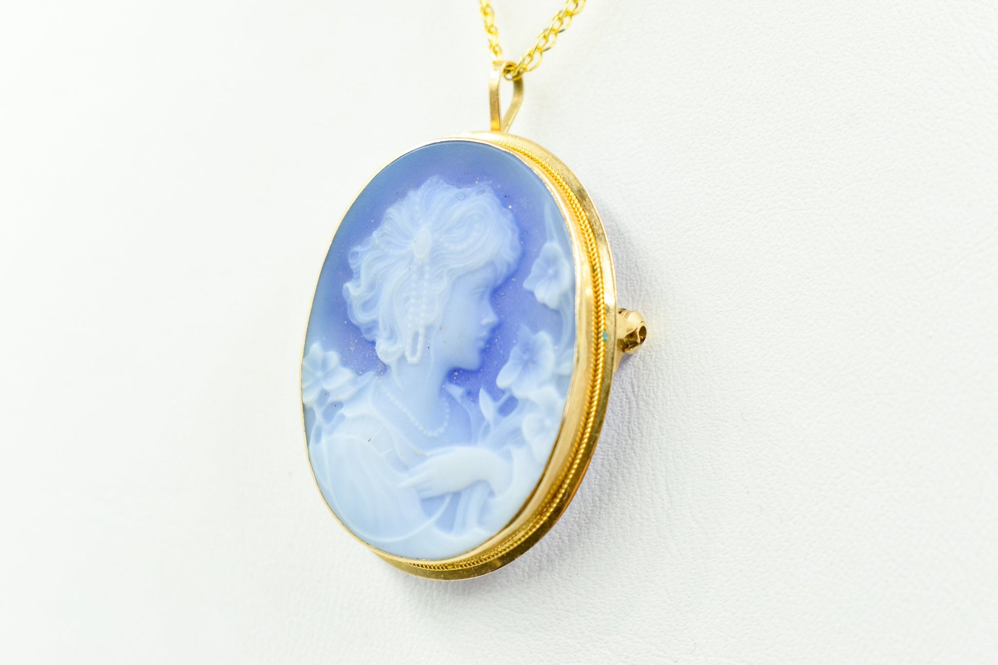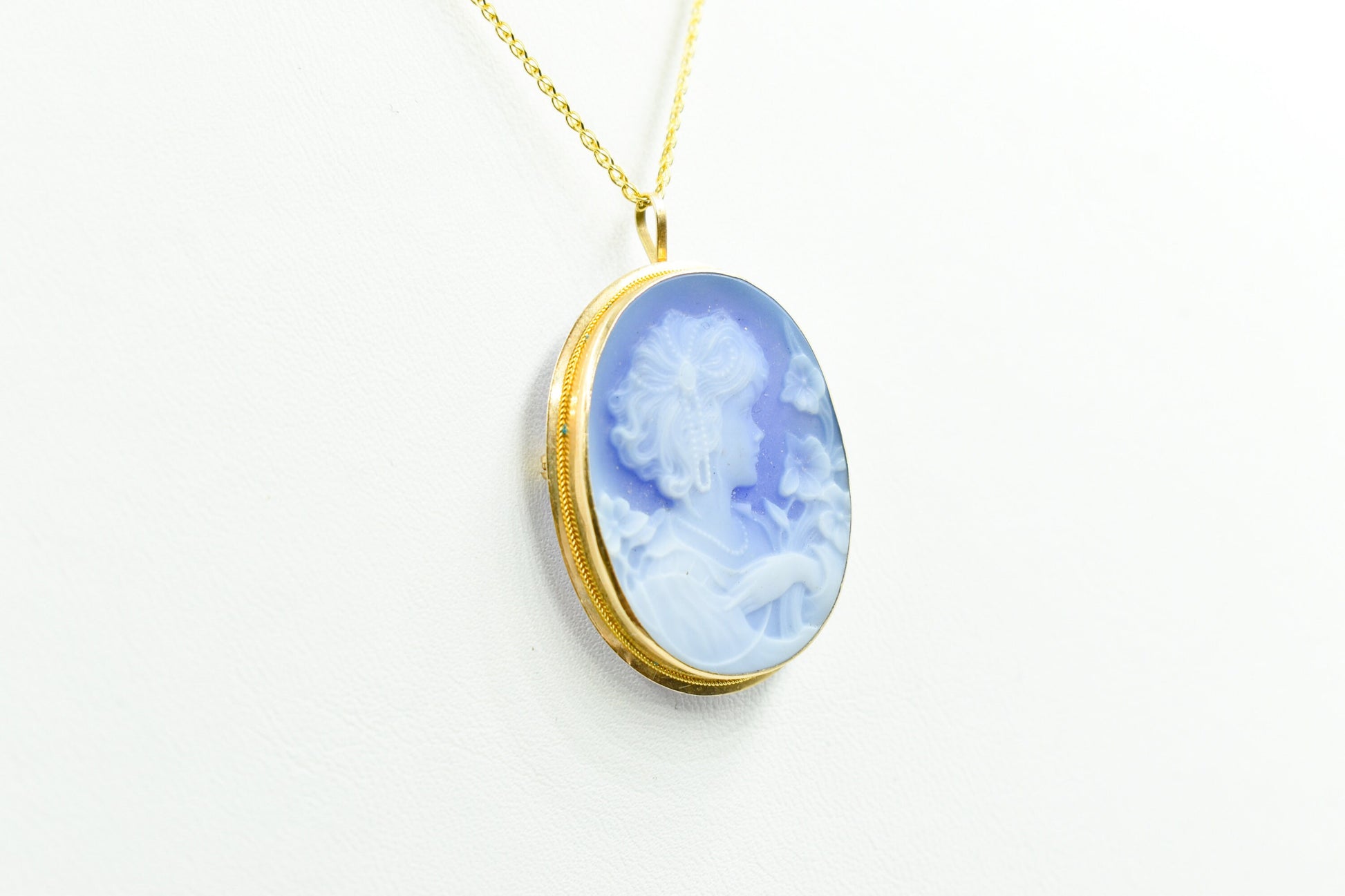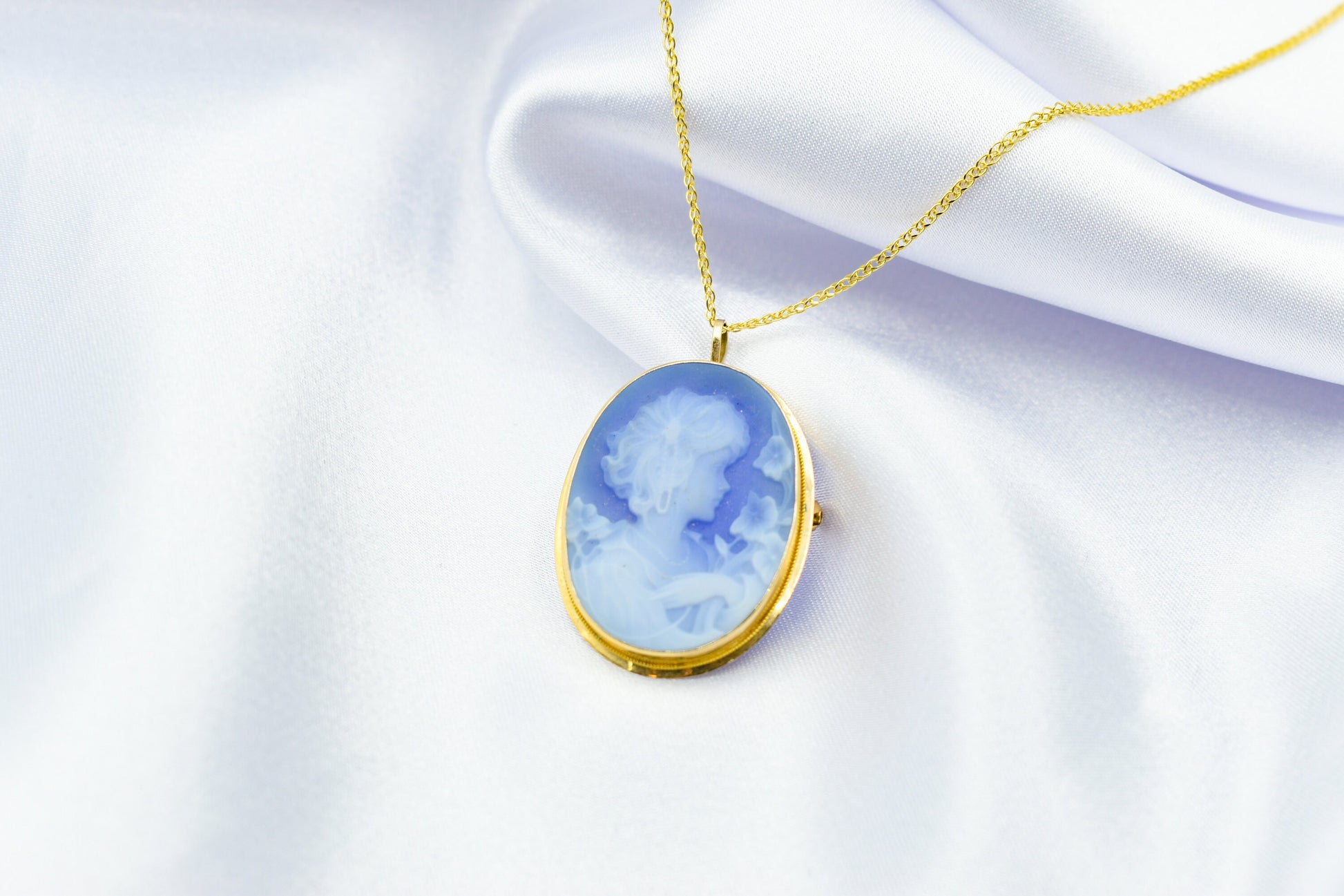 Ένα εντυπωσιακό χρυσό καμέο 14 καρατίων με χειροποίητο όστρακο σε μπλε χρώμα, μεγαλύτερο σε μέγεθος από τα κλασικά καμέο και ιδανικό για όσους θέλουν ένα πιο statement κόσμημα. Το ανάγλυφο προφίλ δίνει μια αίσθηση κλασικής τέχνης και vintage κομψότητας, ενώ το χρυσό πλαίσιο τονίζει υπέροχα το μπλε φόντο του καμέο. ✨
