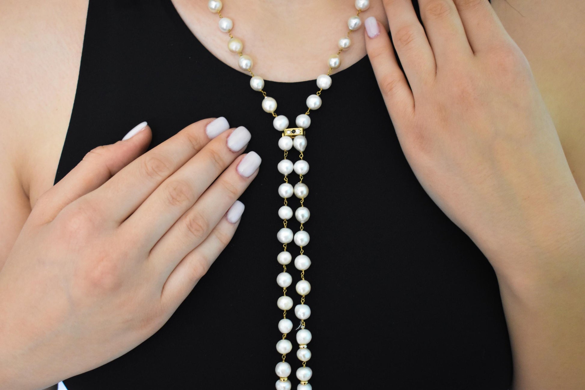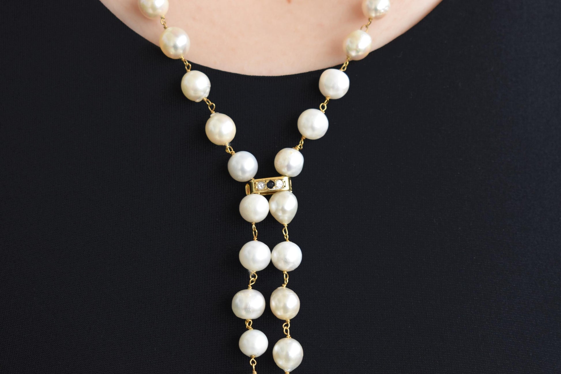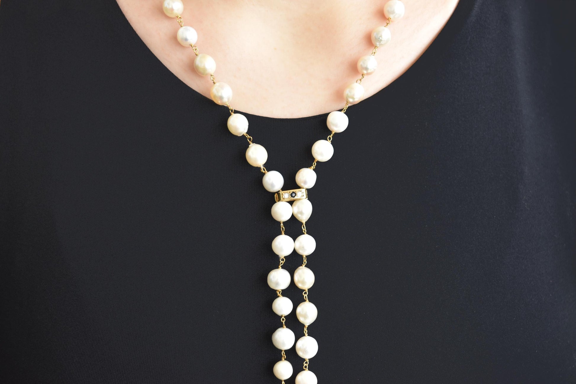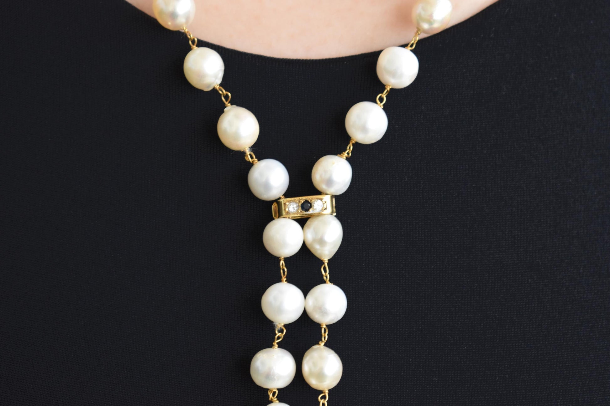 Μακρύ κολιέ από φυσικά μαργαριτάρια σε ροζάριο δέσιμο, με χρυσό κούμπωμα Κ14 το οποίο φέρει δύο λαμπερά μπριγιάν και ένα ορυκτό ζαφείρι στο κέντρο. Τα τελειώματα αποτελούνται από μικρές μαργαριταρένιες φούντες, προσθέτοντας κίνηση και κομψότητα σε κάθε εμφάνιση.