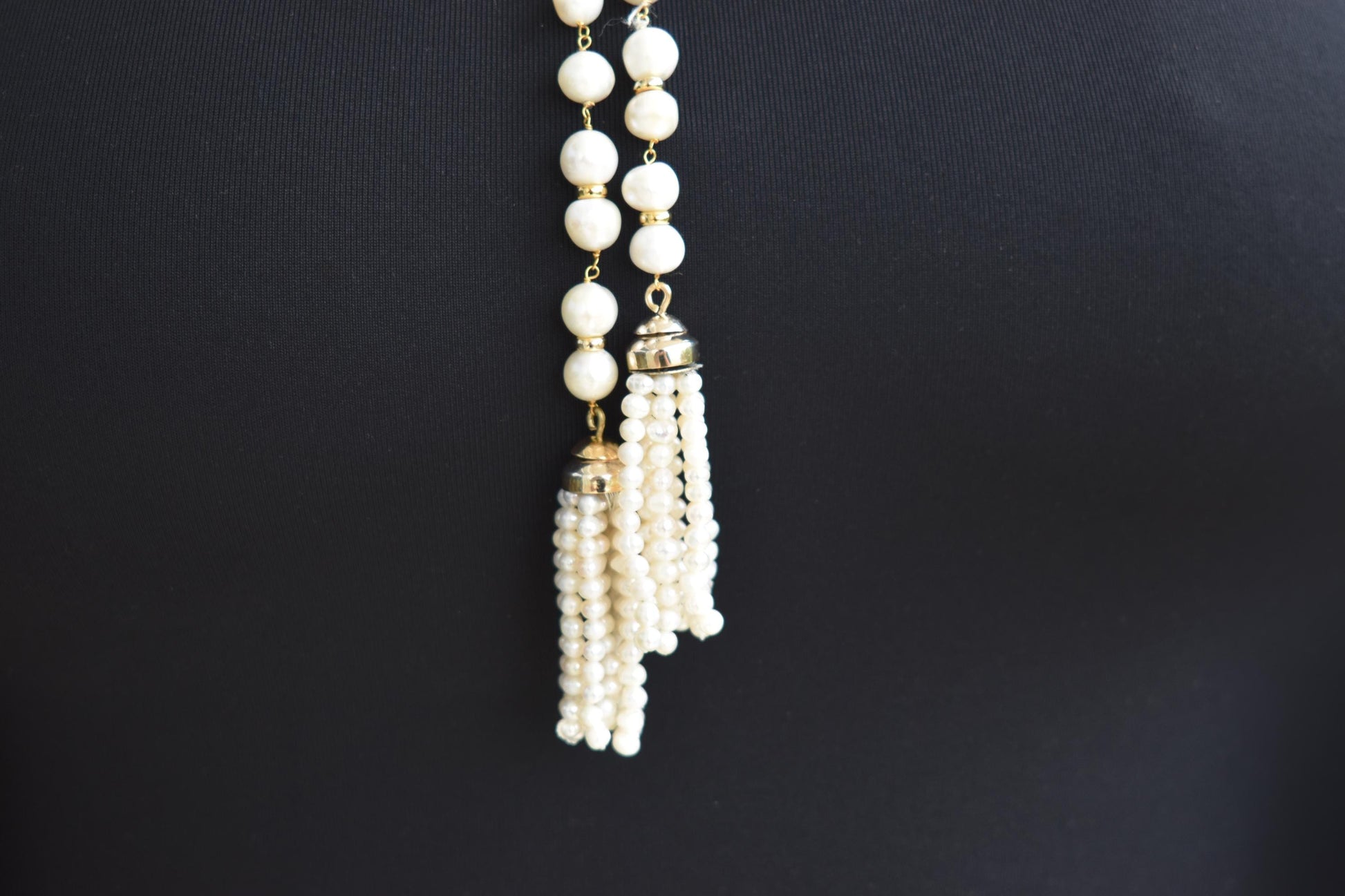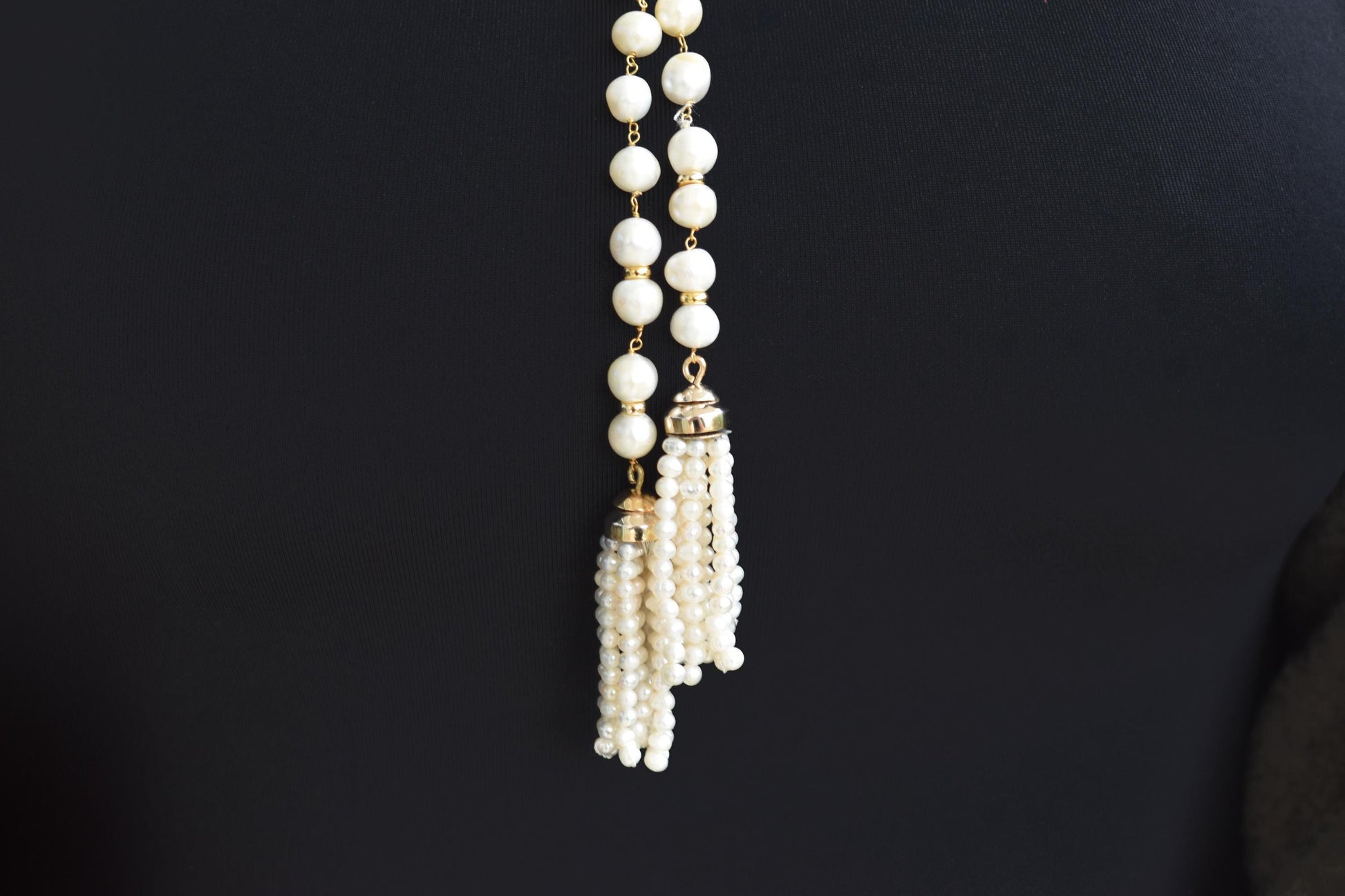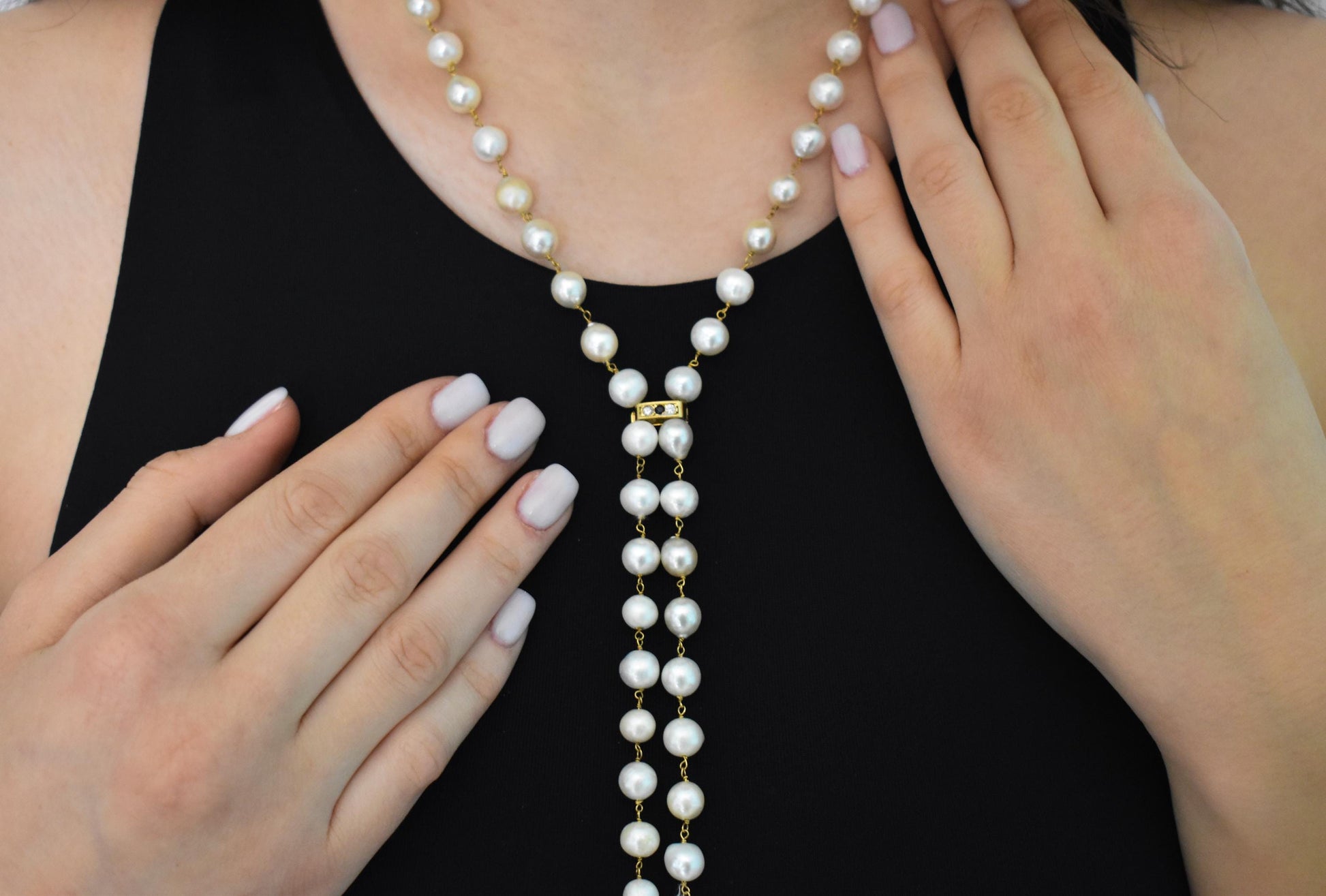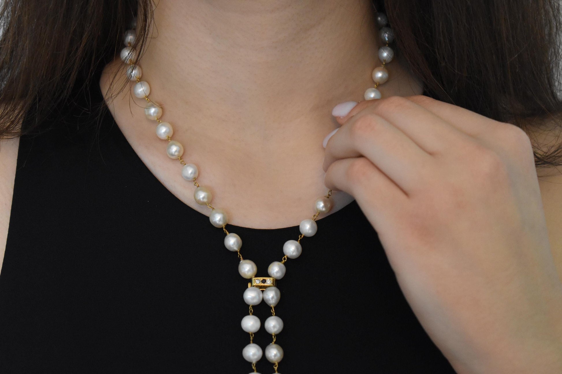 Μακρύ κολιέ από φυσικά μαργαριτάρια σε ροζάριο δέσιμο, με χρυσό κούμπωμα Κ14 το οποίο φέρει δύο λαμπερά μπριγιάν και ένα ορυκτό ζαφείρι στο κέντρο. Τα τελειώματα αποτελούνται από μικρές μαργαριταρένιες φούντες, προσθέτοντας κίνηση και κομψότητα σε κάθε εμφάνιση.