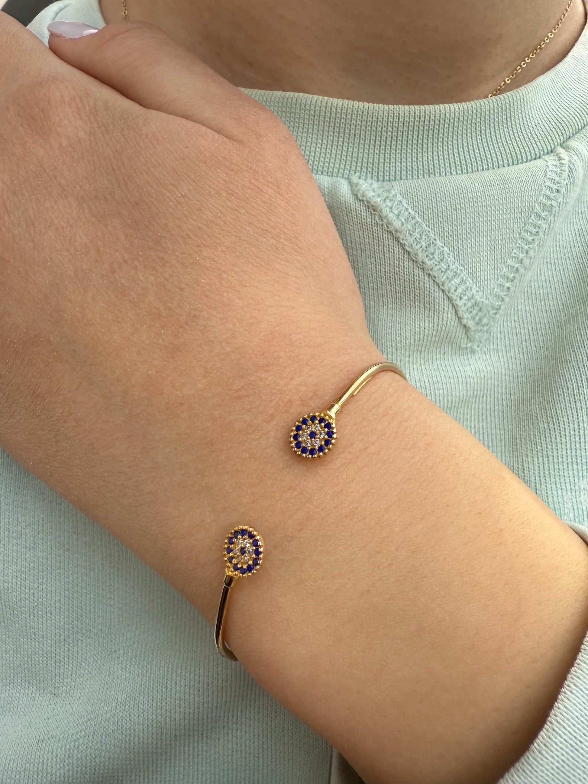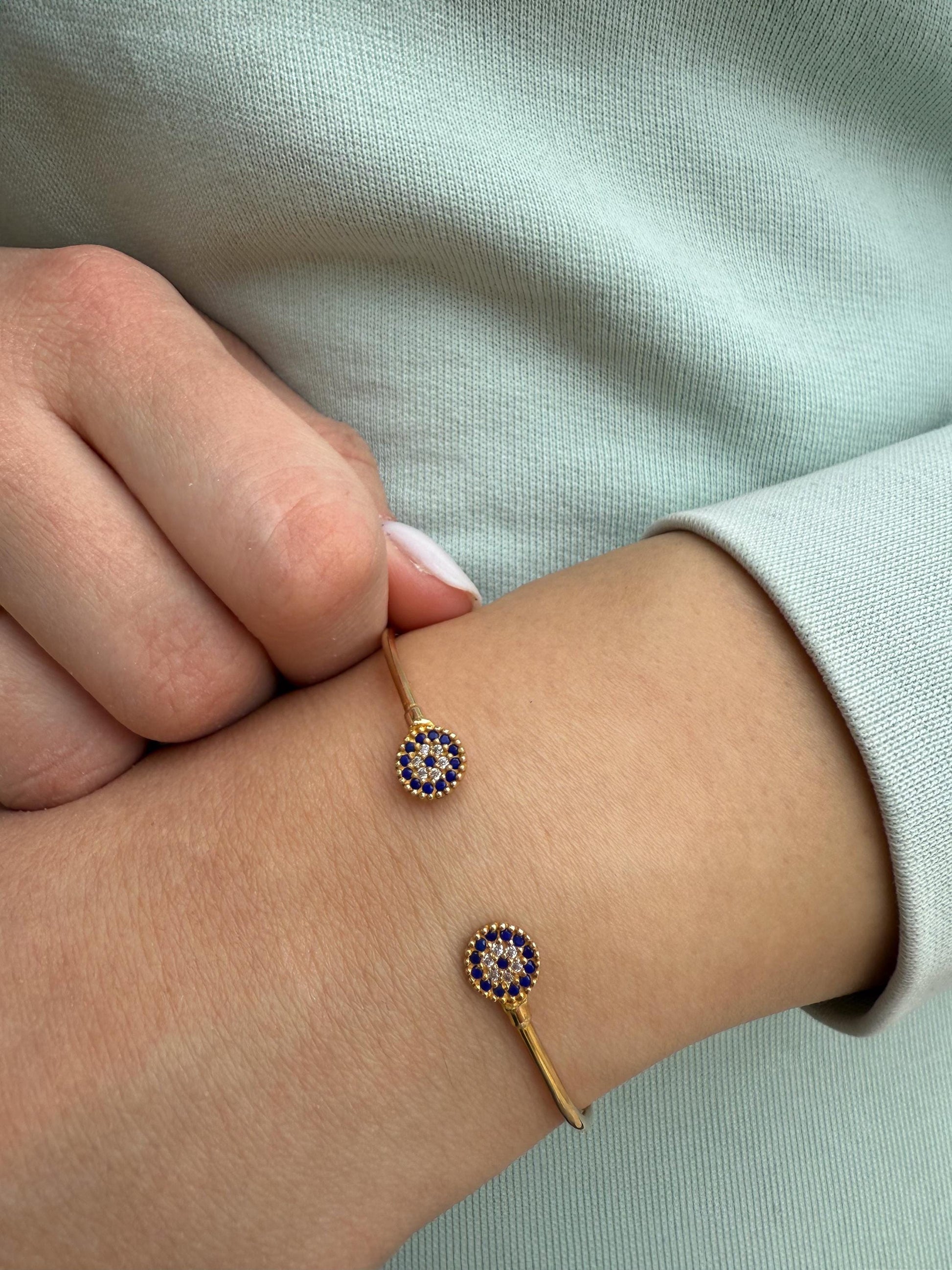 The foundation of the "Eye of Elegance" bracelet is meticulously handcrafted from solid 14-karat gold, ensuring both opulence and enduring beauty. Designed without a closure, this open-style bracelet offers both comfort and style as it gracefully adorns your wrist.