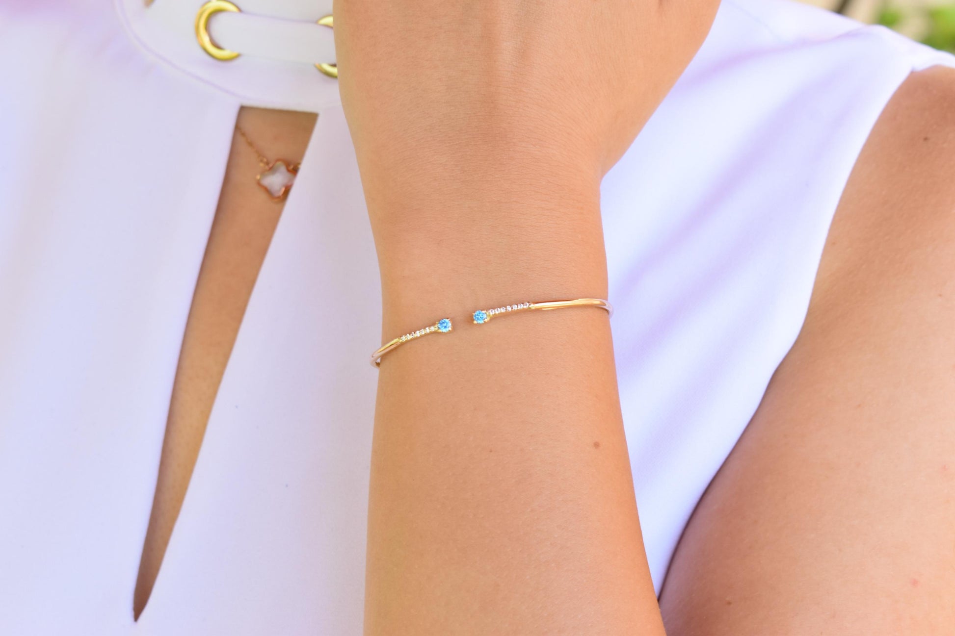 Introducing our exquisite 14K Gold Bar Bangle Bracelet, a stunning piece that combines modern design with classic elegance. This Dainty Gold Bangle Bracelet features two beautifully crafted bars facing each other, each adorned with sparkling zirconia that capture the light in an enchanting way. The two striking blue zircon stones add a unique touch, creating a mesmerizing effect that enhances the overall aesthetic.
