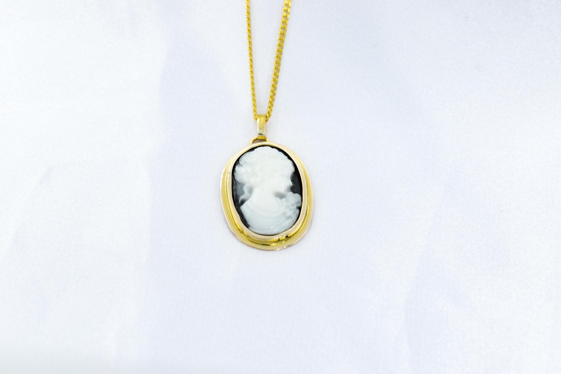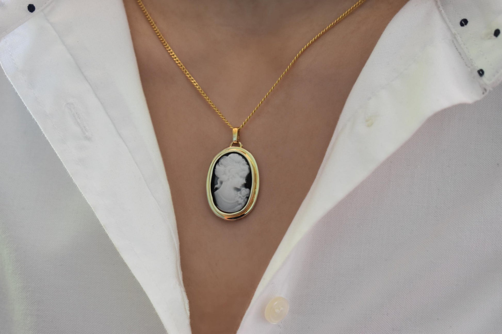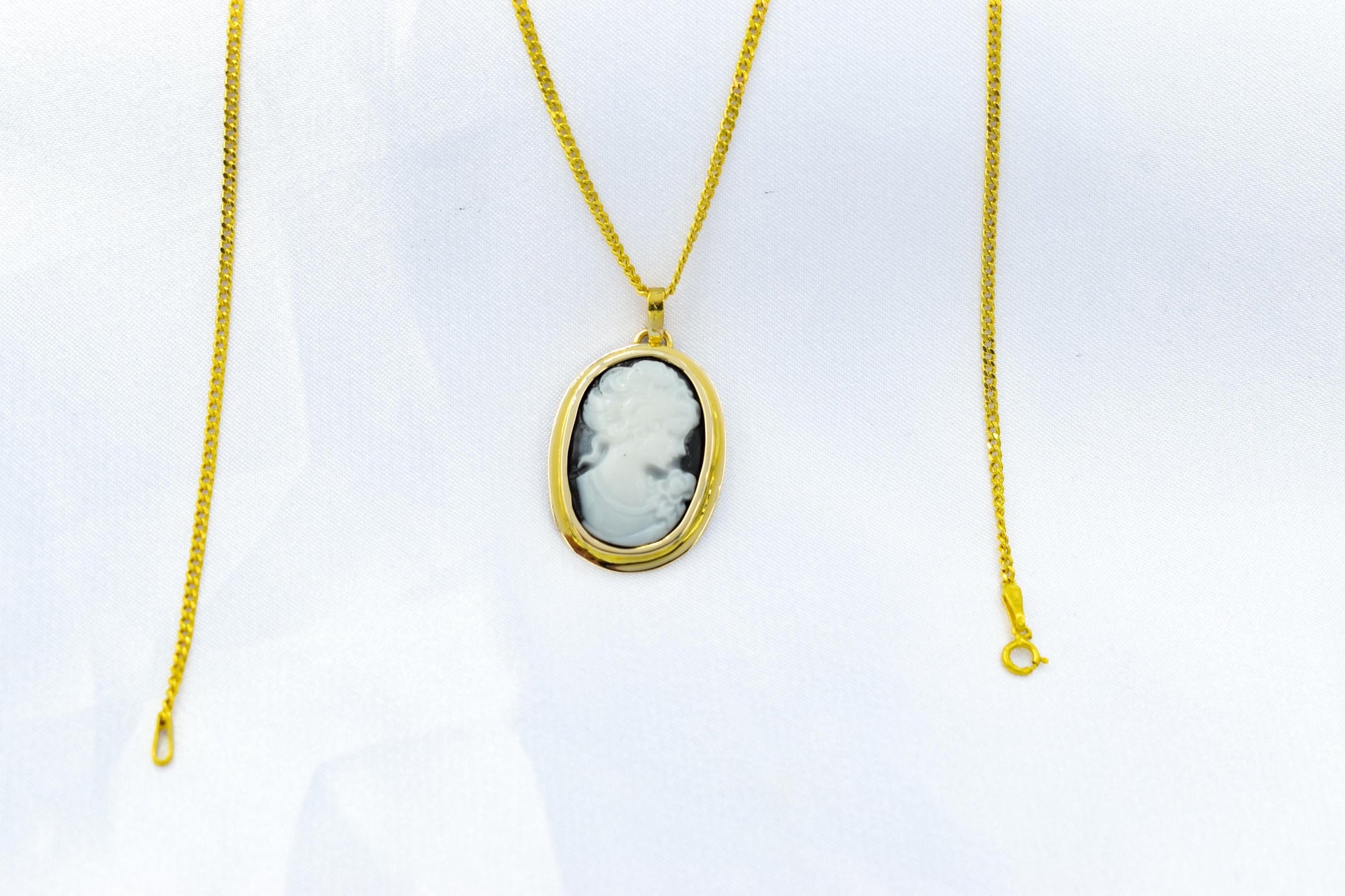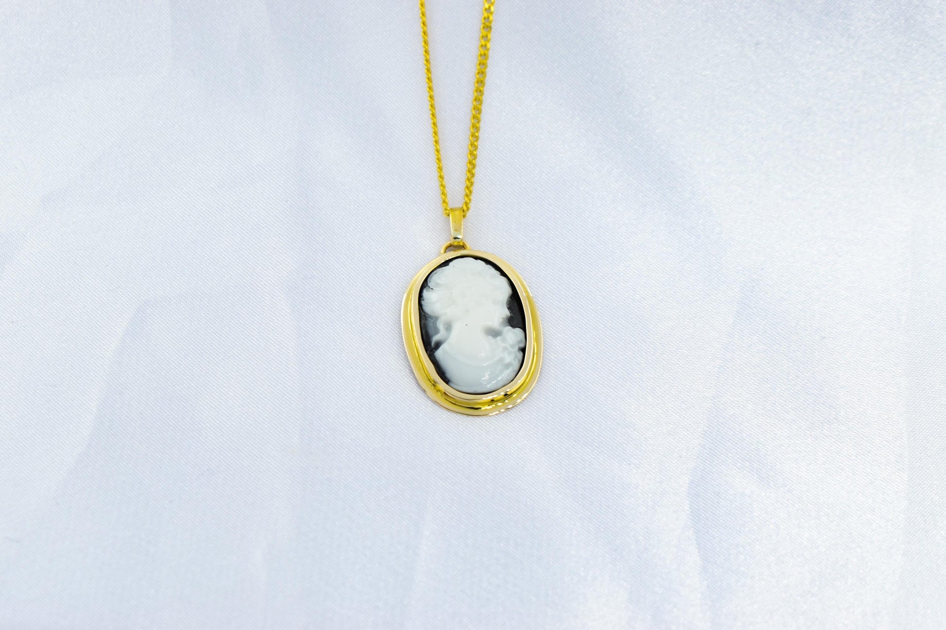 Εντυπωσιακό κρεμαστό καμέο από ρητίνη, διακοσμημένο με χρυσό 14 καρατίων. Το κλασικό ανάγλυφο πορτρέτο συνδυάζεται με μοντέρνο φινίρισμα, δημιουργώντας ένα κόσμημα που ξεχωρίζει χωρίς υπερβολές. Ιδανικό για γυναίκες που αγαπούν το vintage στιλ με σύγχρονη αισθητική. ✨