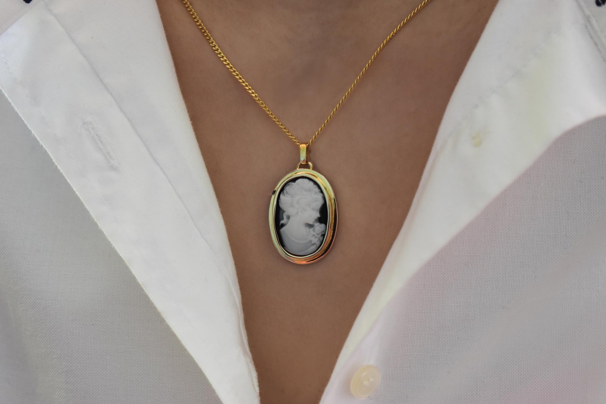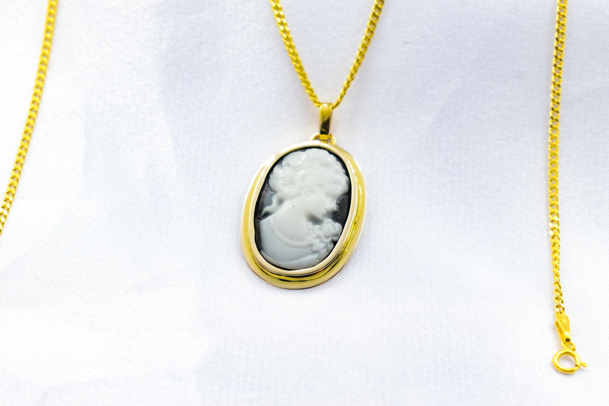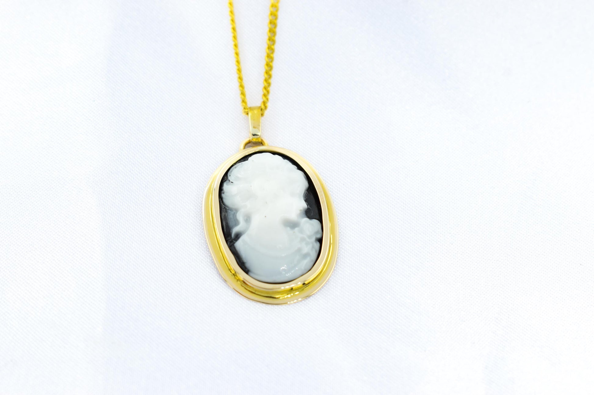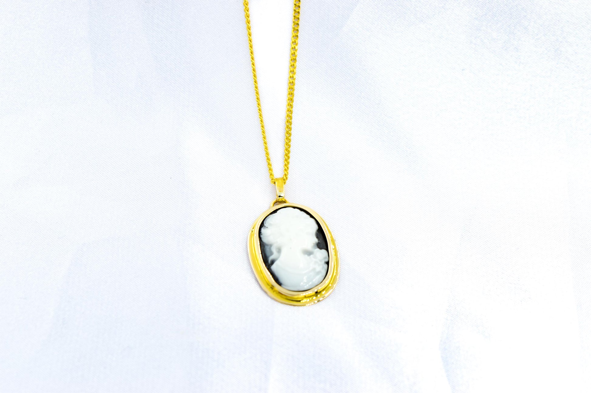 Εντυπωσιακό κρεμαστό καμέο από ρητίνη, διακοσμημένο με χρυσό 14 καρατίων. Το κλασικό ανάγλυφο πορτρέτο συνδυάζεται με μοντέρνο φινίρισμα, δημιουργώντας ένα κόσμημα που ξεχωρίζει χωρίς υπερβολές. Ιδανικό για γυναίκες που αγαπούν το vintage στιλ με σύγχρονη αισθητική. ✨
