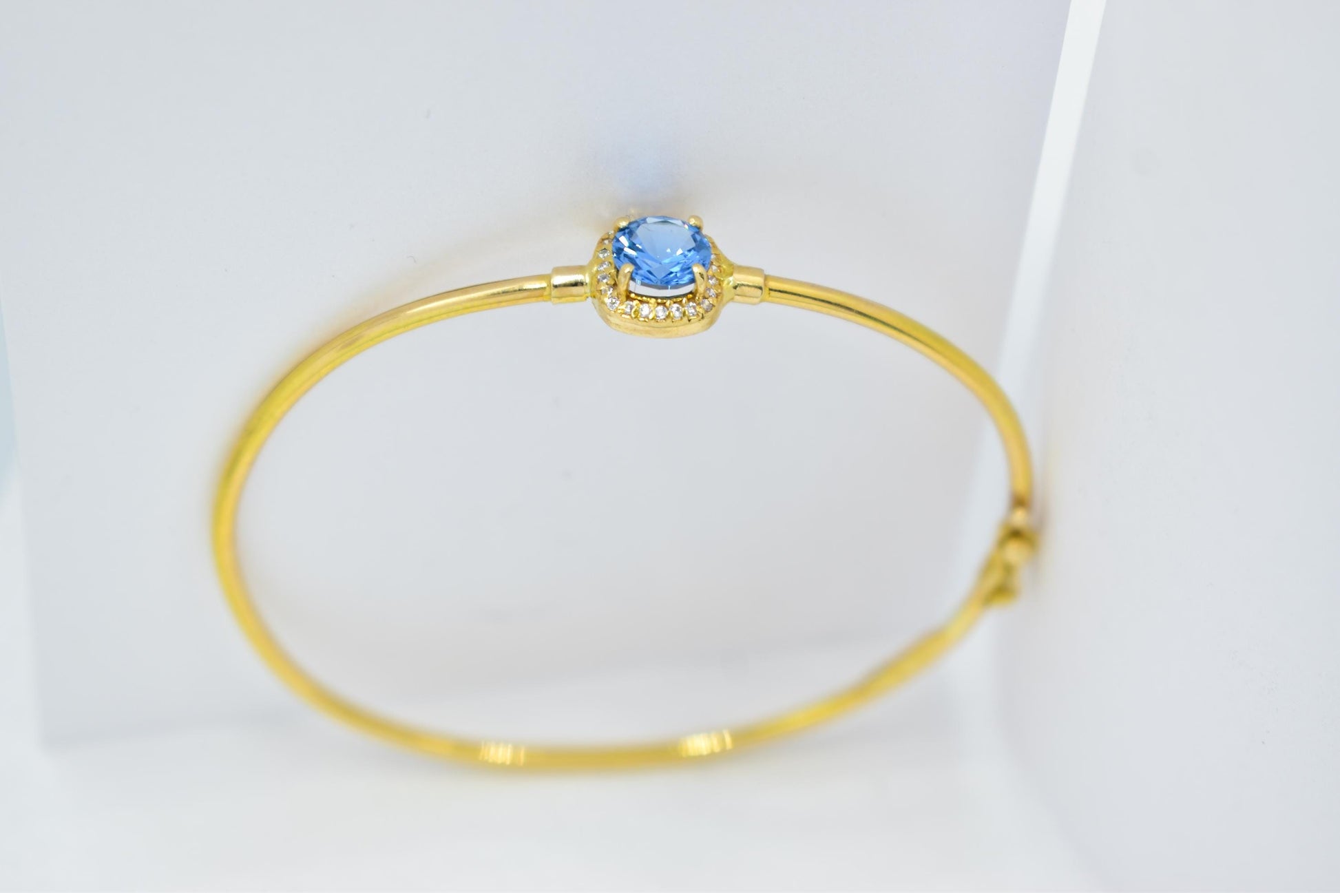 Discover timeless elegance with our handcrafted 14K yellow gold bangle featuring a radiant blue zircon centerpiece surrounded by shimmering white zirconia stones. This delicate and refined bracelet is perfect for everyday wear or as a meaningful gift for someone special.