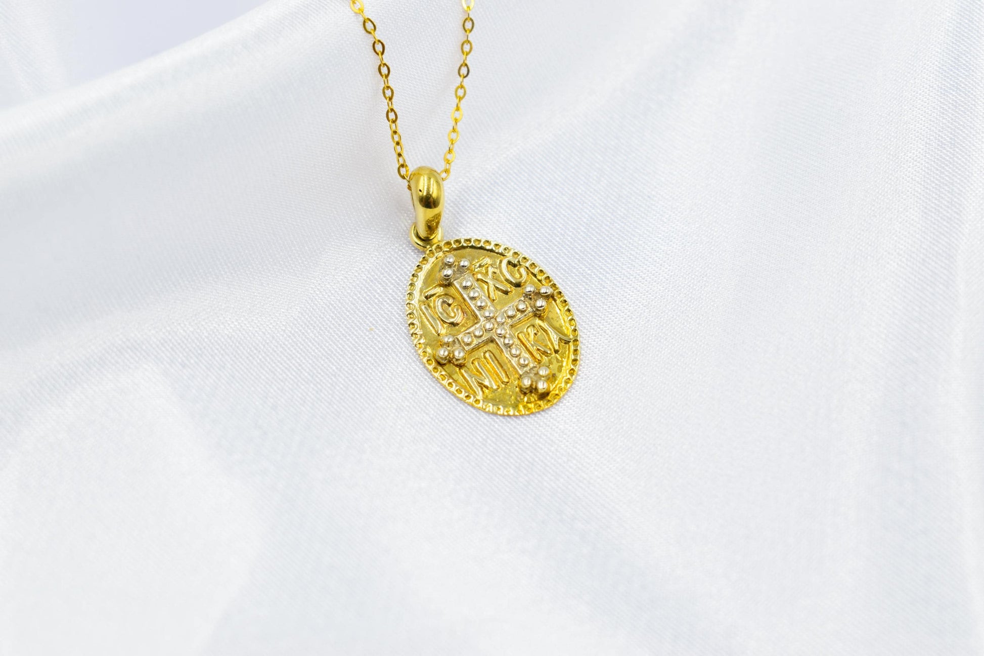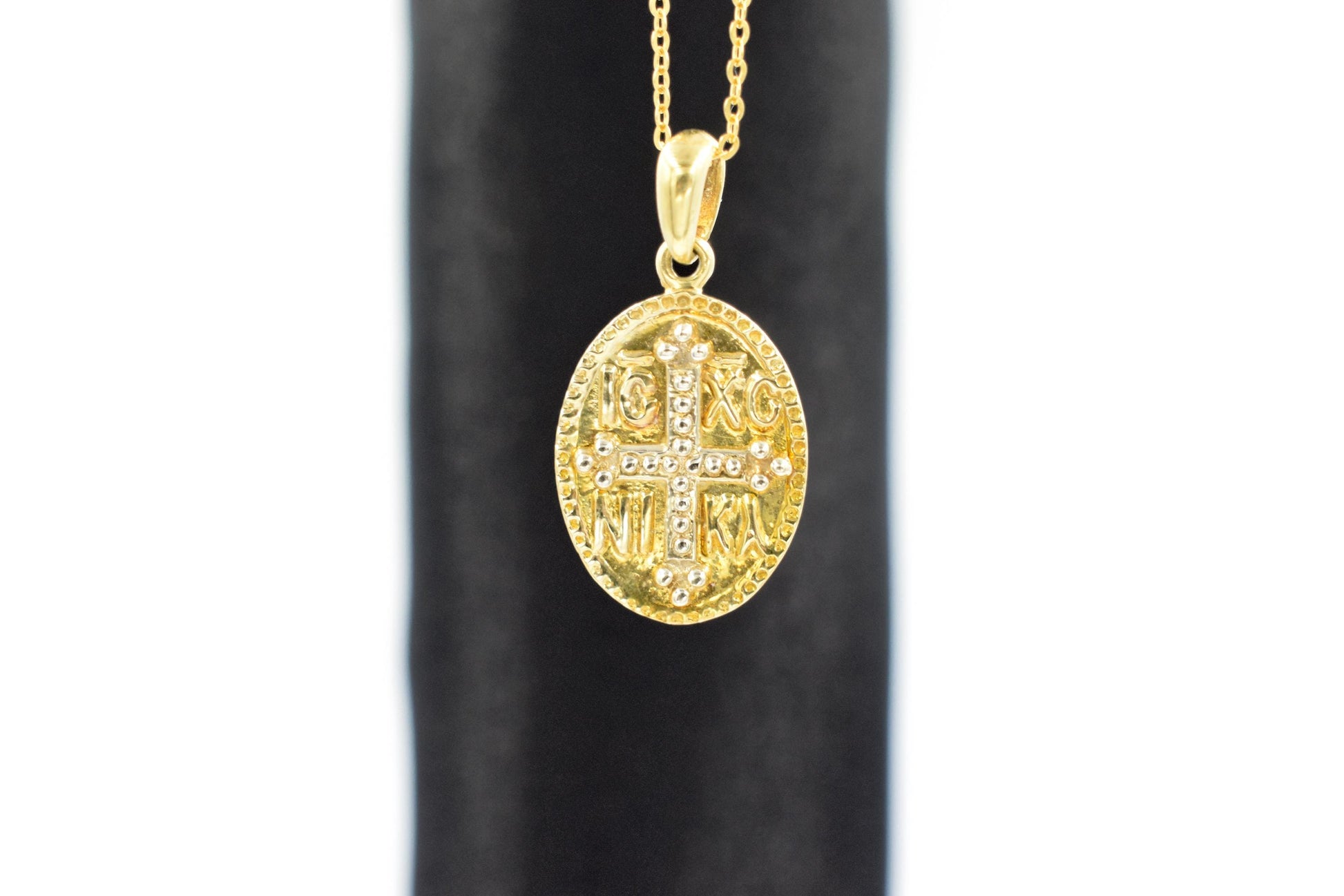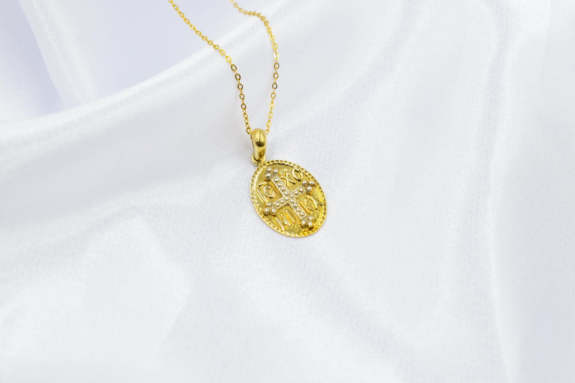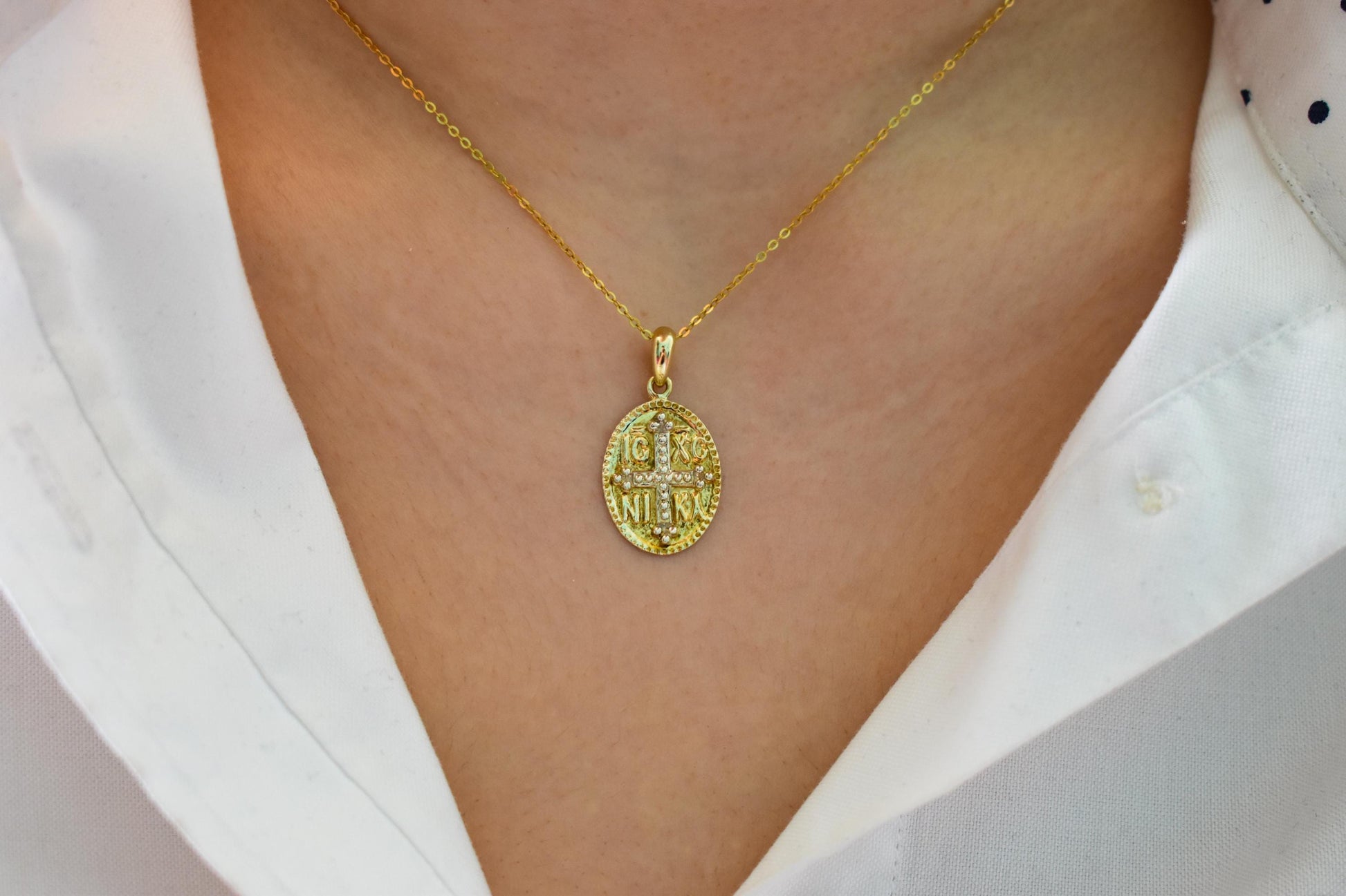 Κλασικό κωνσταντινάτο σε οβάλ σχήμα σε αυθεντικό χρυσό 14 καρατίων, με ανάγλυφη την ιερή επιγραφή ΙC XC NIKA και σταυρό στο κέντρο. Ένα διαχρονικό φυλαχτό που συνδυάζει πίστη, παράδοση και κομψότητα. ✨