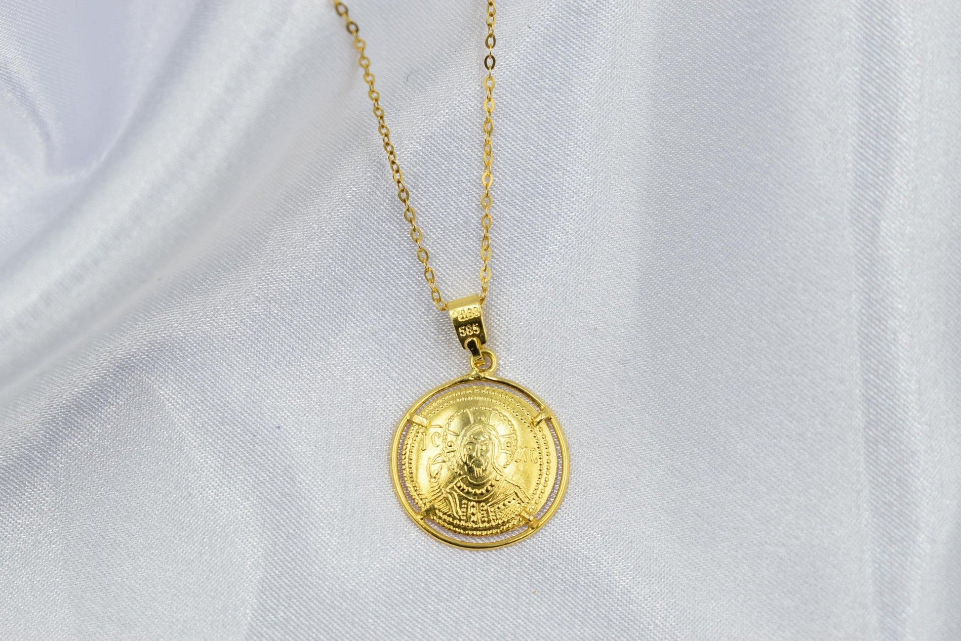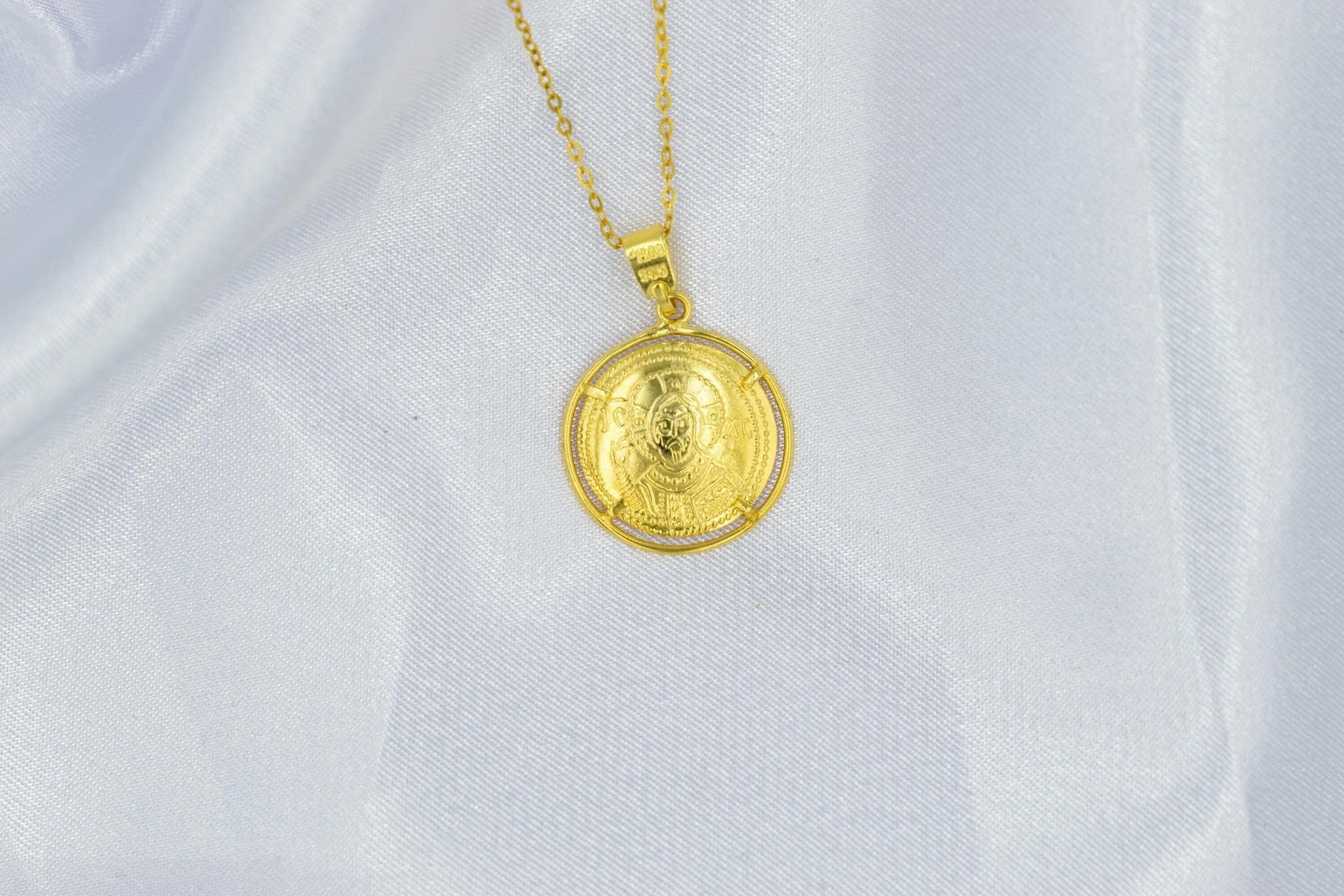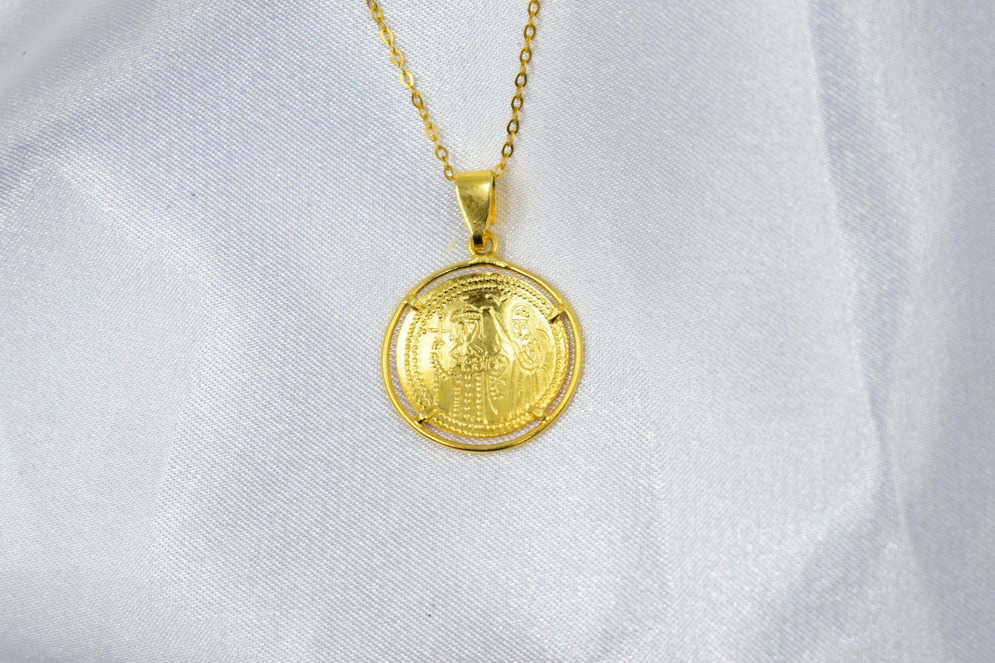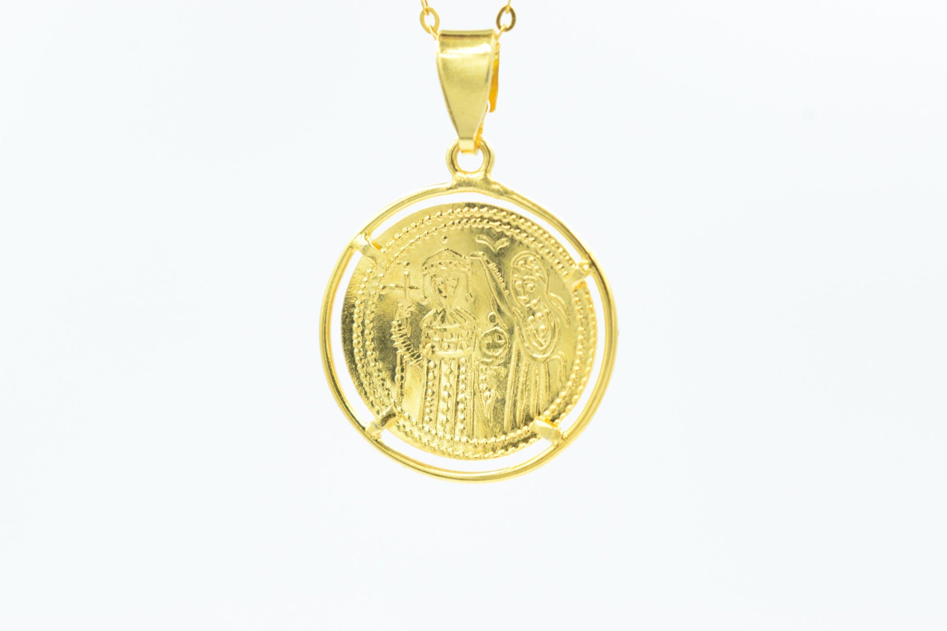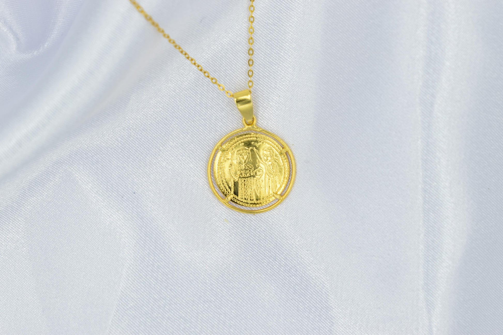 Κλασικό κωνσταντινάτο διπλής όψης από χρυσό 14 καρατίων, με λεπτοδουλεμένη βυζαντινή παράσταση και διαχρονική ιερή αξία. Φοριέται καθημερινά ή σε ιδιαίτερες στιγμές ως φυλαχτό προστασίας και πίστης. ✨