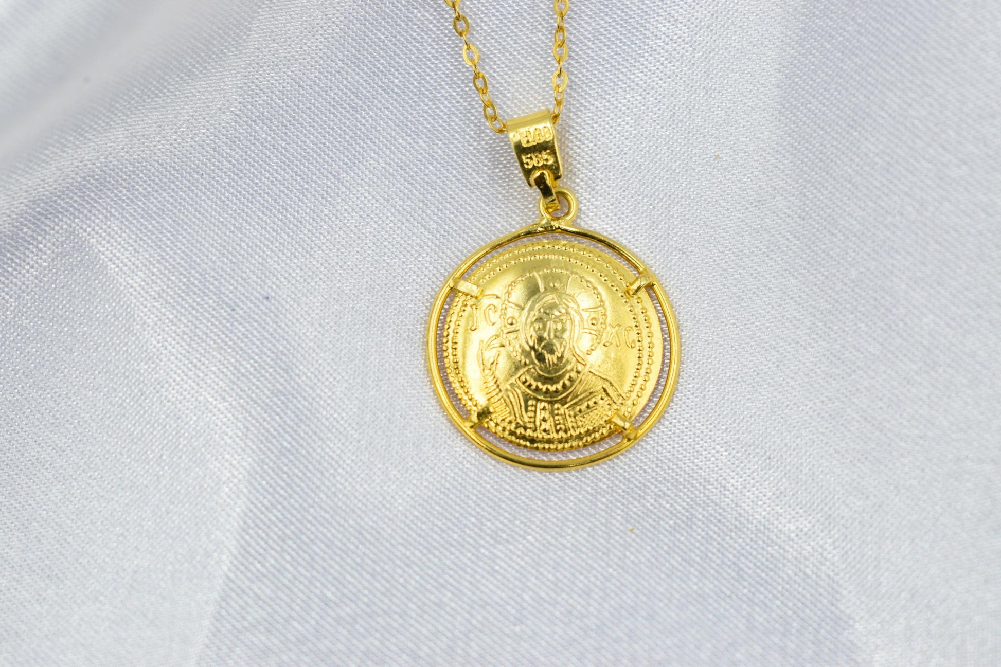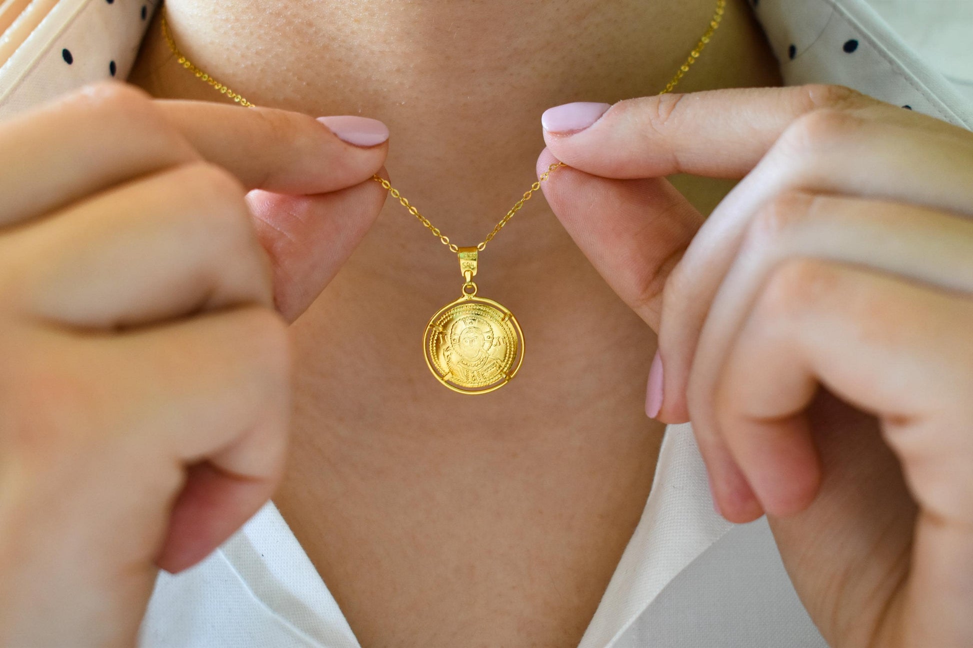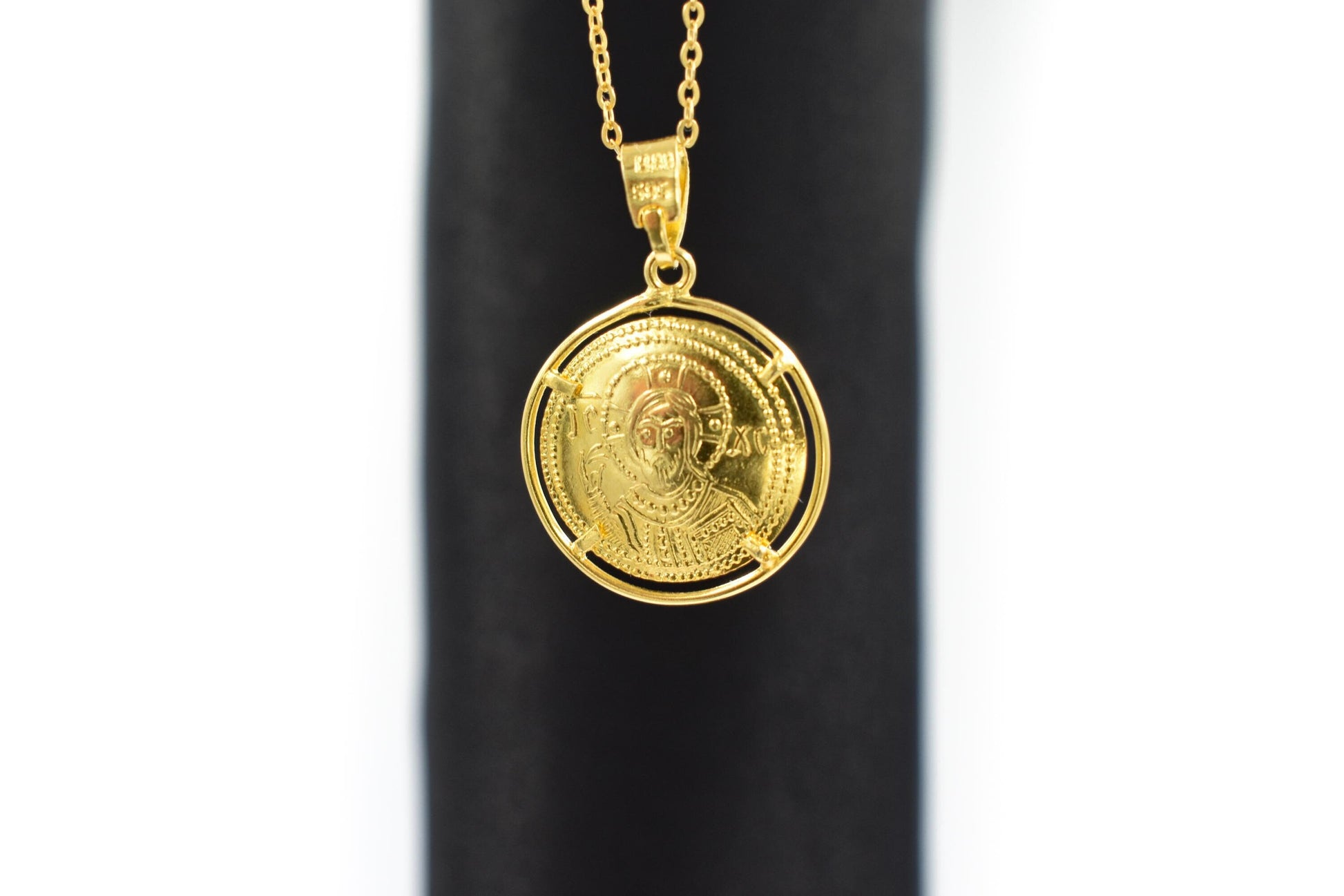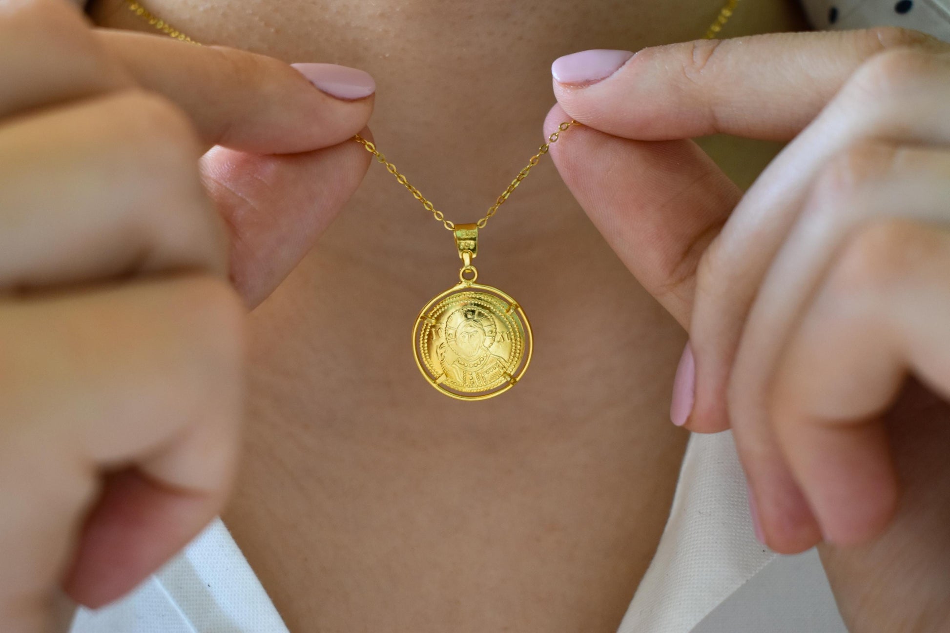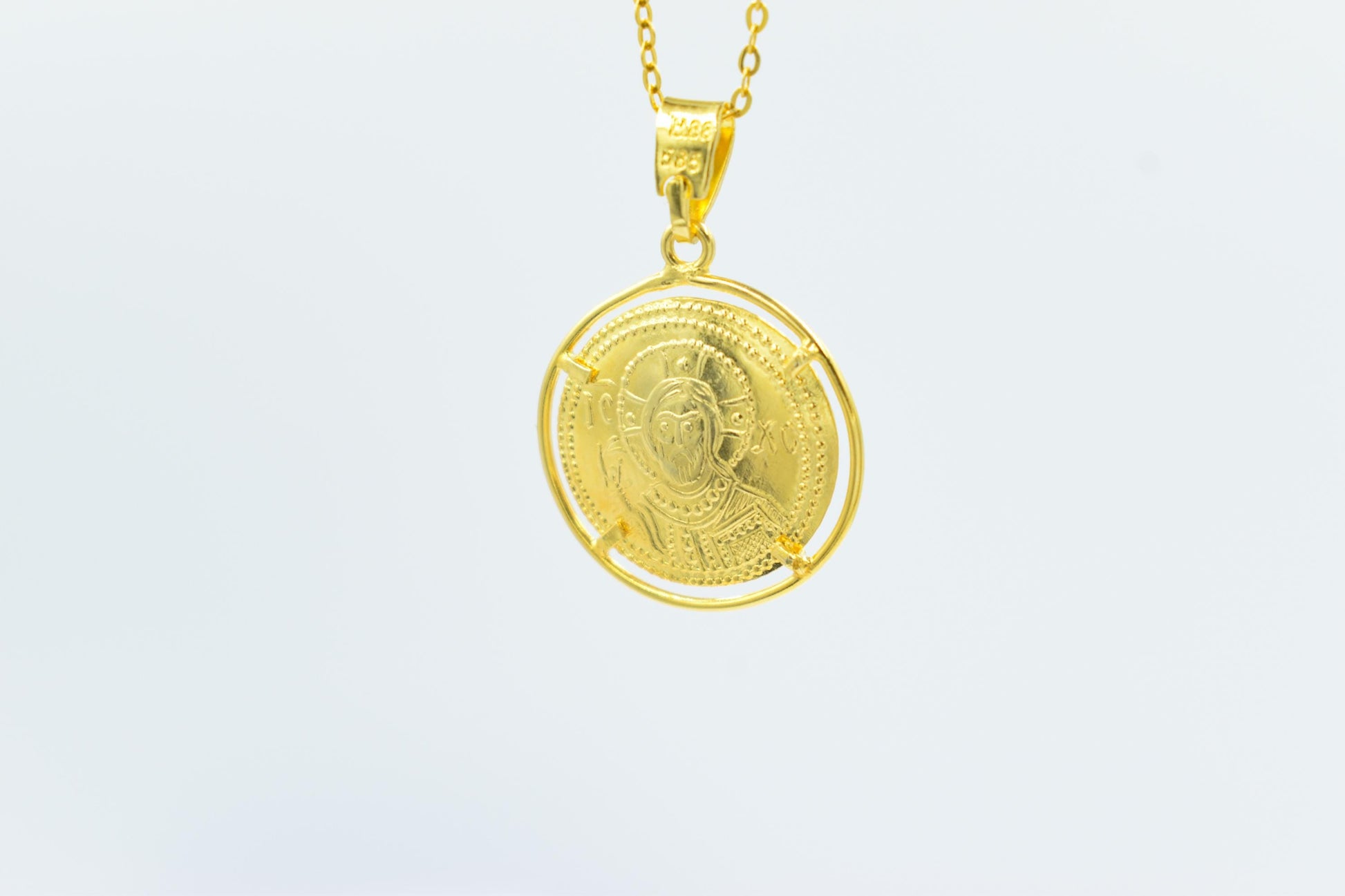 Κλασικό κωνσταντινάτο διπλής όψης από χρυσό 14 καρατίων, με λεπτοδουλεμένη βυζαντινή παράσταση και διαχρονική ιερή αξία. Φοριέται καθημερινά ή σε ιδιαίτερες στιγμές ως φυλαχτό προστασίας και πίστης. ✨