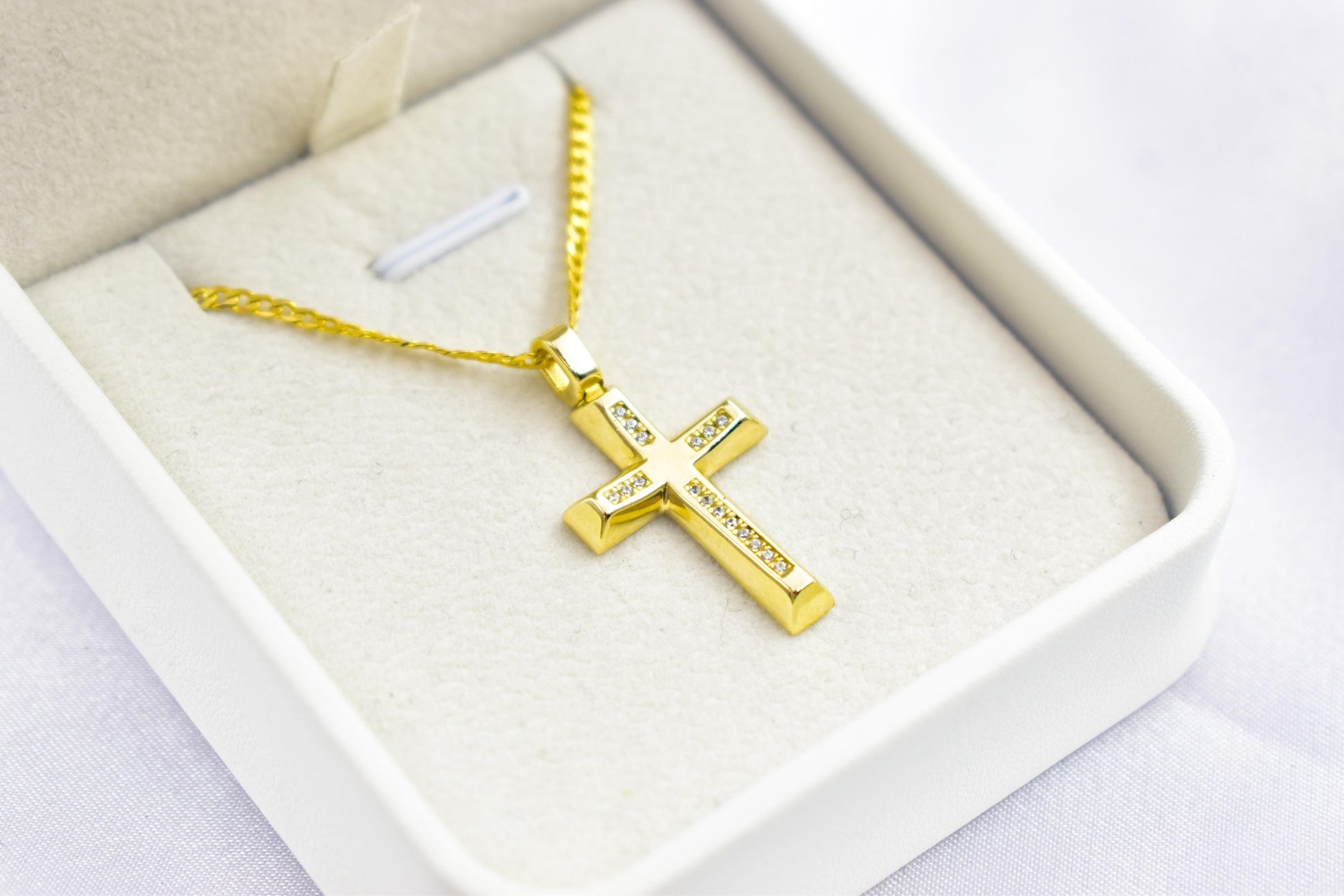 γυναικα 14K Gold Cross Pendant with Zircon Stones,Elegant Christian Necklace,Pendant Only, Complete Set with Chain,Women’s Men’s Cross,Baptism Gift