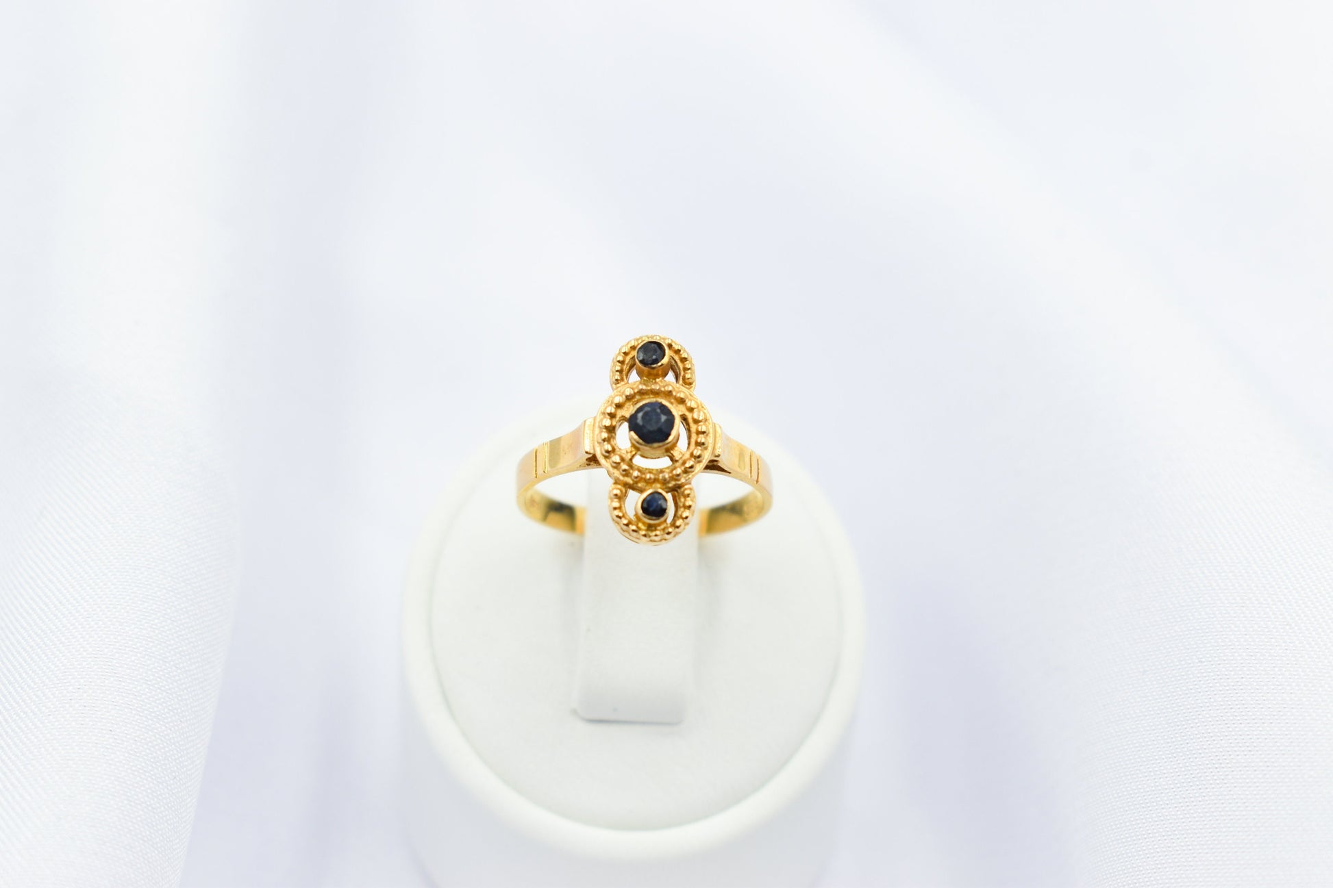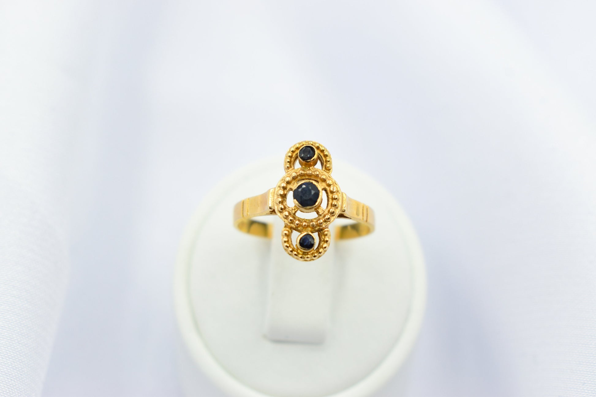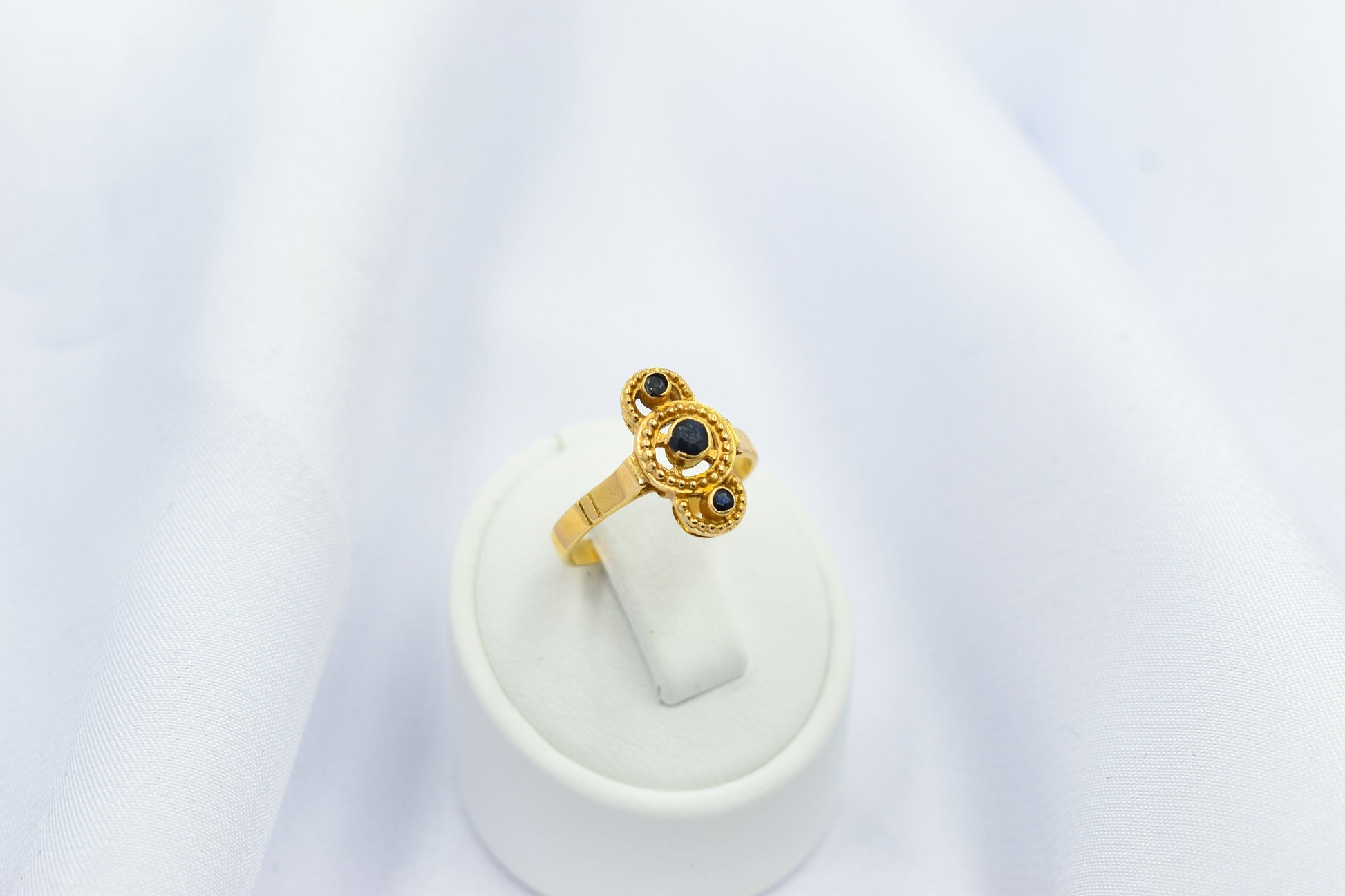 Step into the grandeur of Byzantine-inspired luxury with our exquisite 14-carat gold ring adorned with three mesmerizing blue zircons, elegantly aligned in a row. This stunning piece captures the essence of Byzantine opulence, boasting intricate detailing and regal motifs reminiscent of ancient architectural marvels.