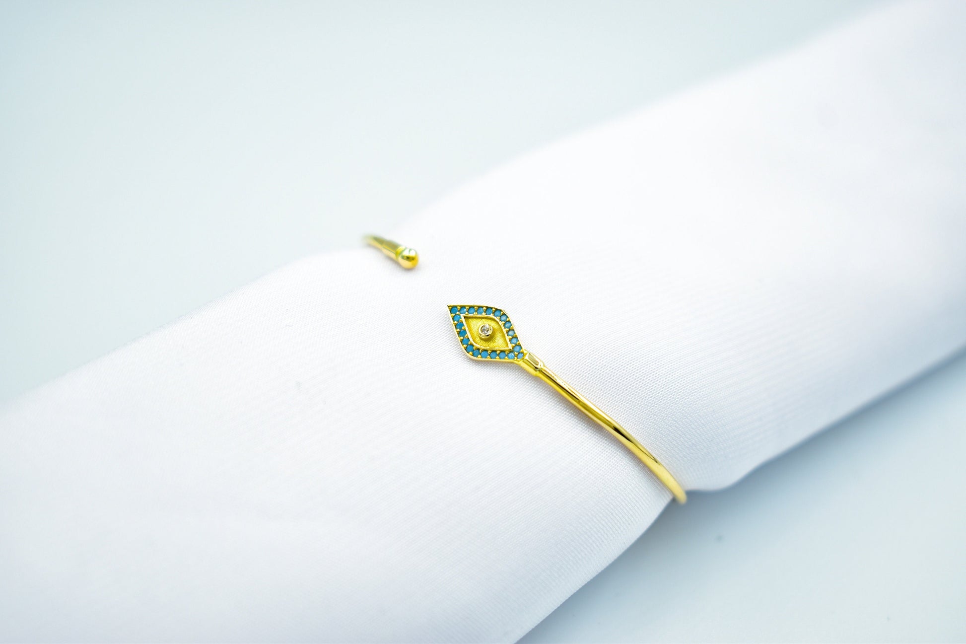 Whether you wear it as a statement piece or as a symbol of protection and beauty, our Gold Bracelet with the Captivating Turquoise Eye is a true embodiment of timeless elegance and charm. It's the perfect addition to your jewelry collection, radiating a sense of grace and mystique with every glance.