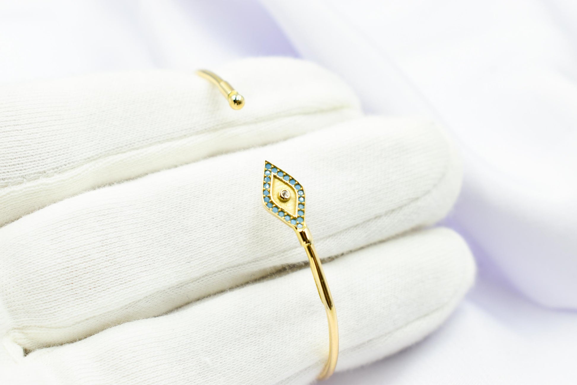 14K Gold Evil Eye Bracelet Turquoise,14K Protective Jewelry,14k Gold Bangle Bracelet,Diamond Dainty Gold Bracelet,Gift for Mom or Her