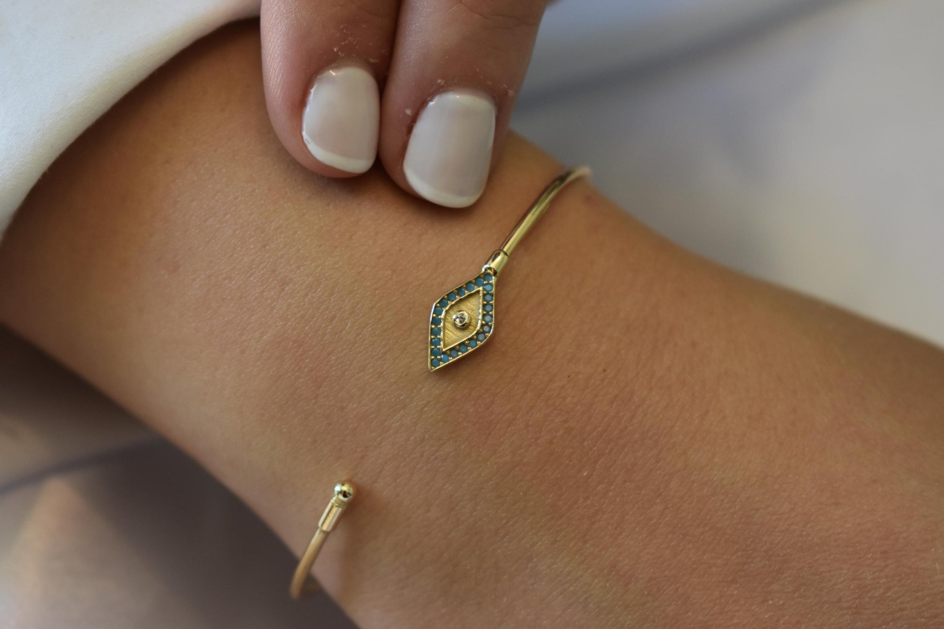 Indulge in the enchantment of this unique bracelet, where 14-karat gold and the captivating turquoise eye come together to create a piece that celebrates beauty, protection, and the power of symbolism.