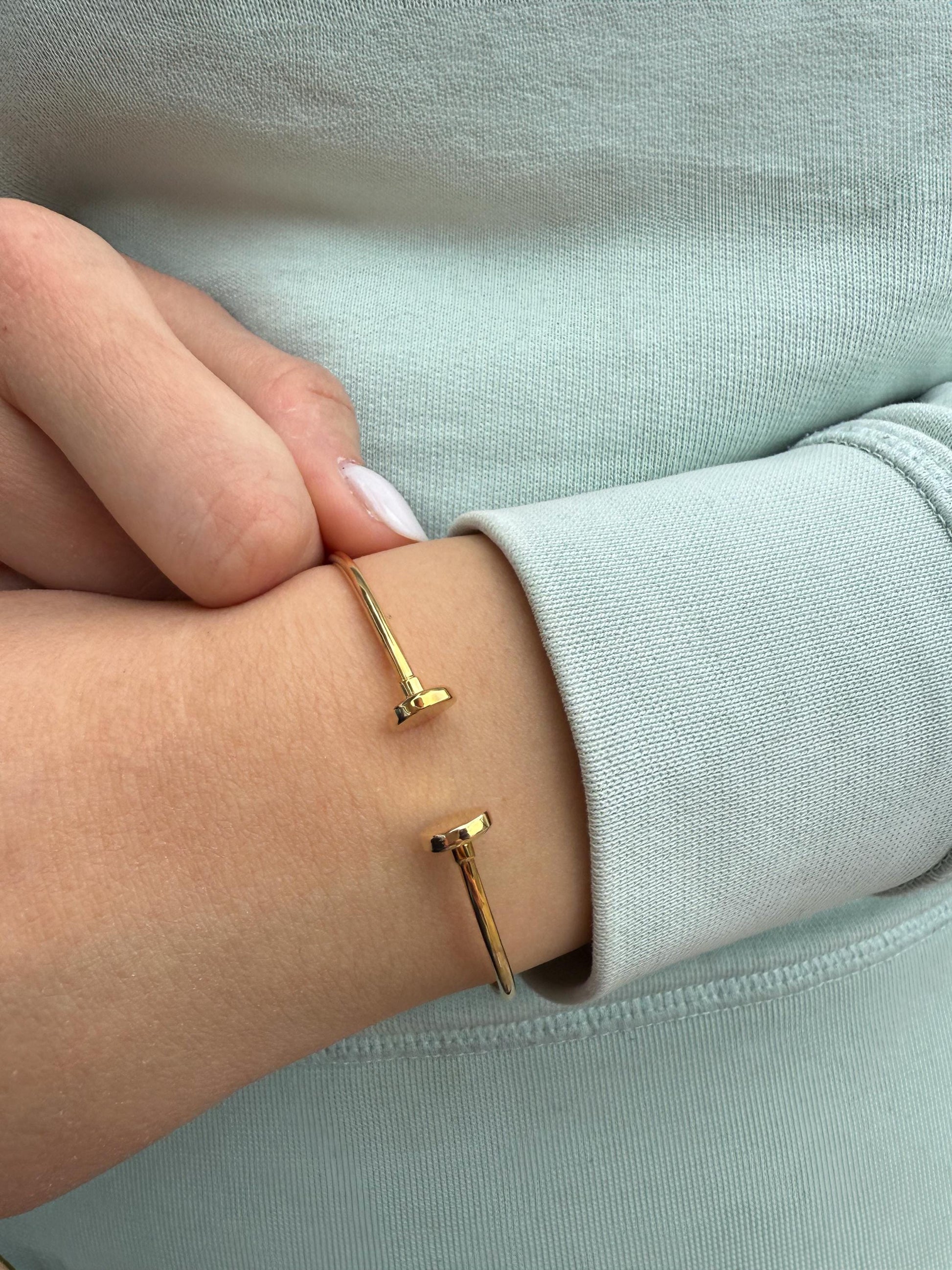 With its clean lines and smooth finish, this minimalist bangle offers a versatile design that can be worn alone for a sleek, refined look or stacked with other bracelets for a more layered, trendy appearance. Its timeless appeal makes it perfect for daily wear or special occasions, seamlessly transitioning from one to the other with effortless style.