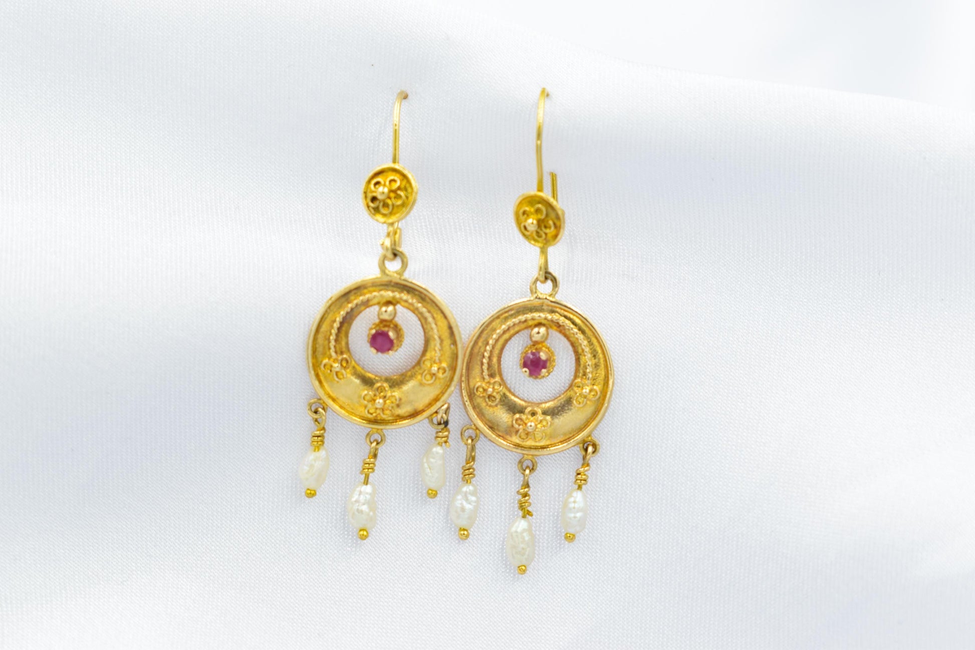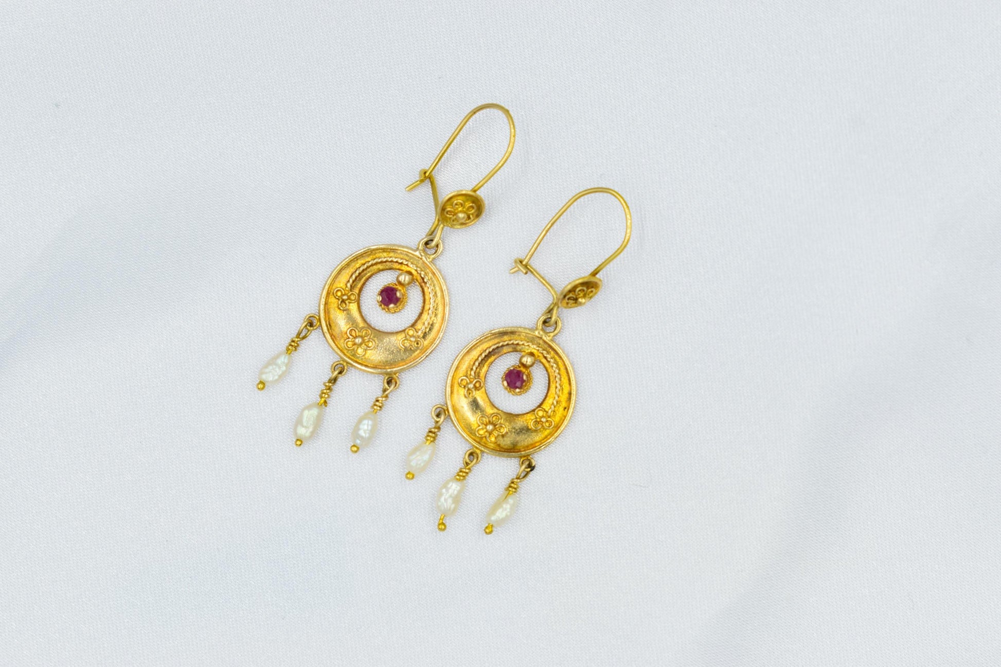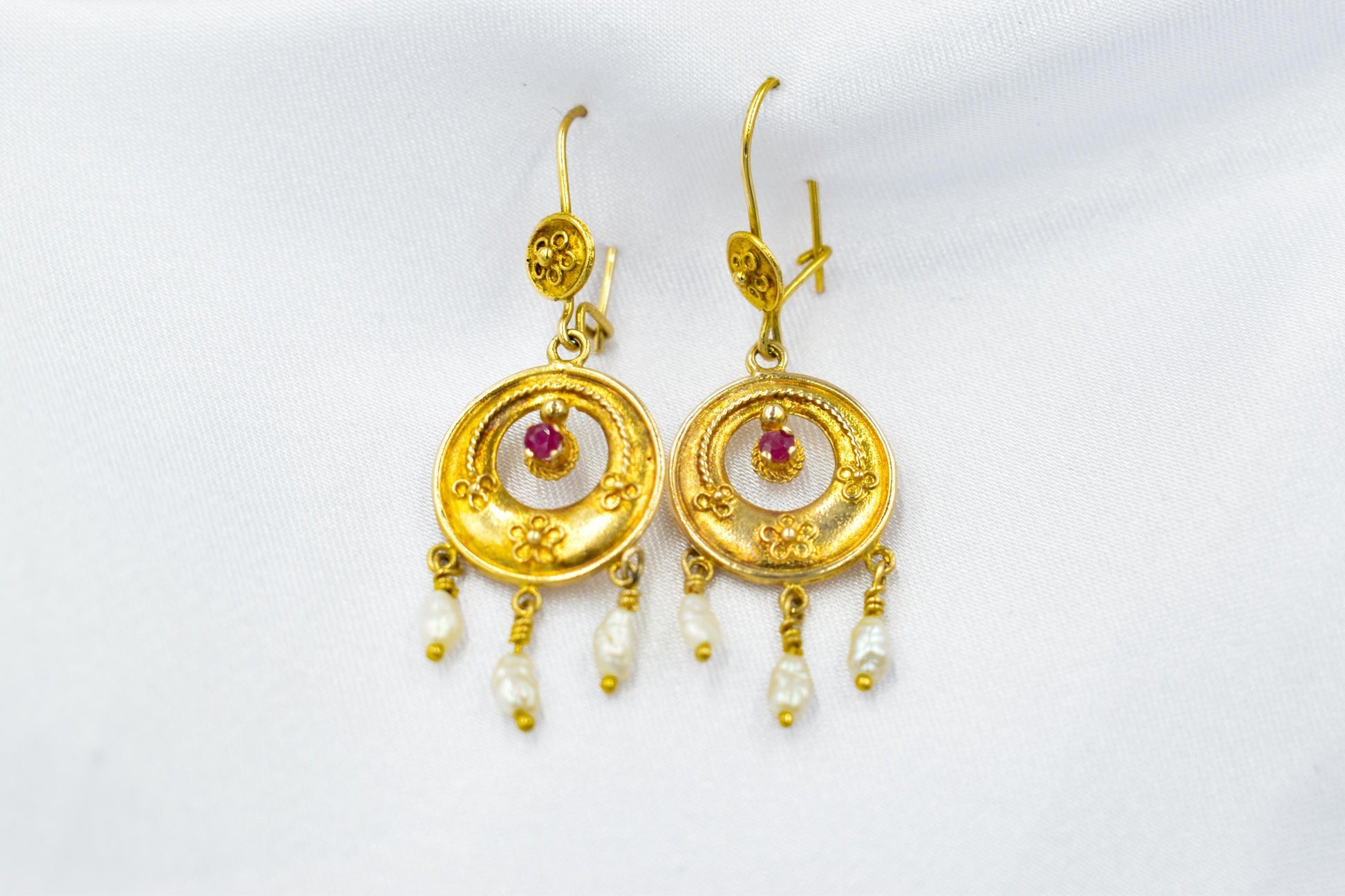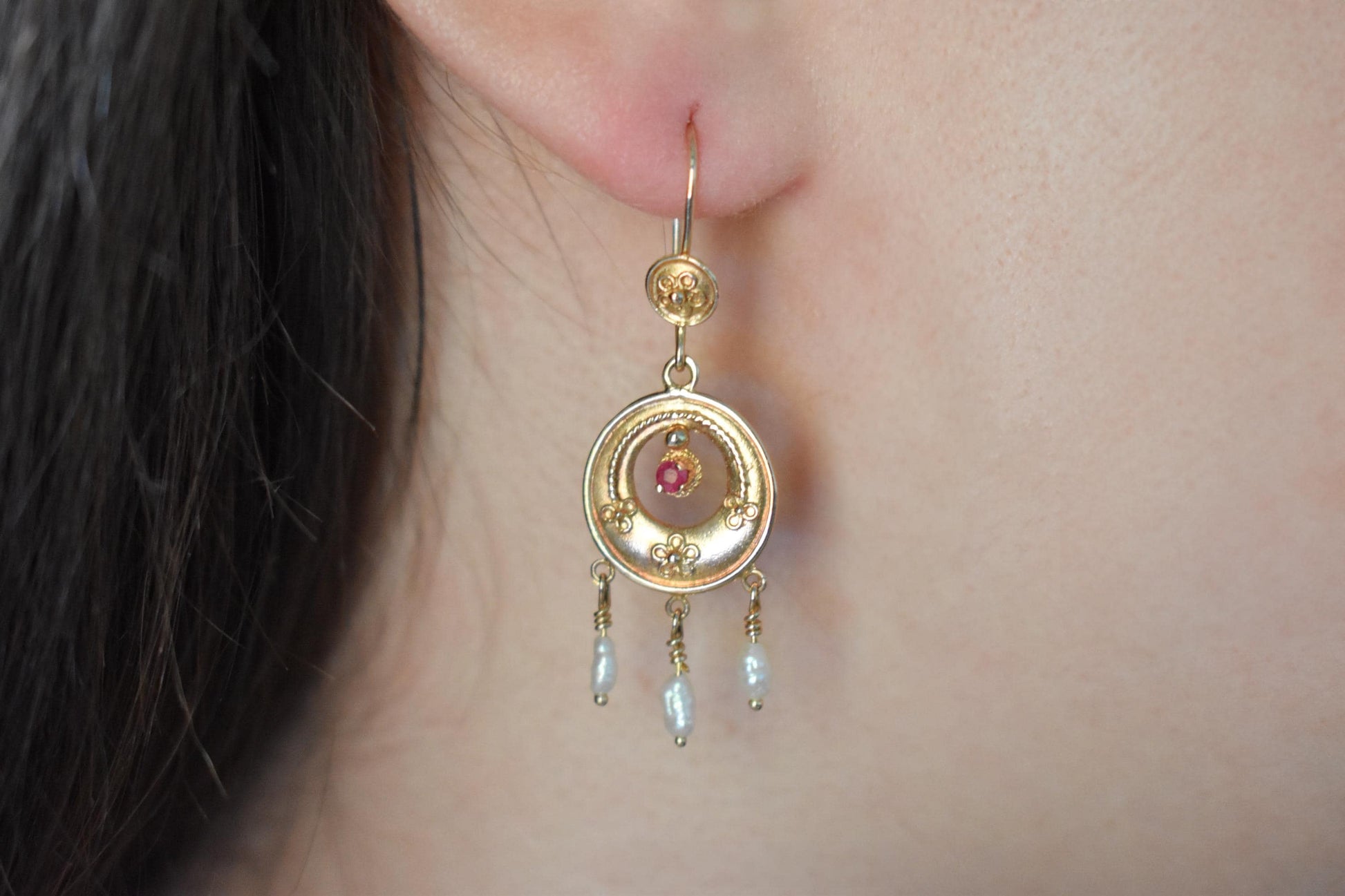 Στο κέντρο του χρυσού κυκλικού στοιχείου δεσπόζει ένα ορυκτό ρουμπίνι, ενώ στο κάτω μέρος κρέμονται τρία μικρά μπαρόκ μαργαριτάρια που προσθέτουν κίνηση, φως και μια απόλυτα θηλυκή πινελιά.