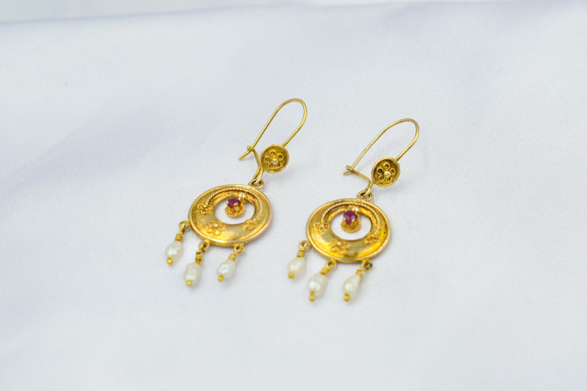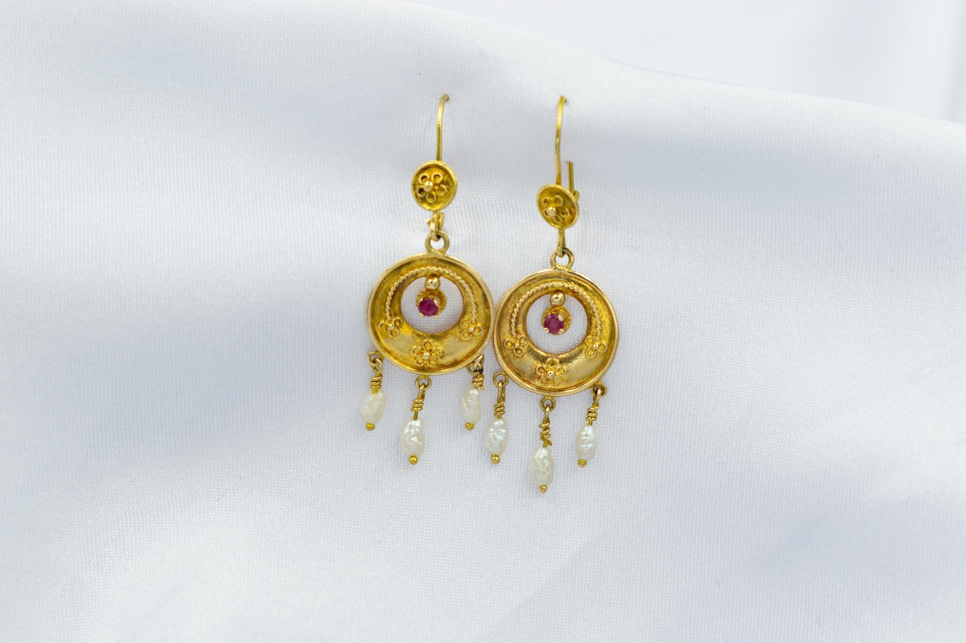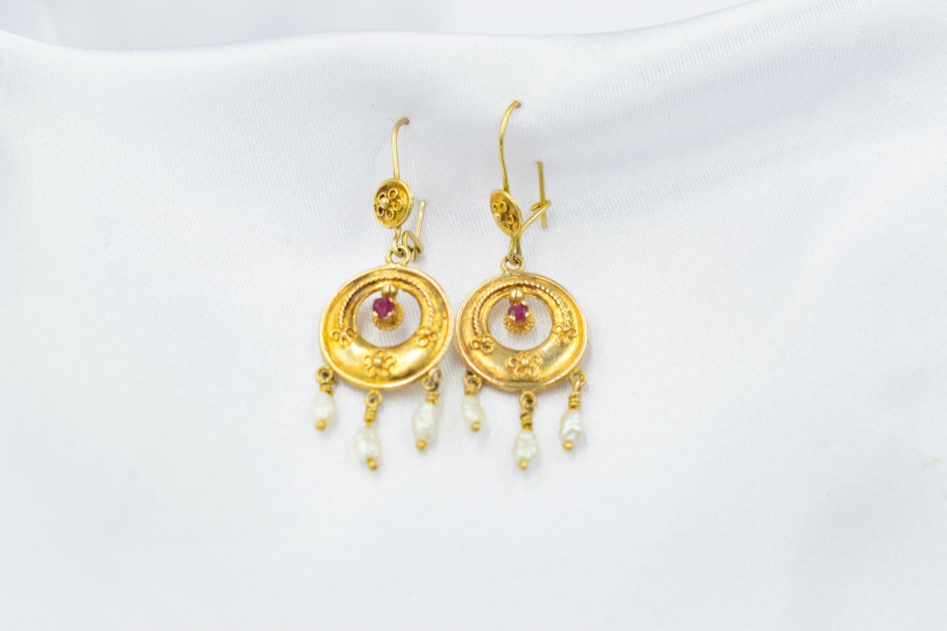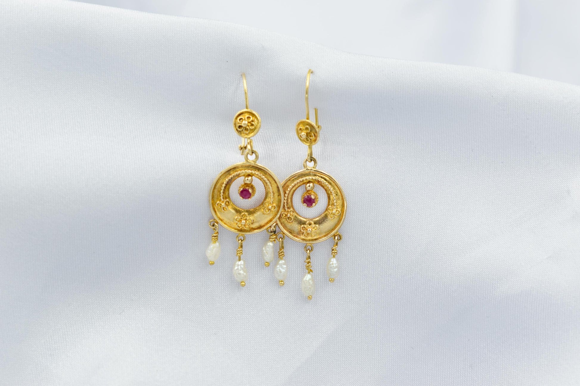 Στο κέντρο του χρυσού κυκλικού στοιχείου δεσπόζει ένα ορυκτό ρουμπίνι, ενώ στο κάτω μέρος κρέμονται τρία μικρά μπαρόκ μαργαριτάρια που προσθέτουν κίνηση, φως και μια απόλυτα θηλυκή πινελιά.