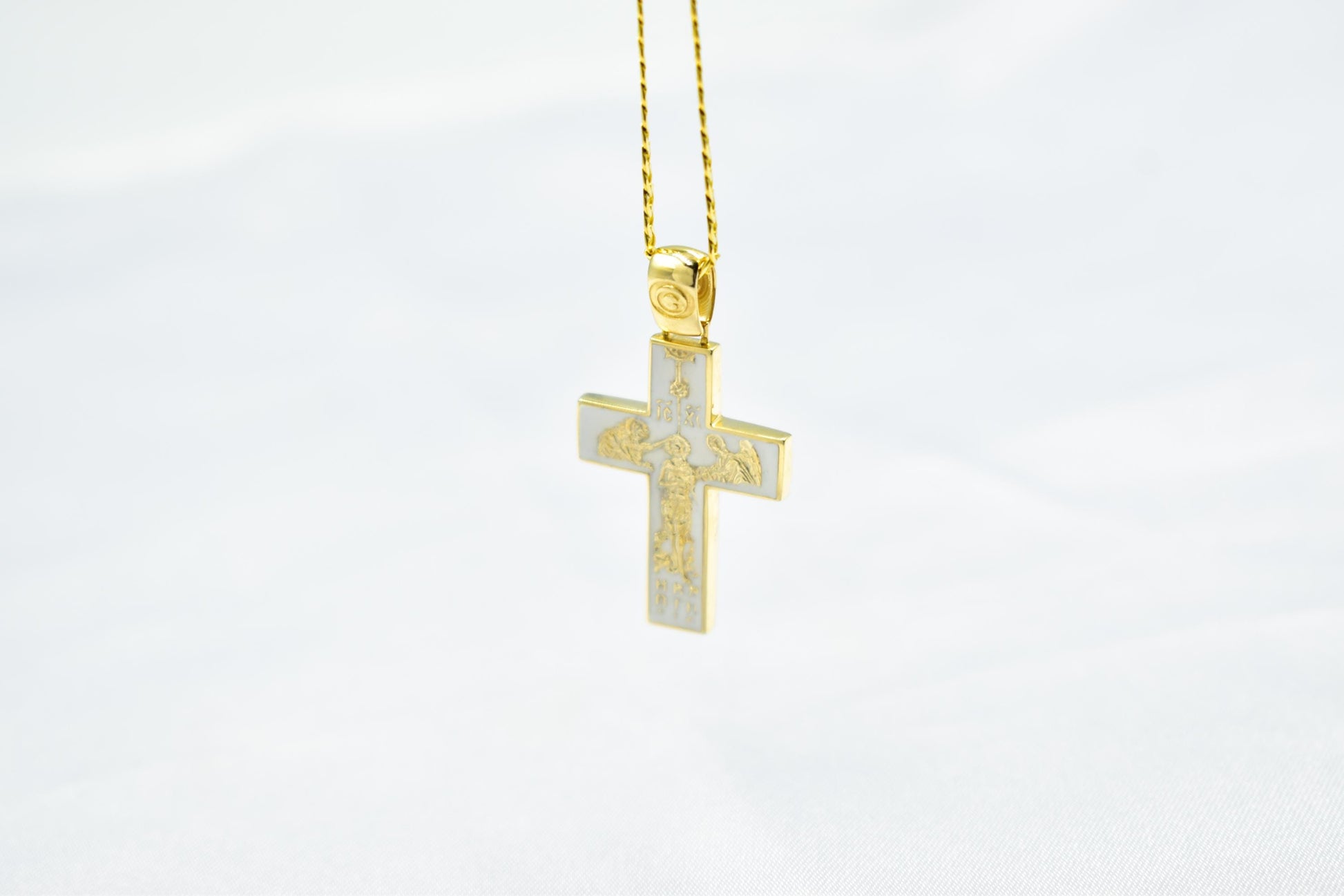 Celebrate faith with timeless elegance through this stunning 14K gold cross pendant. This exquisite piece is fully reversible, offering two unique looks in one: one side features a polished gold cross inlaid with brilliant cubic zirconia stones for a dazzling finish, while the reverse showcases a symbolic Byzantine-inspired design adorned with elegant white enamel and religious detailing.