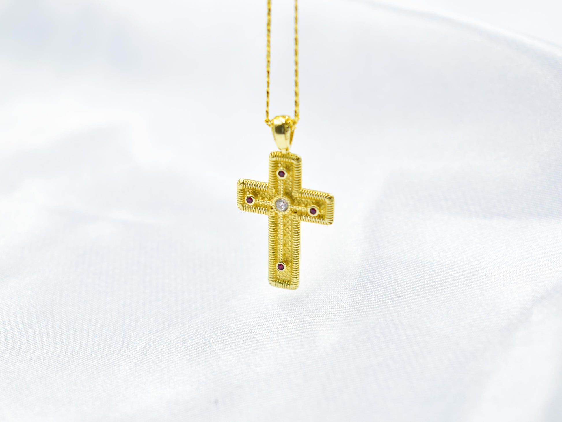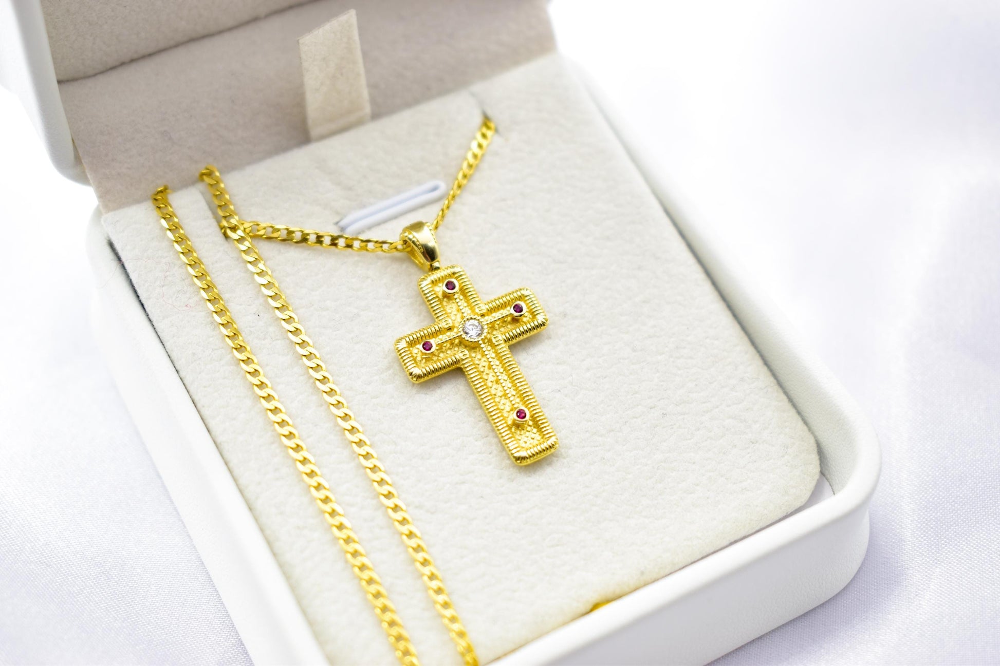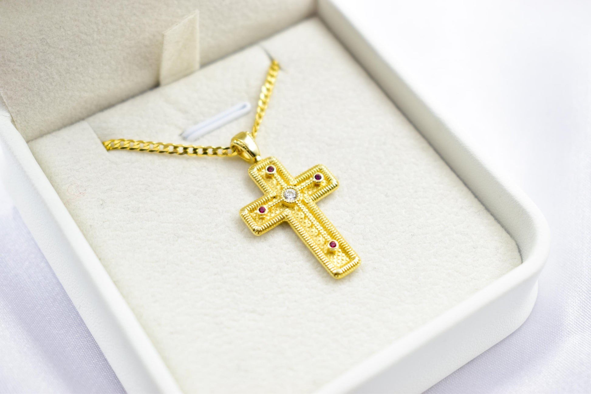 γυναικα 14K Gold Orthodox Cross Pendant with Red & White Zircons | Double-Sided Design,Handmade Religious Jewellery | Baptism Gift Ready, 14K Chain