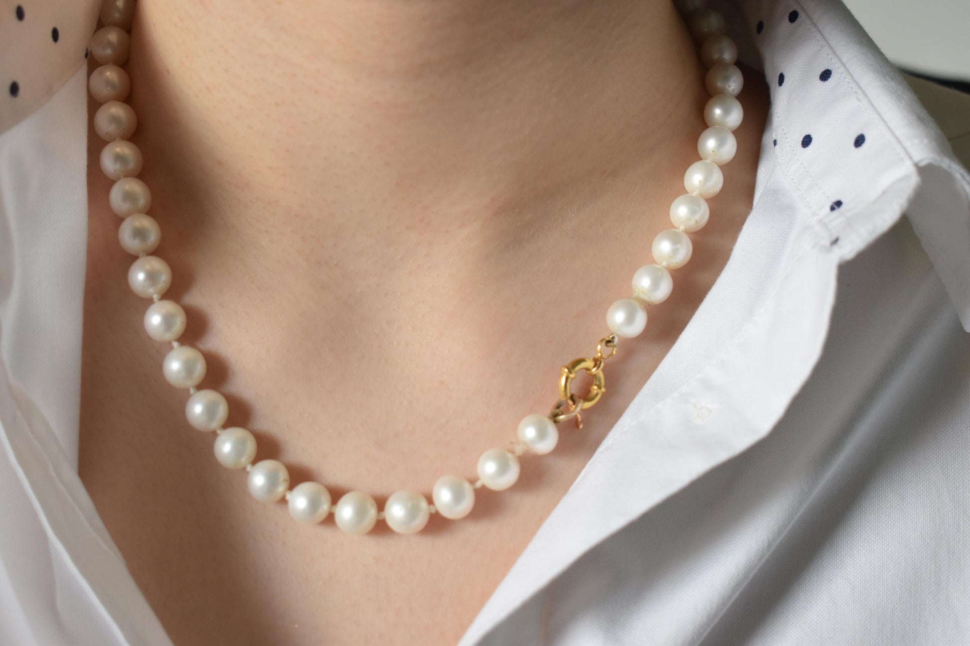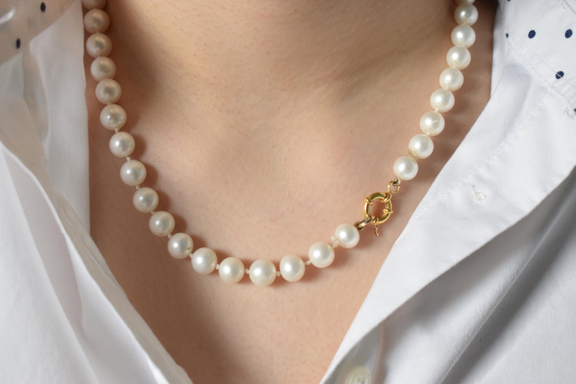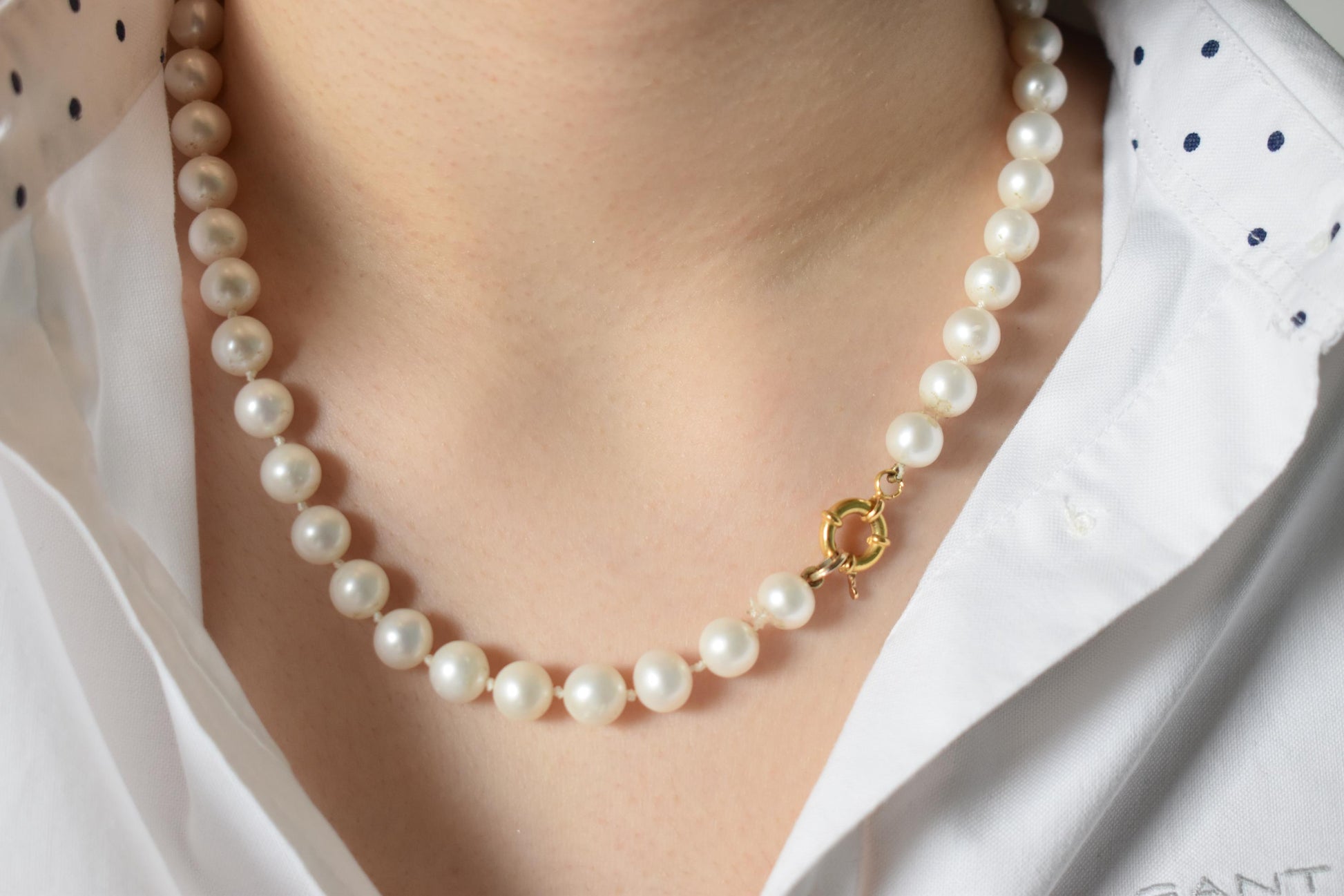 Κολιέ από φυσικά μαργαριτάρια με κούμπωμα Κ14, κατασκευασμένο στο εργαστήριό μας με προσοχή στη λεπτομέρεια και την παραδοσιακή τεχνική δεσίματος μεταξύ κάθε μαργαριταριού.