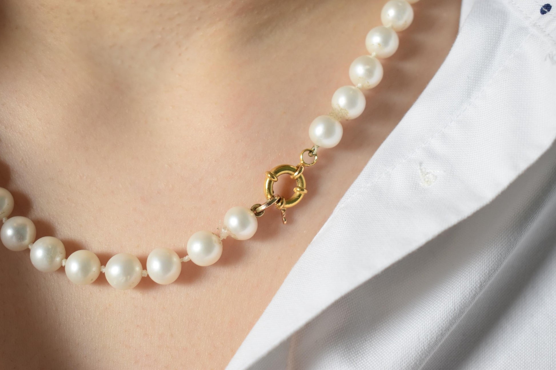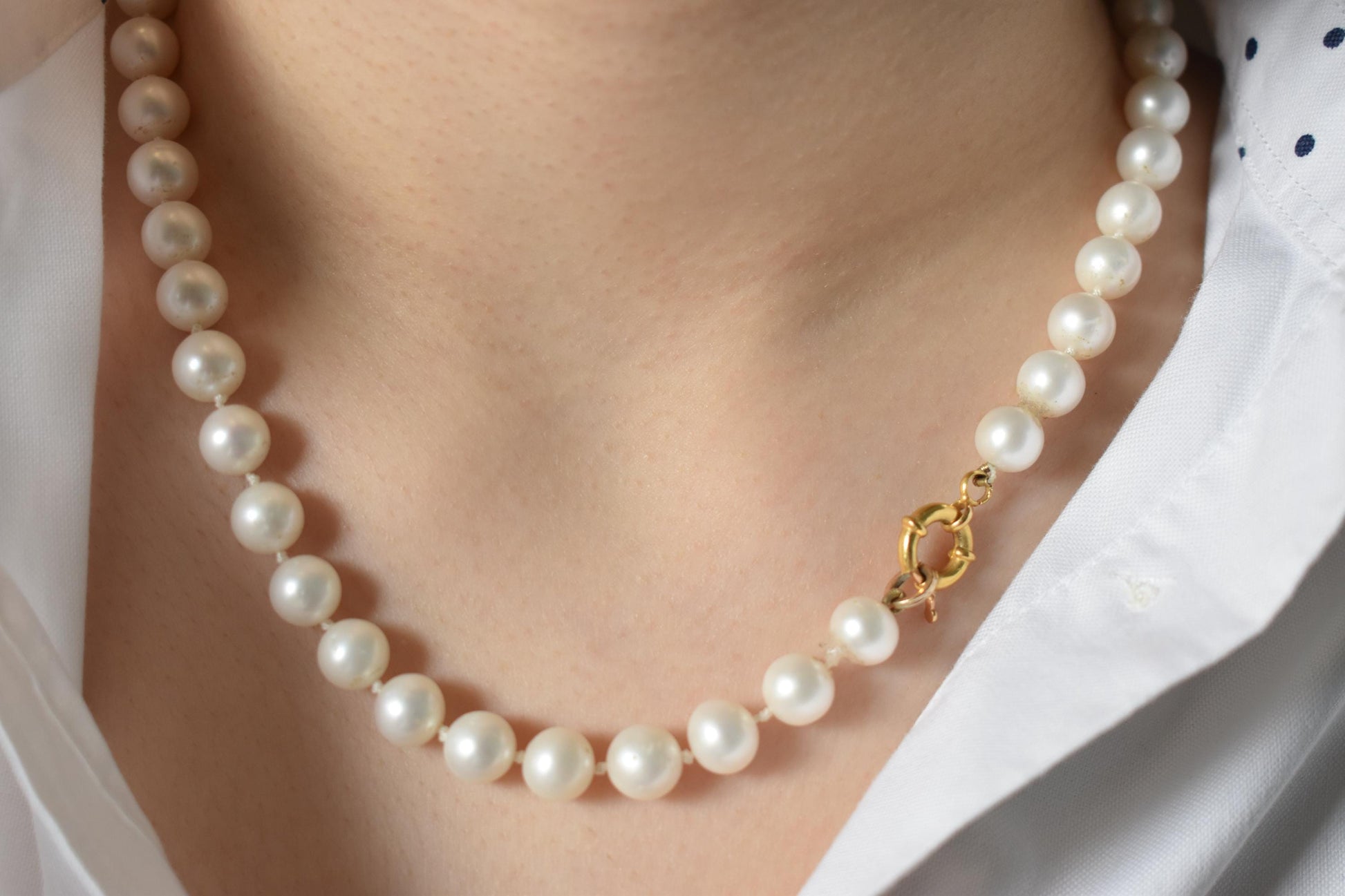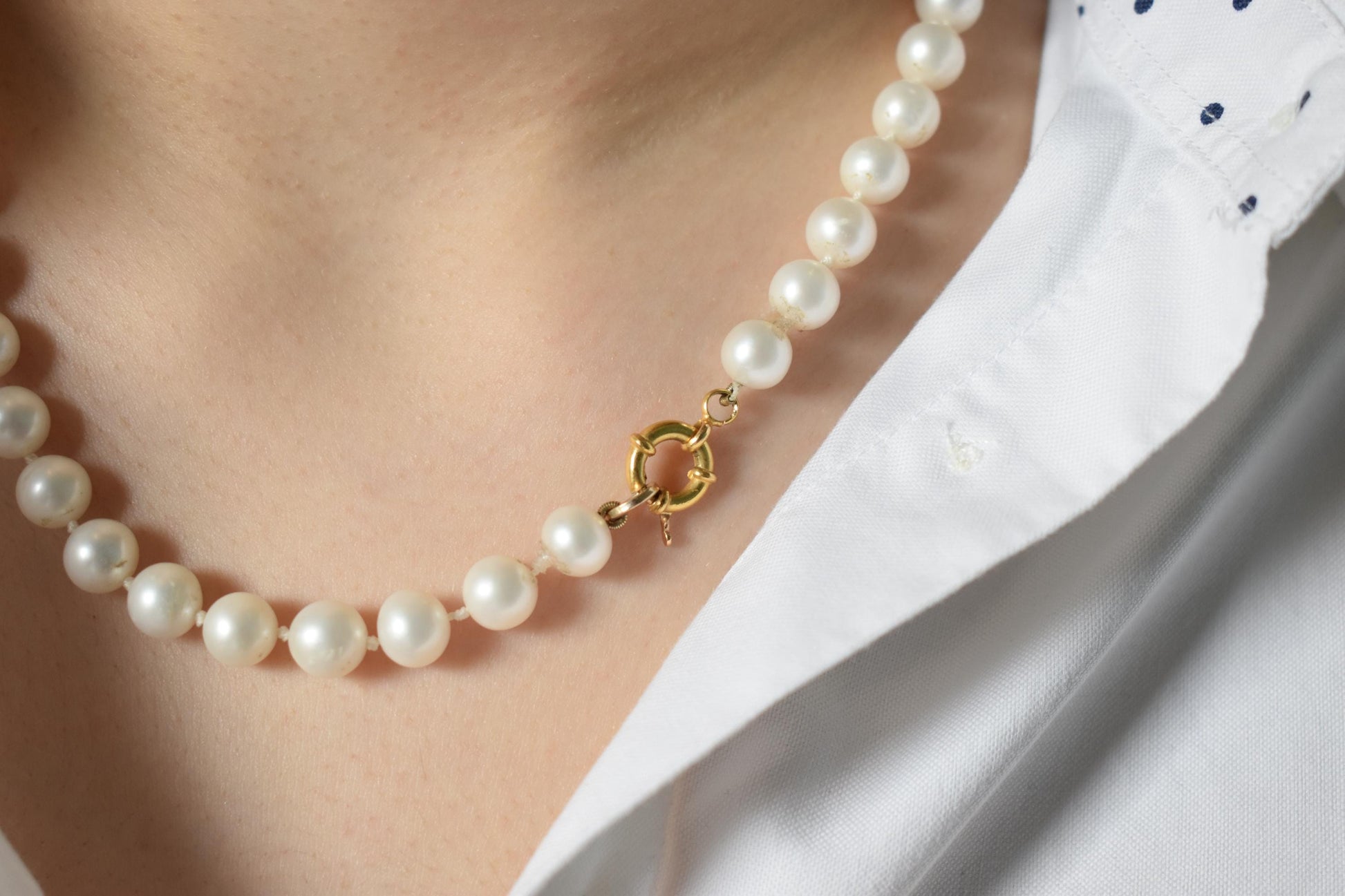 Κολιέ από φυσικά μαργαριτάρια με κούμπωμα Κ14, κατασκευασμένο στο εργαστήριό μας με προσοχή στη λεπτομέρεια και την παραδοσιακή τεχνική δεσίματος μεταξύ κάθε μαργαριταριού.
