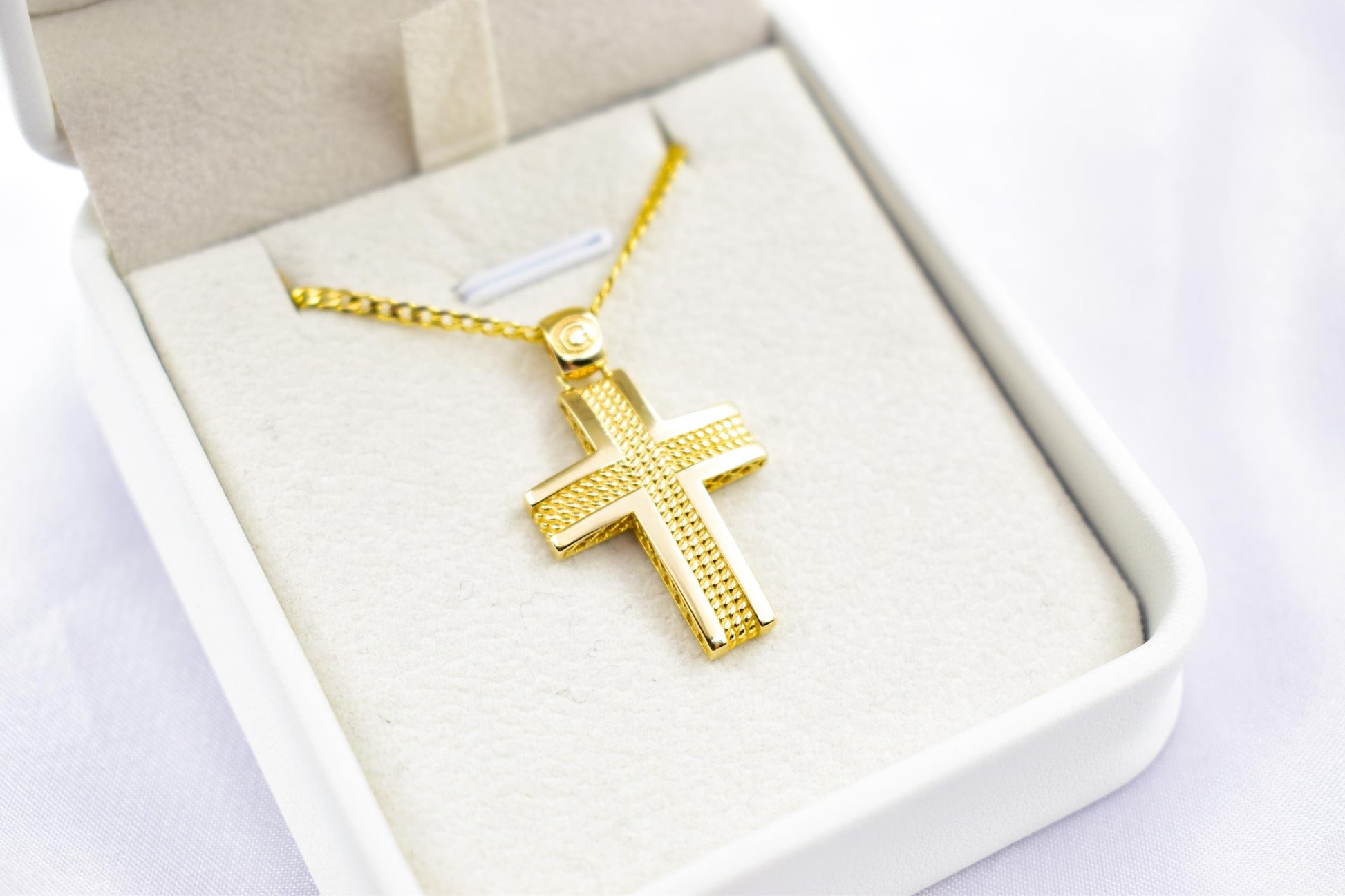 Ανδρικοί Σταυροί 14K Gold Polished Cross Pendant with Textured Center | Elegant Double-Sided Design | Men’s & Women’s Necklace Option , Baptism Gift