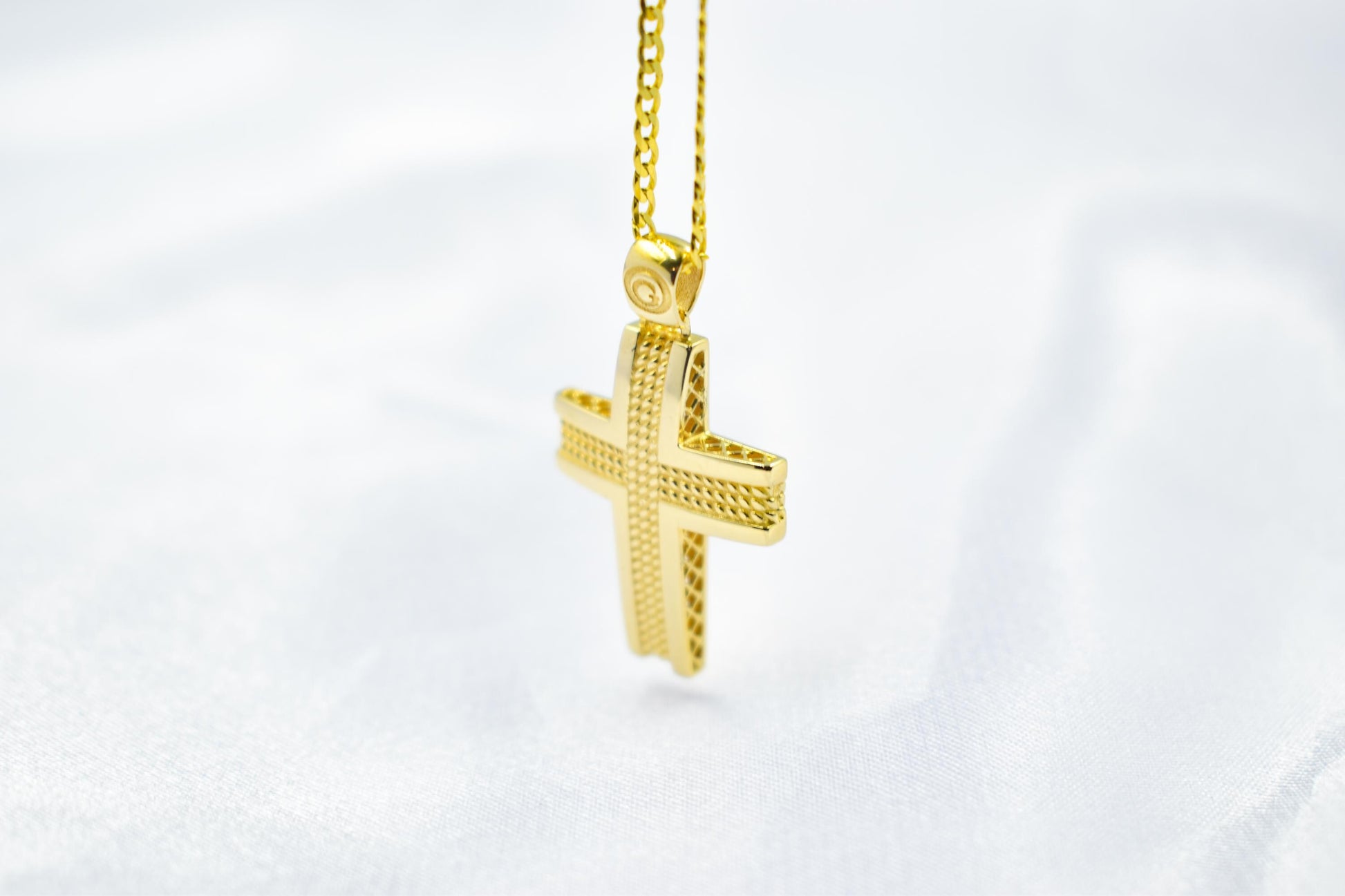 Celebrate classic elegance with this handcrafted cross pendant made of solid 14K yellow gold. The design features a refined, polished outline paired with a textured central stripe in a woven-style finish, giving the piece depth and brilliance.
