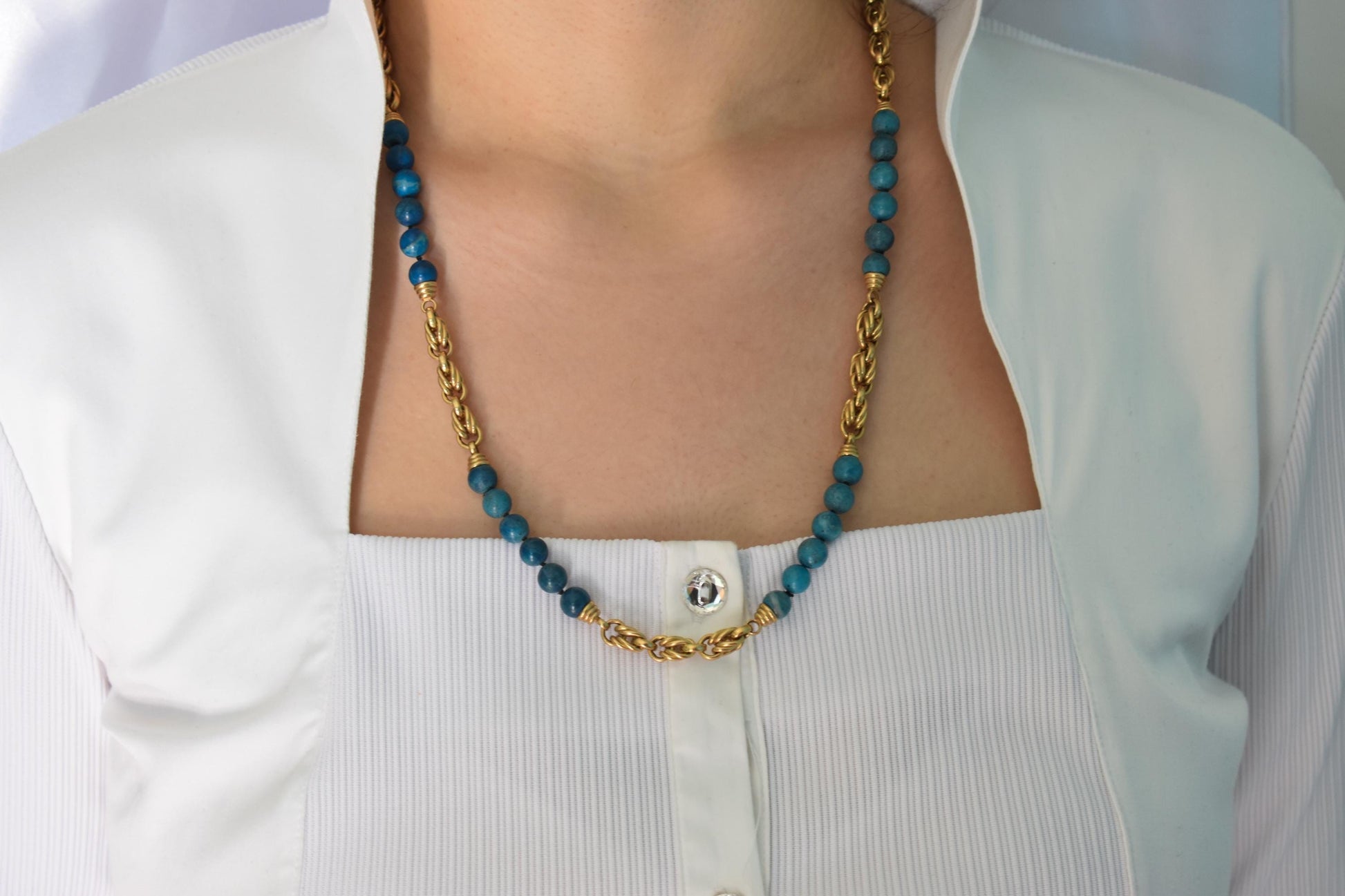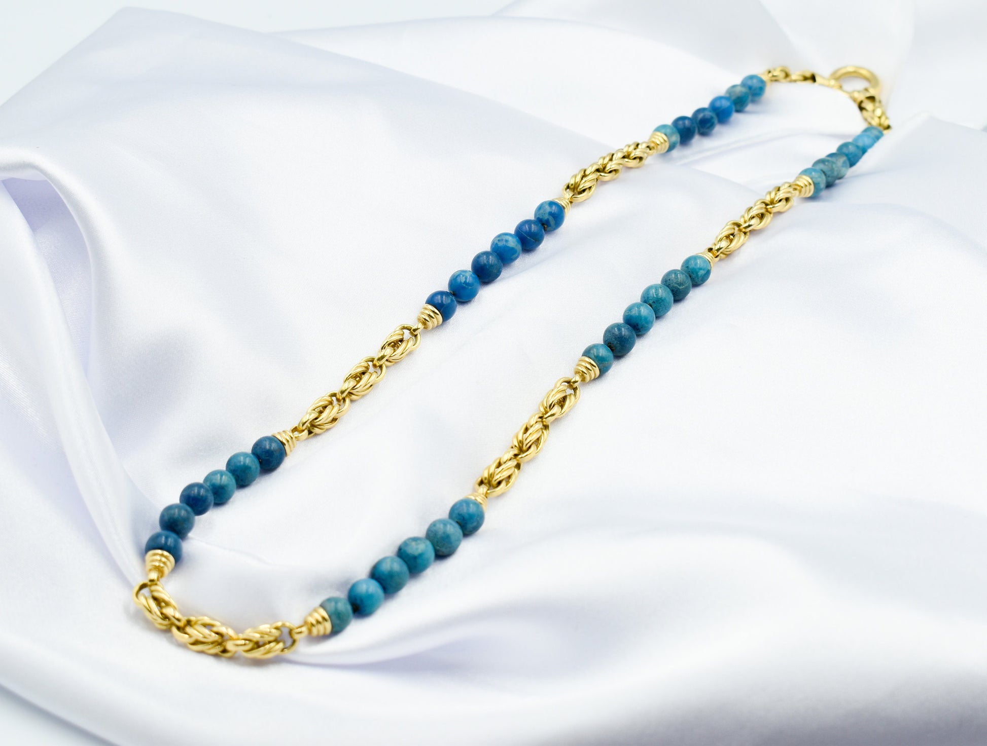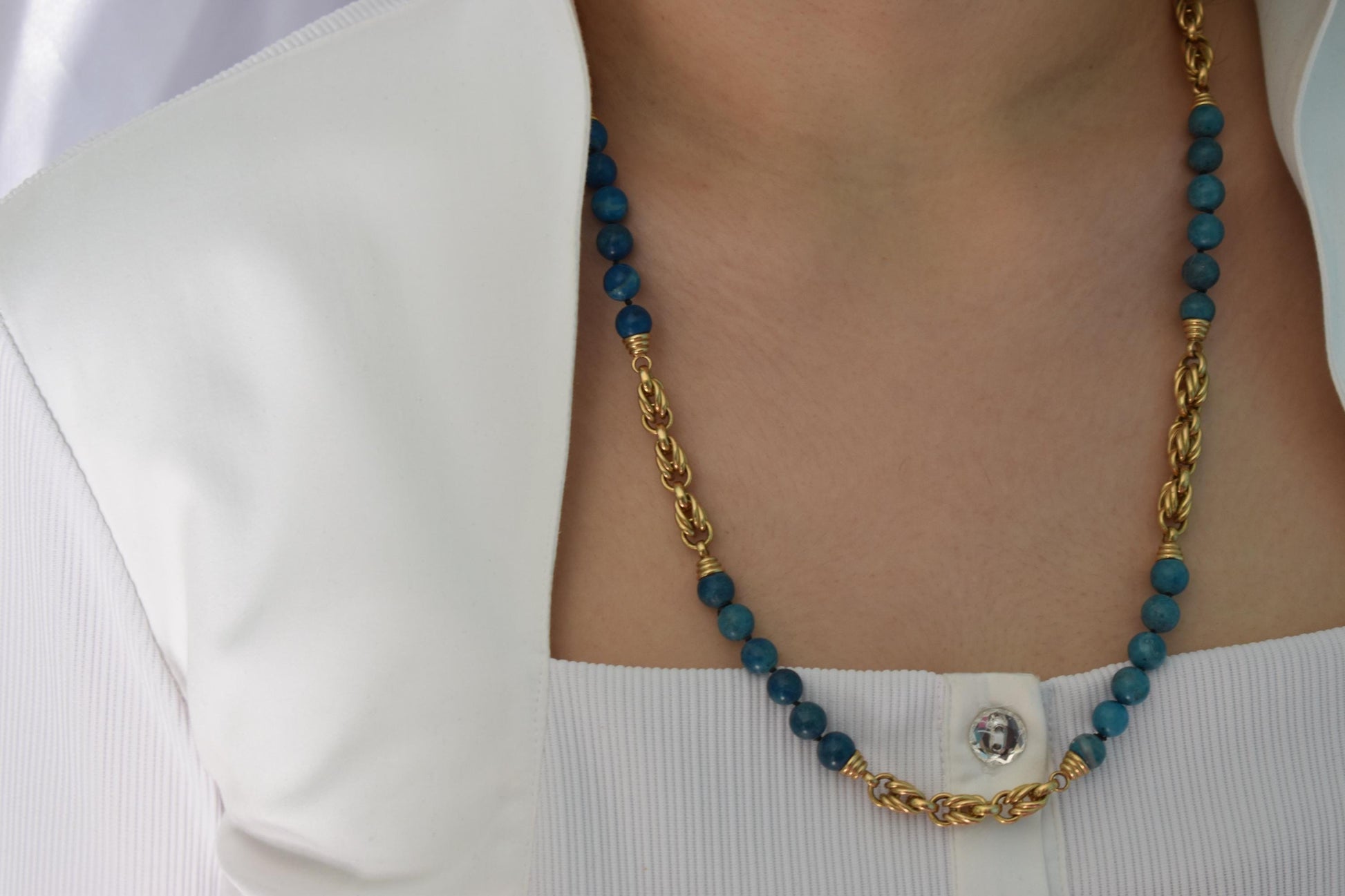 Ένα ιδιαίτερο χειροποίητο κολιέ από χρυσό 14 καρατίων συνδυασμένο με φυσικές πέτρες τυρκουάζ. Η ζεστή απόχρωση του χρυσού δένει αρμονικά με το βαθύ μπλε-πράσινο του τυρκουάζ, δημιουργώντας ένα κόσμημα με έντονη προσωπικότητα και boho πολυτελή αισθητική. Φοριέται άνετα καθημερινά αλλά και σε πιο ξεχωριστές περιστάσεις, είτε μόνο του είτε σε layering με άλλα κολιέ. ✨