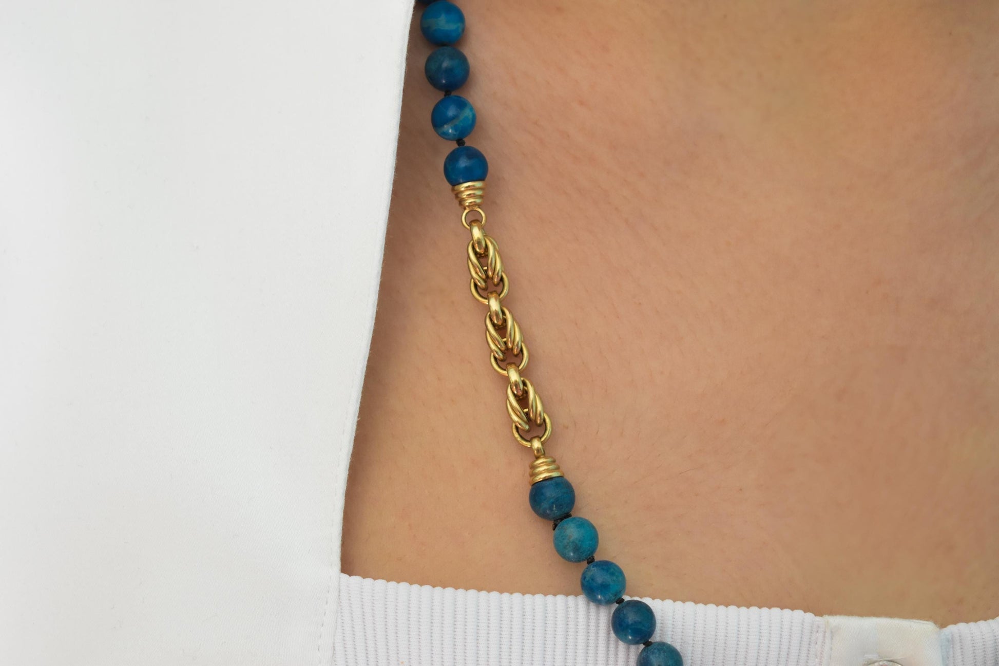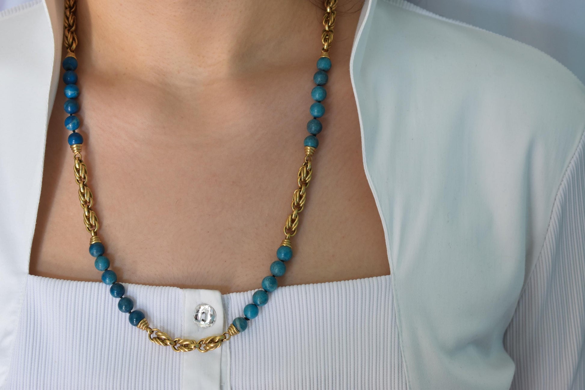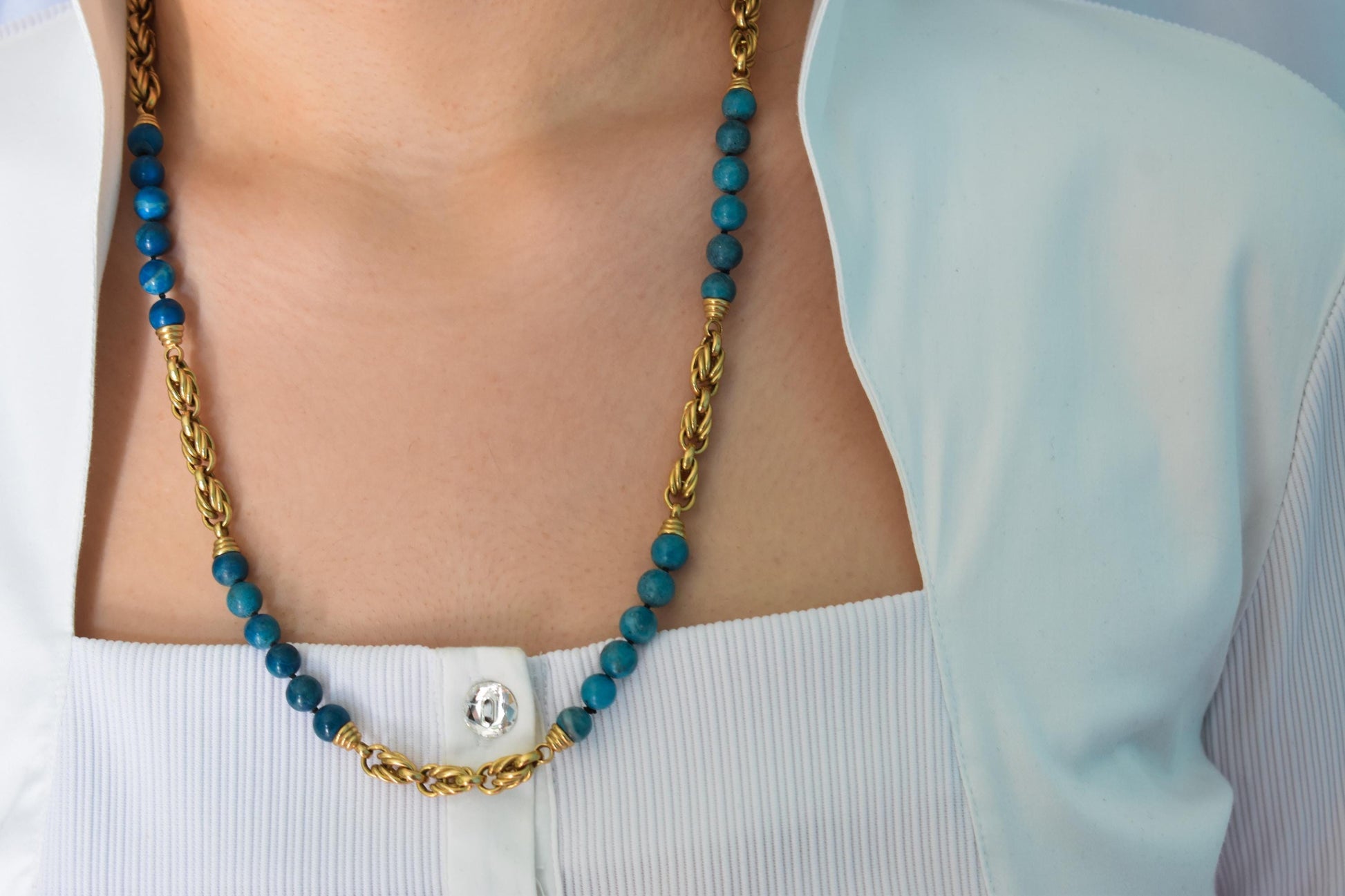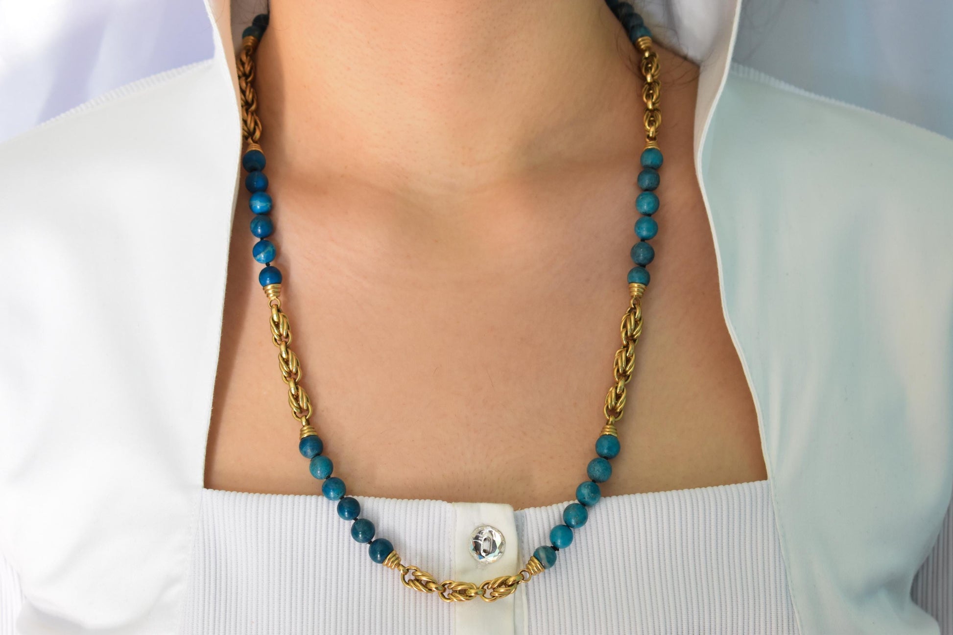 Ένα ιδιαίτερο χειροποίητο κολιέ από χρυσό 14 καρατίων συνδυασμένο με φυσικές πέτρες τυρκουάζ. Η ζεστή απόχρωση του χρυσού δένει αρμονικά με το βαθύ μπλε-πράσινο του τυρκουάζ, δημιουργώντας ένα κόσμημα με έντονη προσωπικότητα και boho πολυτελή αισθητική. Φοριέται άνετα καθημερινά αλλά και σε πιο ξεχωριστές περιστάσεις, είτε μόνο του είτε σε layering με άλλα κολιέ. ✨