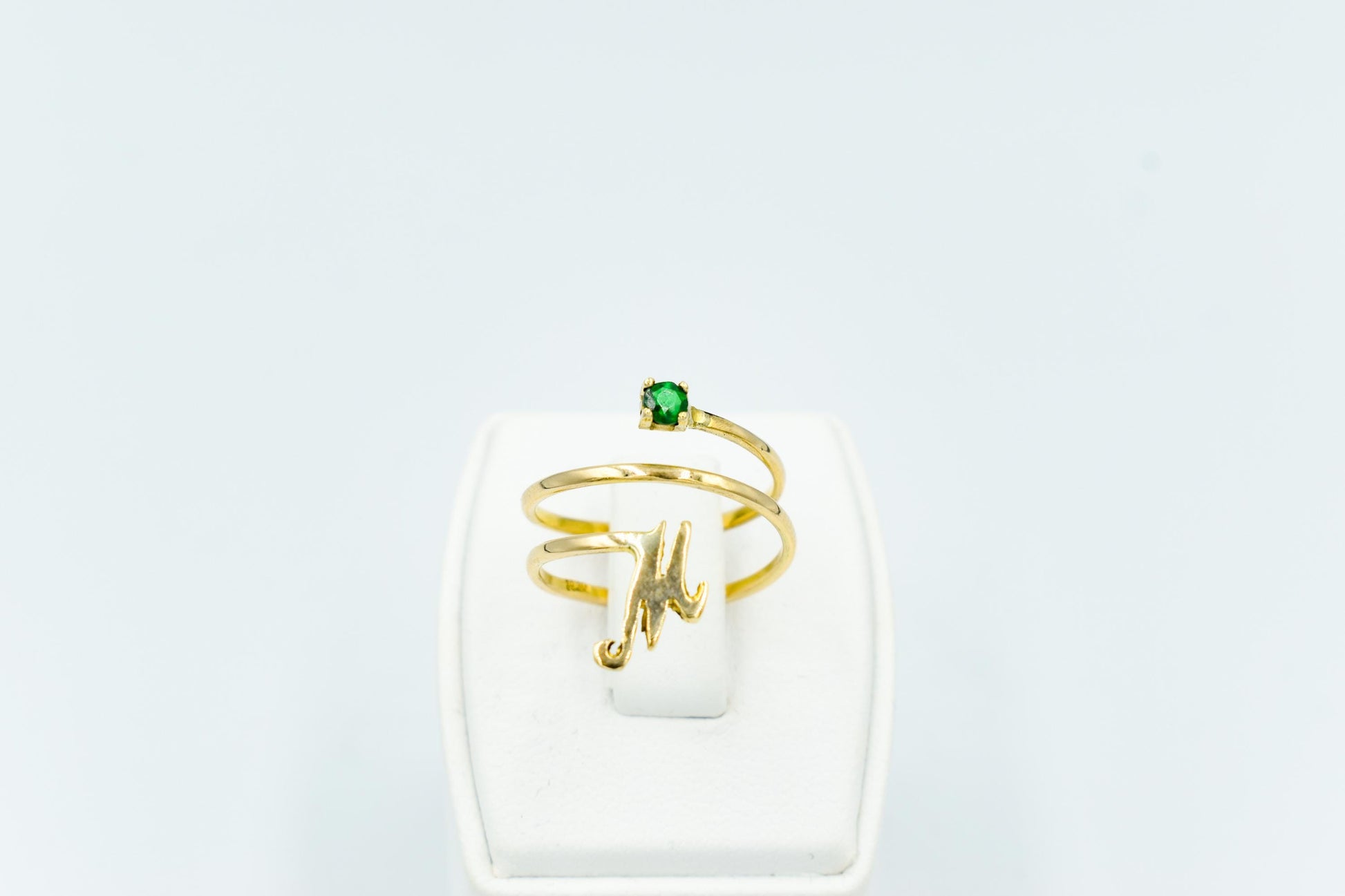 Experience the elegance of this stunning Unique Green Spinel Monogram Ring, a perfect blend of artistry and personalization. This exquisite piece features a vibrant green spinel, known for its rich hue and captivating brilliance. The spinel is securely set in a beautifully crafted band that showcases a unique spiral design, elegantly wrapping around your finger.