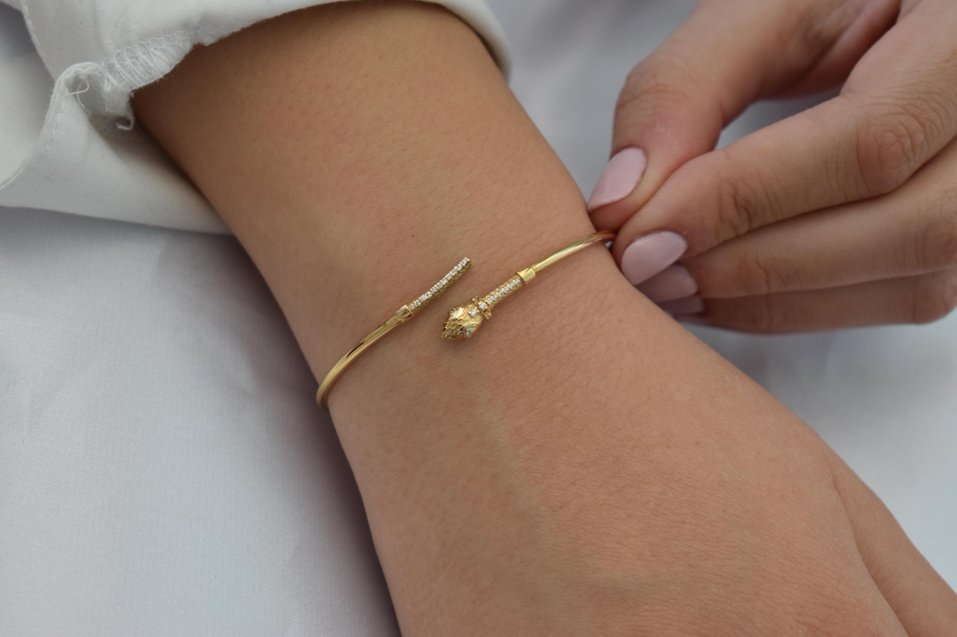 Embrace the enchanting beauty of this unique serpent-inspired bangle, where 14-karat gold and radiant white zircons come together to create a piece that celebrates nature's grace and the allure of serpents. Make it a cherished addition to your jewelry collection and revel in its mystique and elegance with every wear.