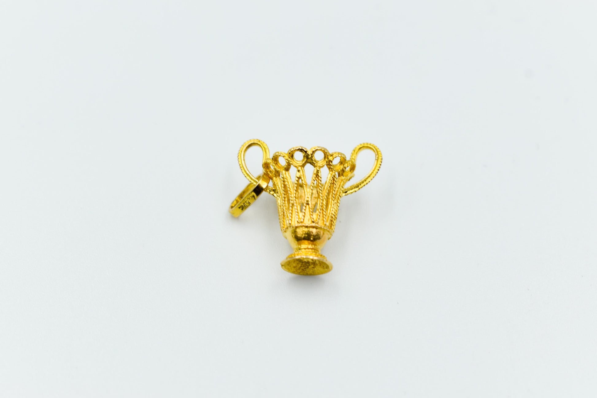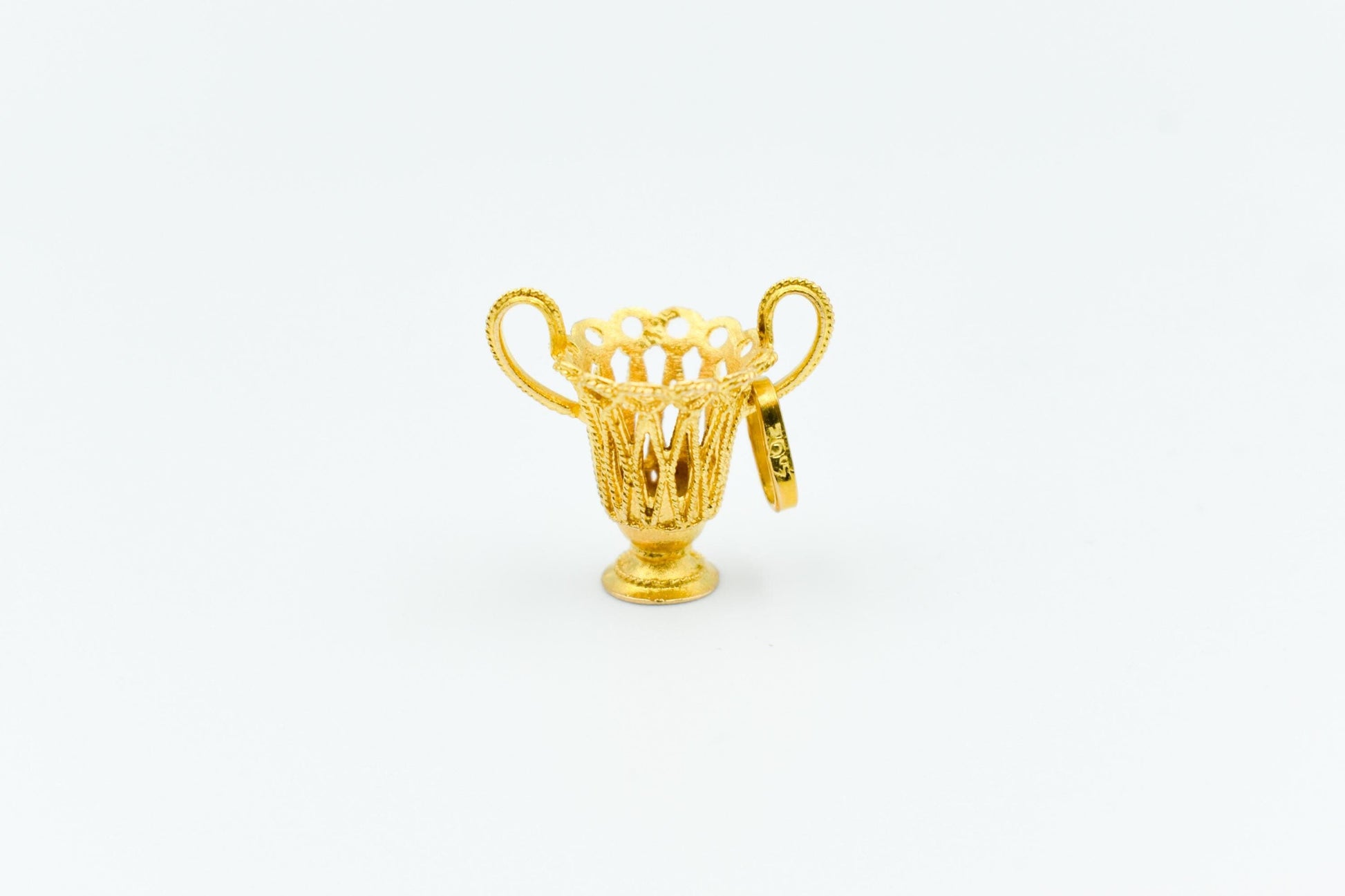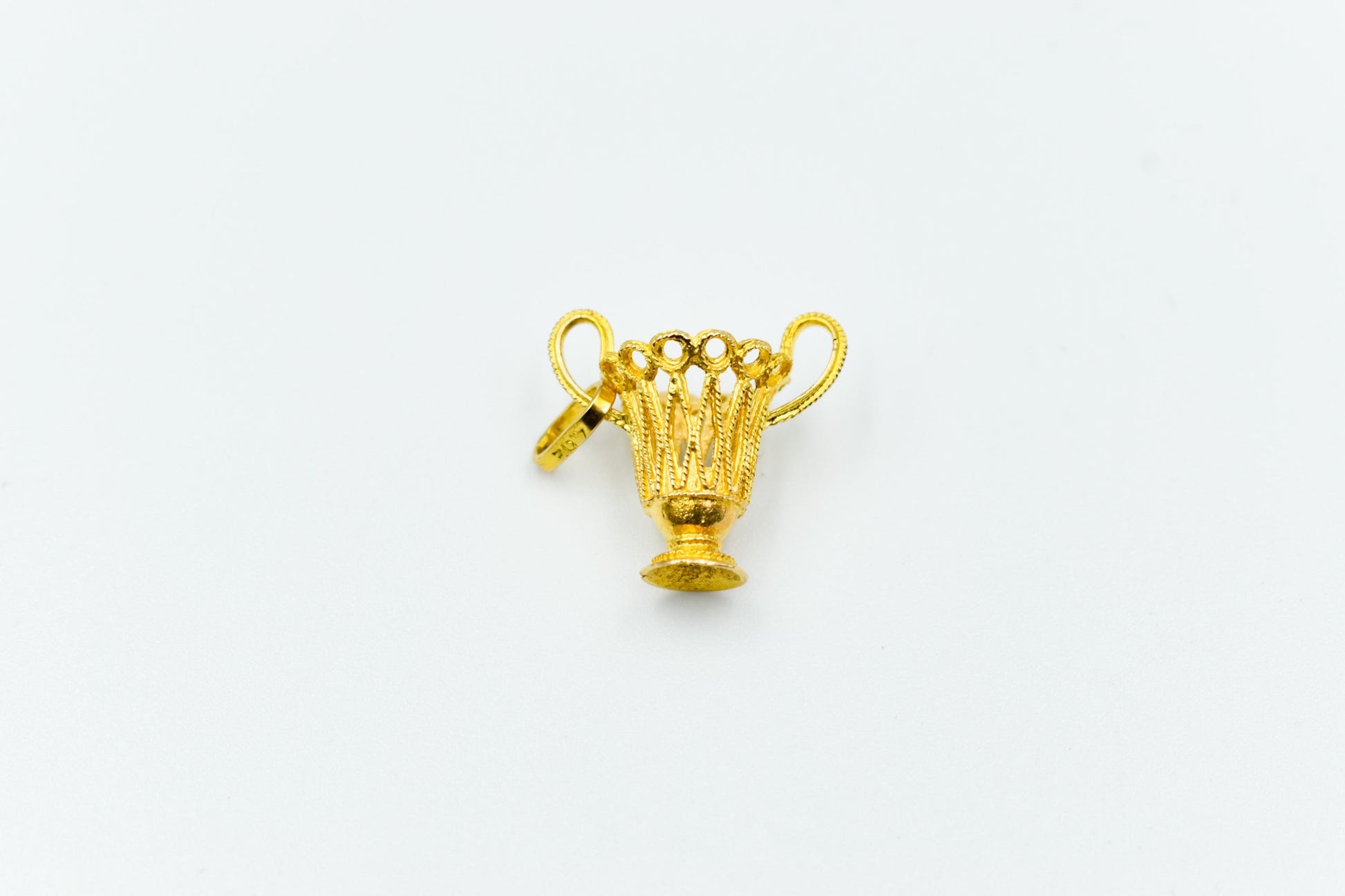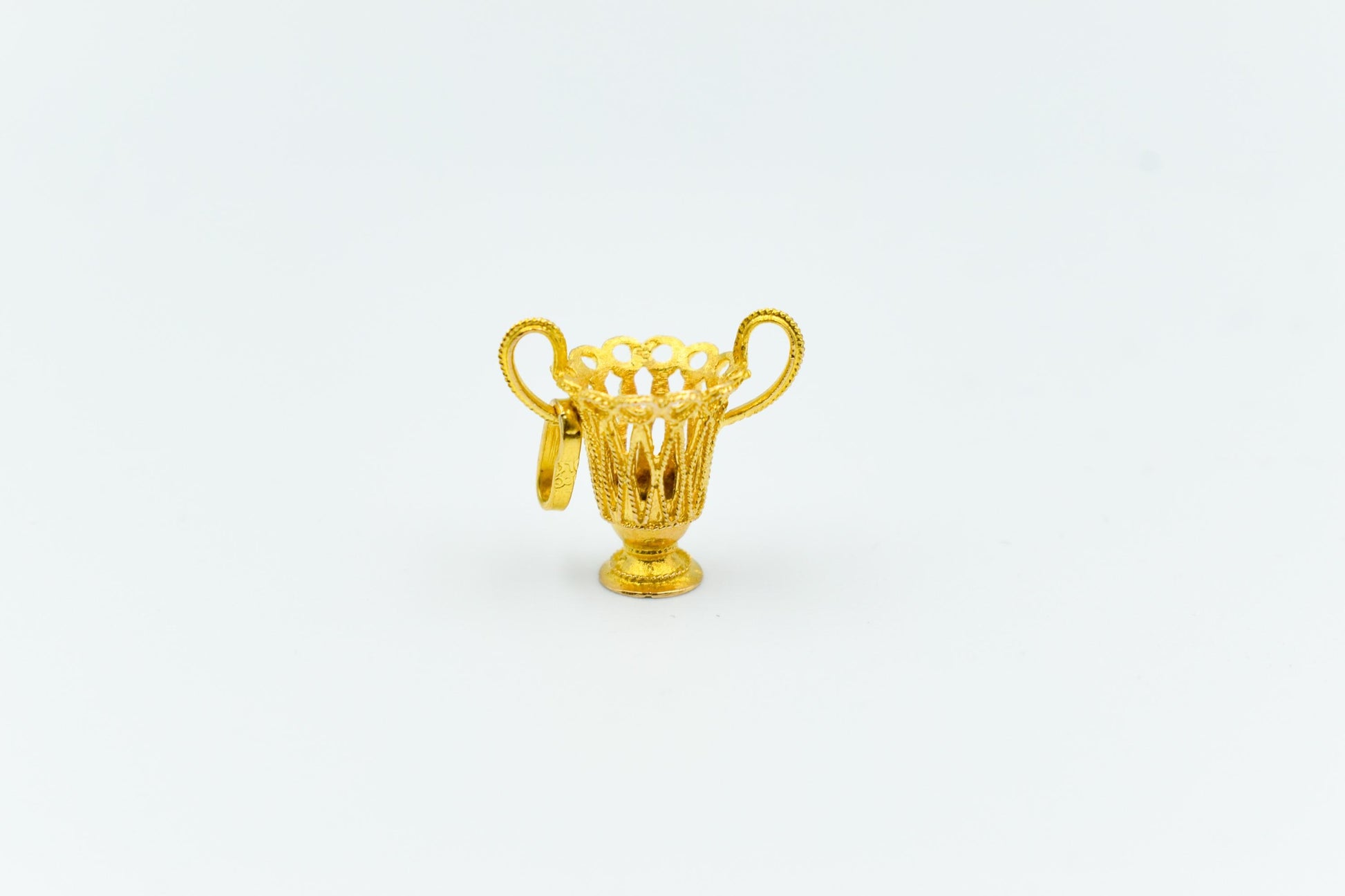 Ένα μοναδικό τρισδιάστατο κρεμαστό 14 καρατίων σε μορφή αρχαιοελληνικού αμφορέα, πιστό στην αισθητική των κλασικών αγγείων. Το περίτεχνο διάτρητο σχέδιο και η ανάγλυφη κατασκευή του προσφέρουν βάθος, όγκο και συλλεκτική αξία.