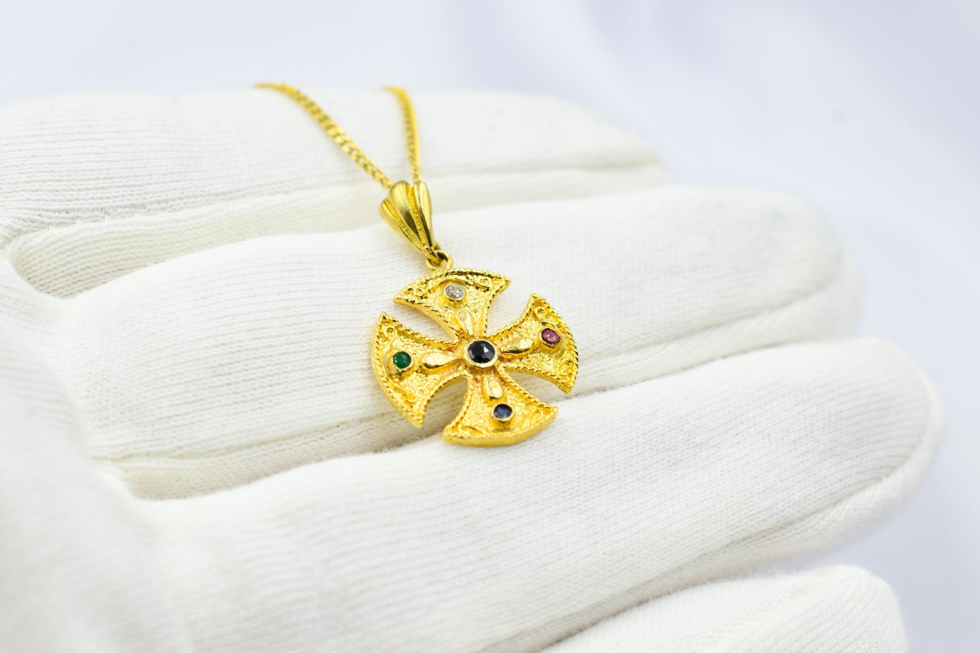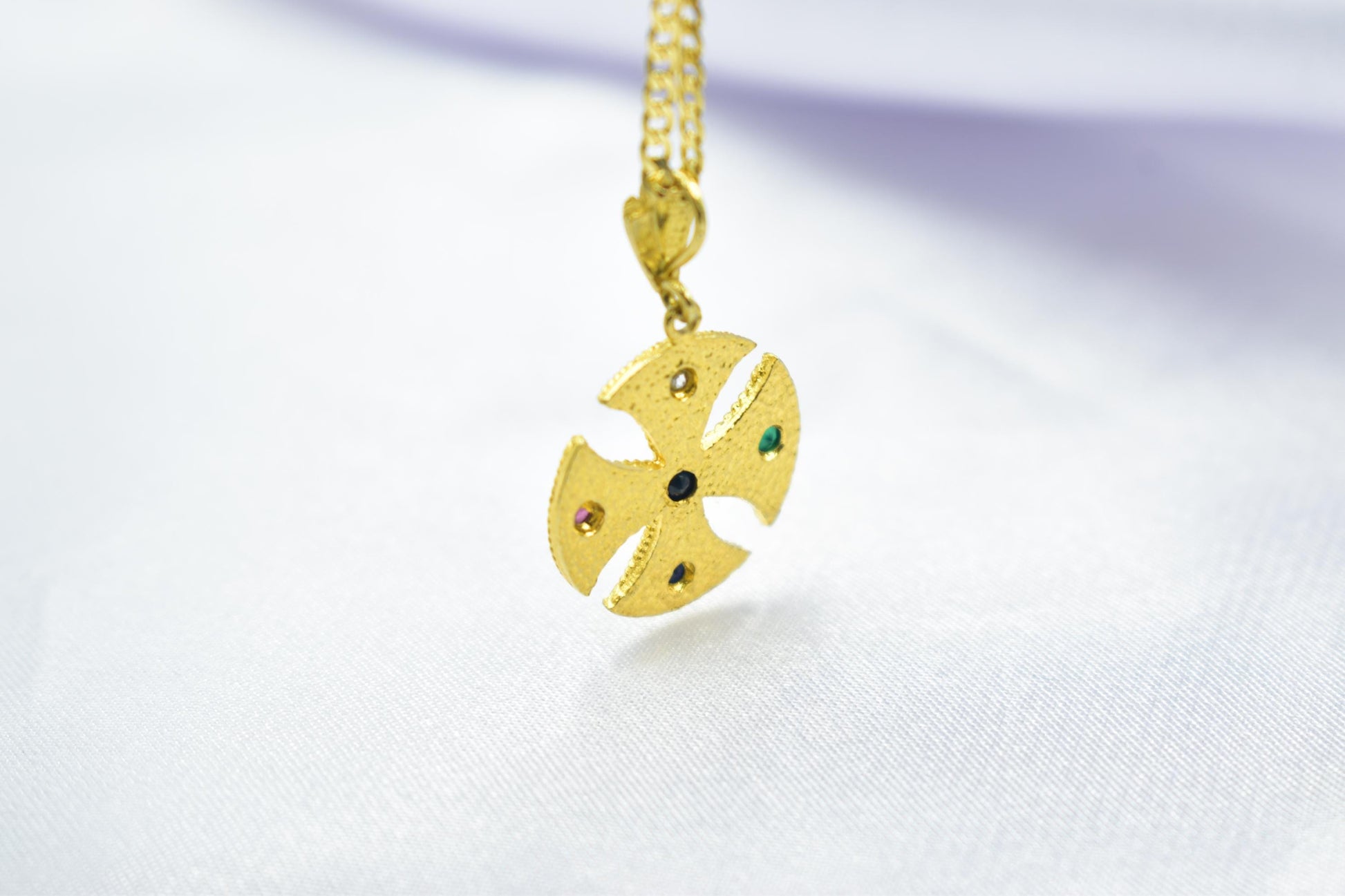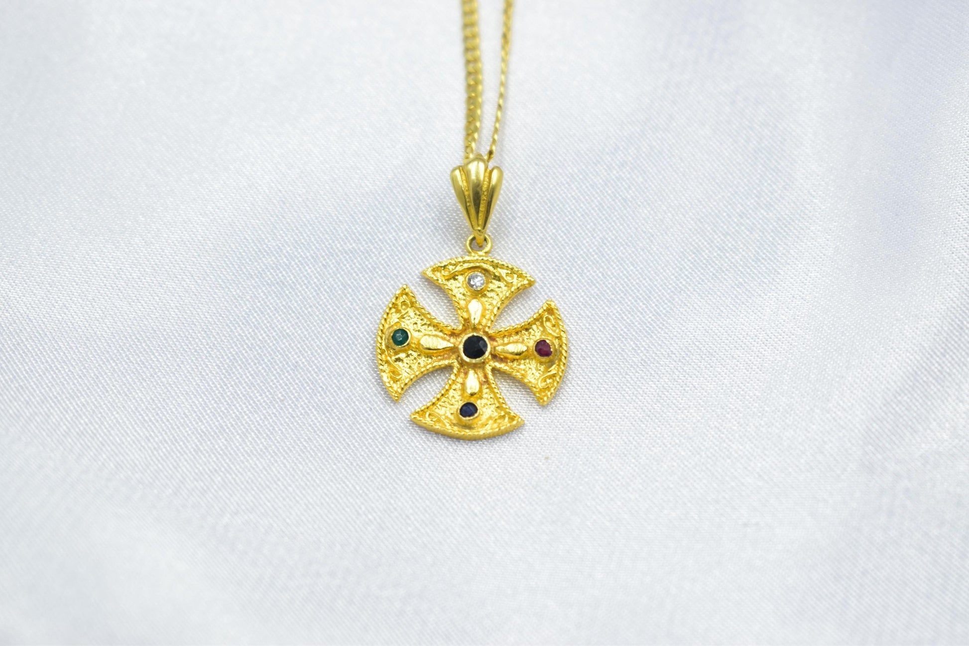 Ένας εντυπωσιακός βυζαντινός σταυρός 14 καρατίων με στρογγυλό σχήμα και περίτεχνη χειροποίητη υφή. Κάθε άκρο του φιλοξενεί ένα διαφορετικό ζιργκόν σε διακριτικά χρώματα, δημιουργώντας ένα μοναδικό σύνολο με έντονο συμβολισμό και αυθεντικό χαρακτήρα. ✨