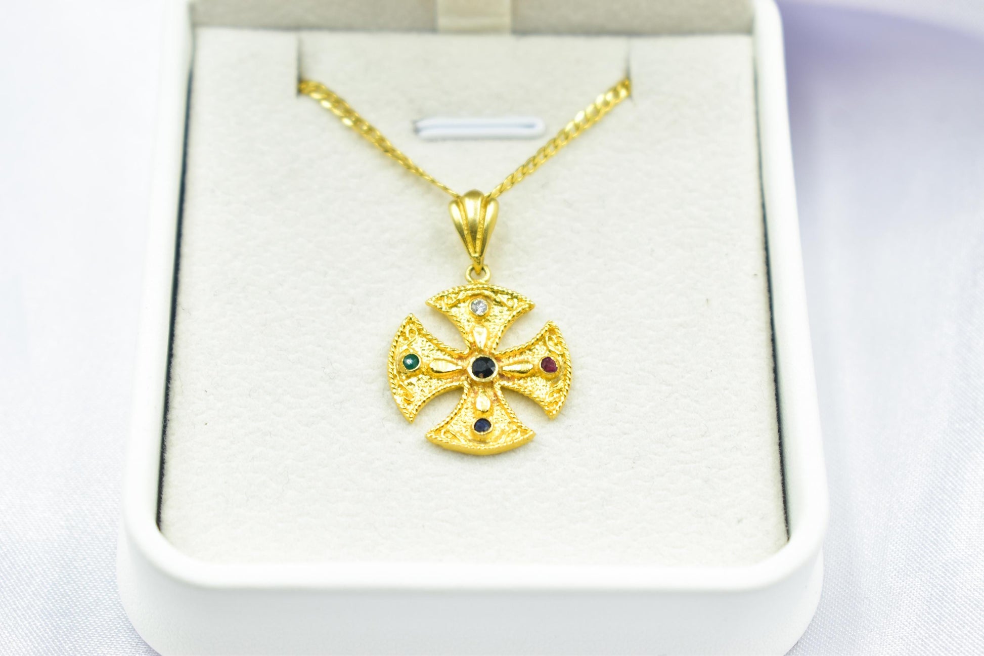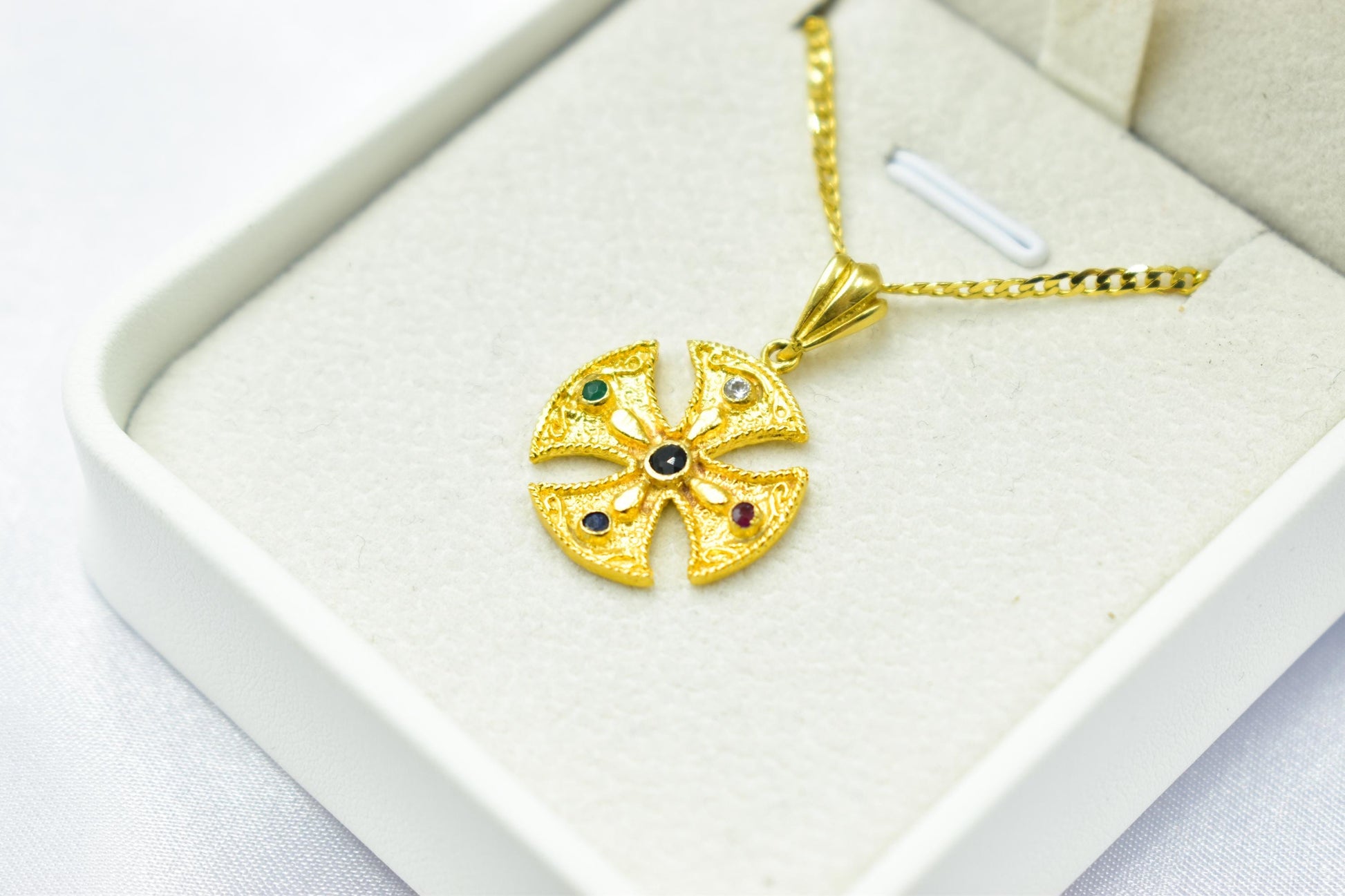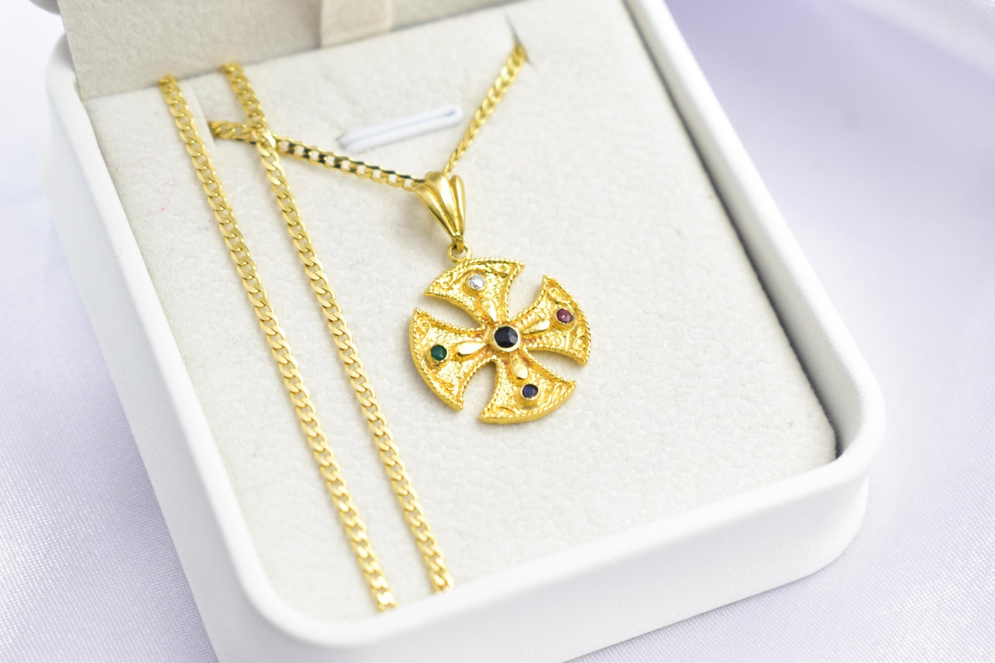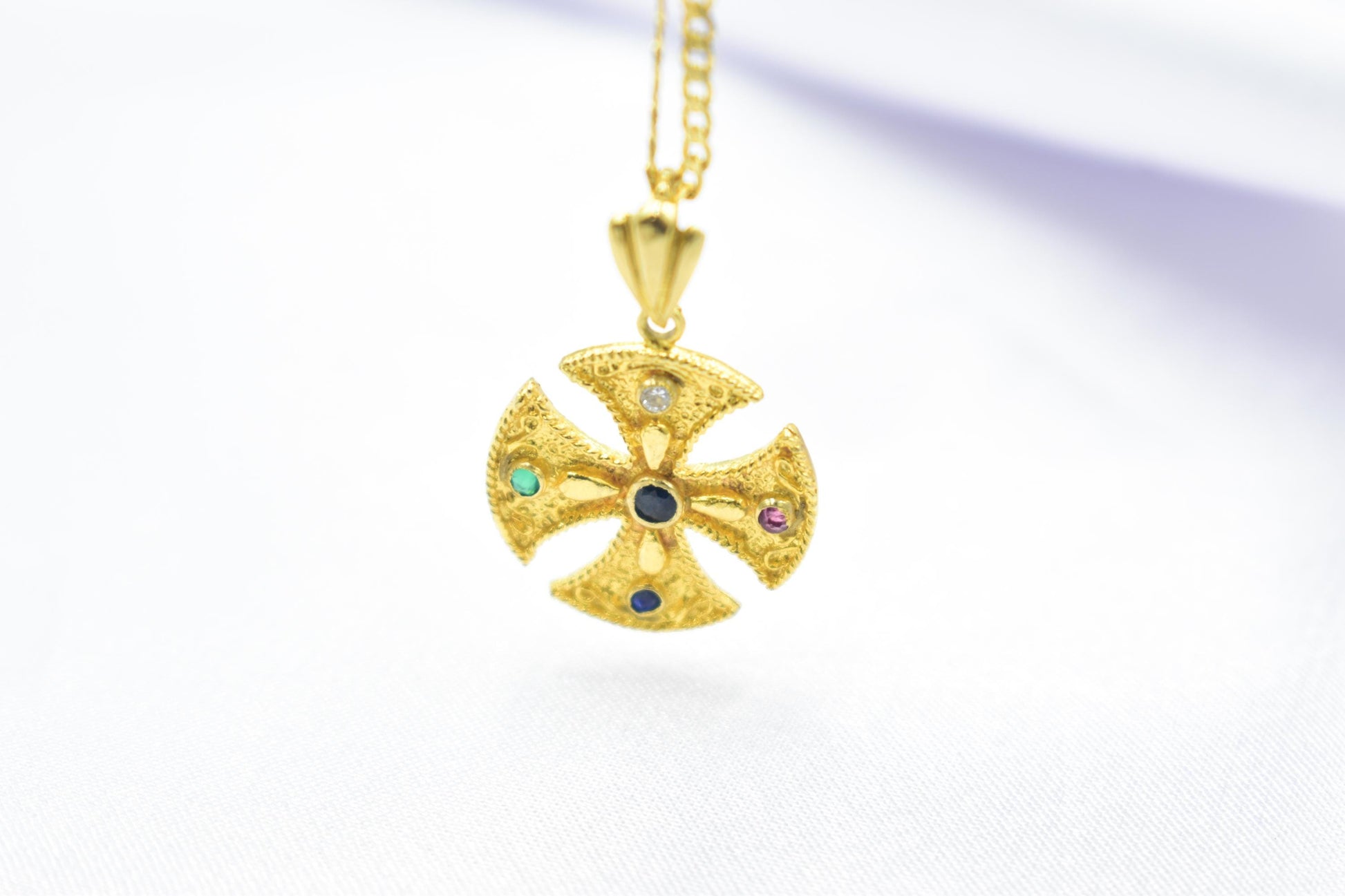 Ένας εντυπωσιακός βυζαντινός σταυρός 14 καρατίων με στρογγυλό σχήμα και περίτεχνη χειροποίητη υφή. Κάθε άκρο του φιλοξενεί ένα διαφορετικό ζιργκόν σε διακριτικά χρώματα, δημιουργώντας ένα μοναδικό σύνολο με έντονο συμβολισμό και αυθεντικό χαρακτήρα. ✨