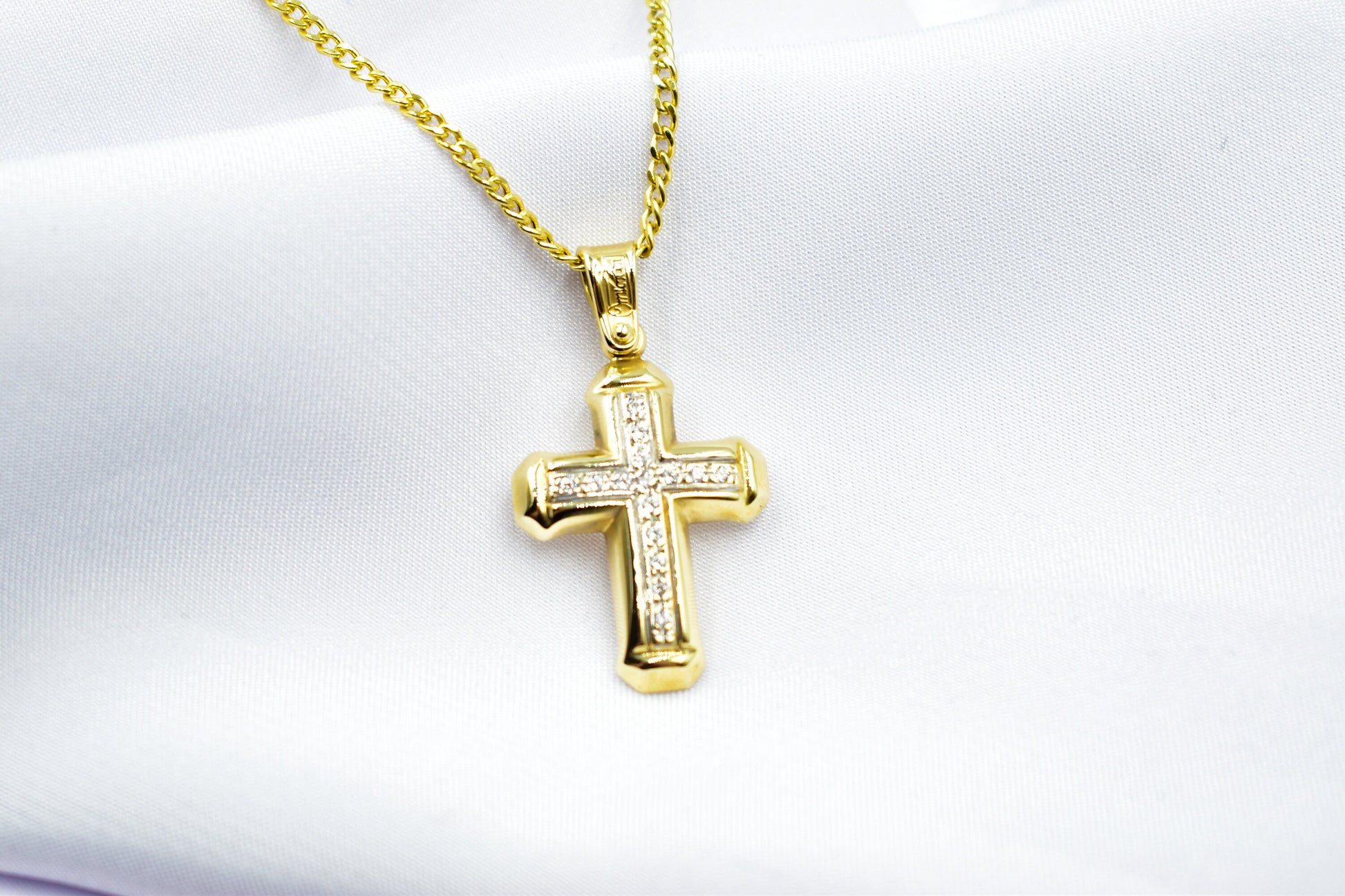 Celebrate your faith with a touch of brilliance with this elegant 14K solid gold cross pendant necklace featuring zircon stones. This beautifully crafted cross is adorned with sparkling zircons, adding a refined and timeless look to this meaningful symbol of devotion. Perfect for daily wear or special occasions, this necklace is a stylish and spiritual addition to any jewelry collection.