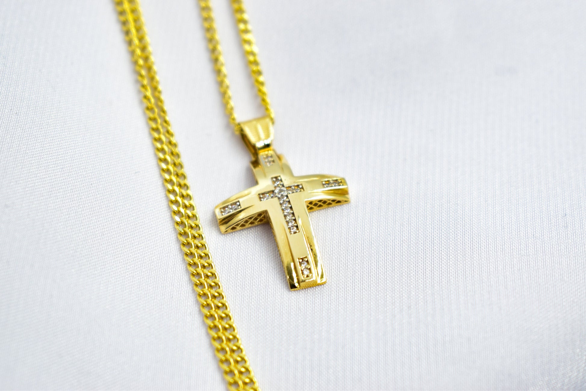 14K Solid Gold Cross Necklace,14K Solid Gold Large Cross Necklace,Plain Gold Cross Charm, Christian Pendant,14K Radiant Religious Gold Cross 14K Solid Gold Cross Necklace with Zircon - Stylish Christian Pendant, Radiant Religious Jewelry Embrace your faith with this exquisite 14K solid gold cross pendant necklace featuring a sparkling zircon. This beautifully designed piece combines timeless elegance with a modern flair, making it a captivating symbol of devotion suitable for both everyday wear and special occasions. Crafted from genuine 14K solid gold, this cross pendant shines with grace and sophistication. The zircon adds a brilliant touch, enhancing the beauty of this cherished symbol. Whether you’re celebrating your own faith or searching for a heartfelt gift for someone special, this necklace seamlessly blends spiritual meaning with the allure of fine jewelry. Key Features: Material: 14K Solid Gold Design: Classic cross adorned with a stunning zircon for an eye-catching effect Length: Available in various chain lengths to suit your preference Gift-Ready: Comes elegantly packaged, making it a perfect choice for baptisms, confirmations, weddings, or religious celebrations Ideal for those who appreciate spiritual jewelry with a hint of sparkle, this 14K gold cross necklace with zircon serves as both a beautiful reminder of faith and a fashionable accessory. This cross pendant artfully combines religious significance with the brilliance of zircon, creating a distinctive piece that is both meaningful and stylish.
