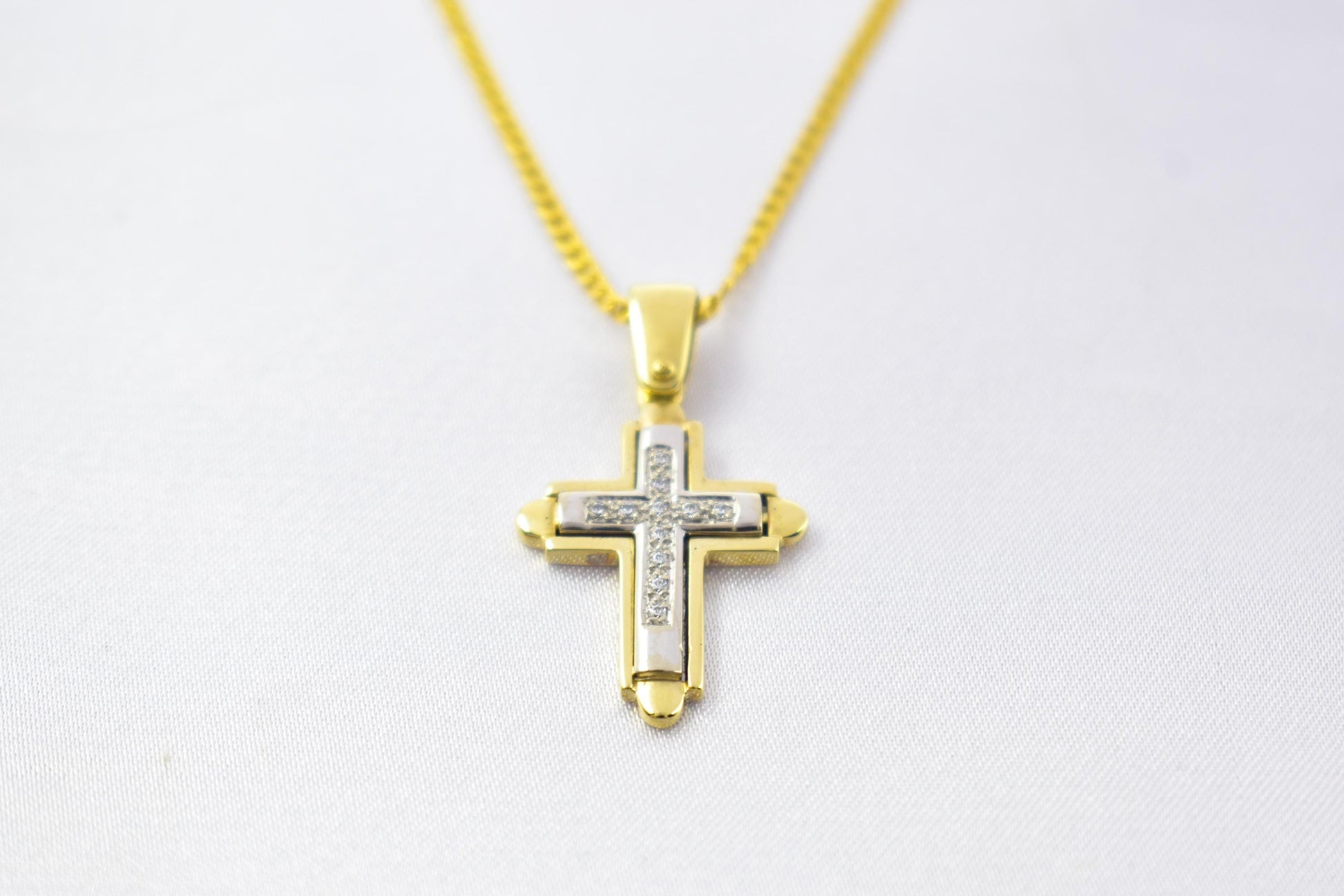 γυναικα 14K Solid Gold Cross Pendant White Zircon Stones,Two-Tone Yellow-White Gold Finish,Optional 14K Chain,Elegant Christian Gift for Men & Women