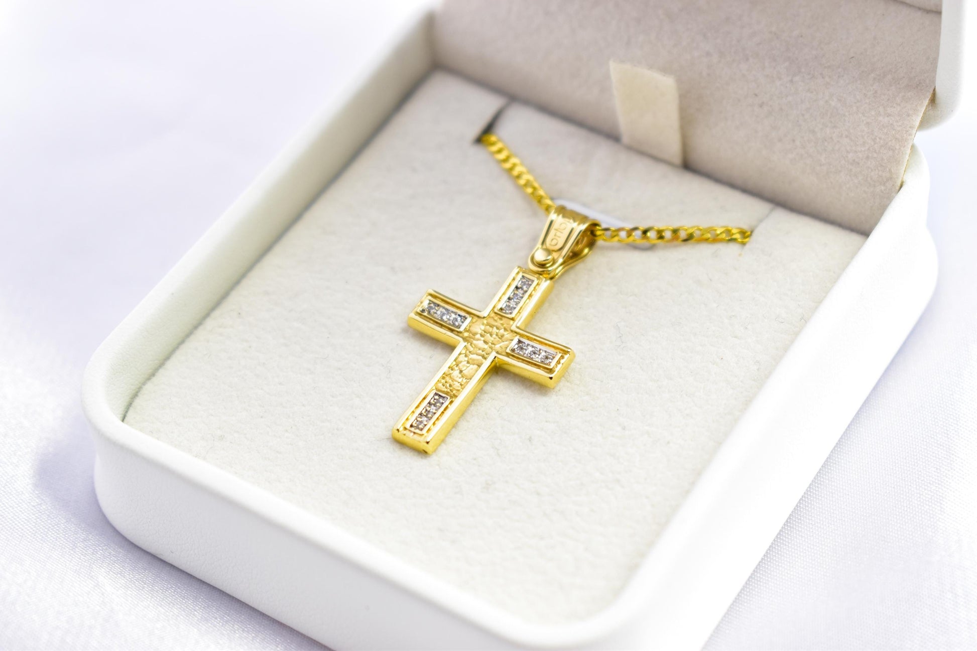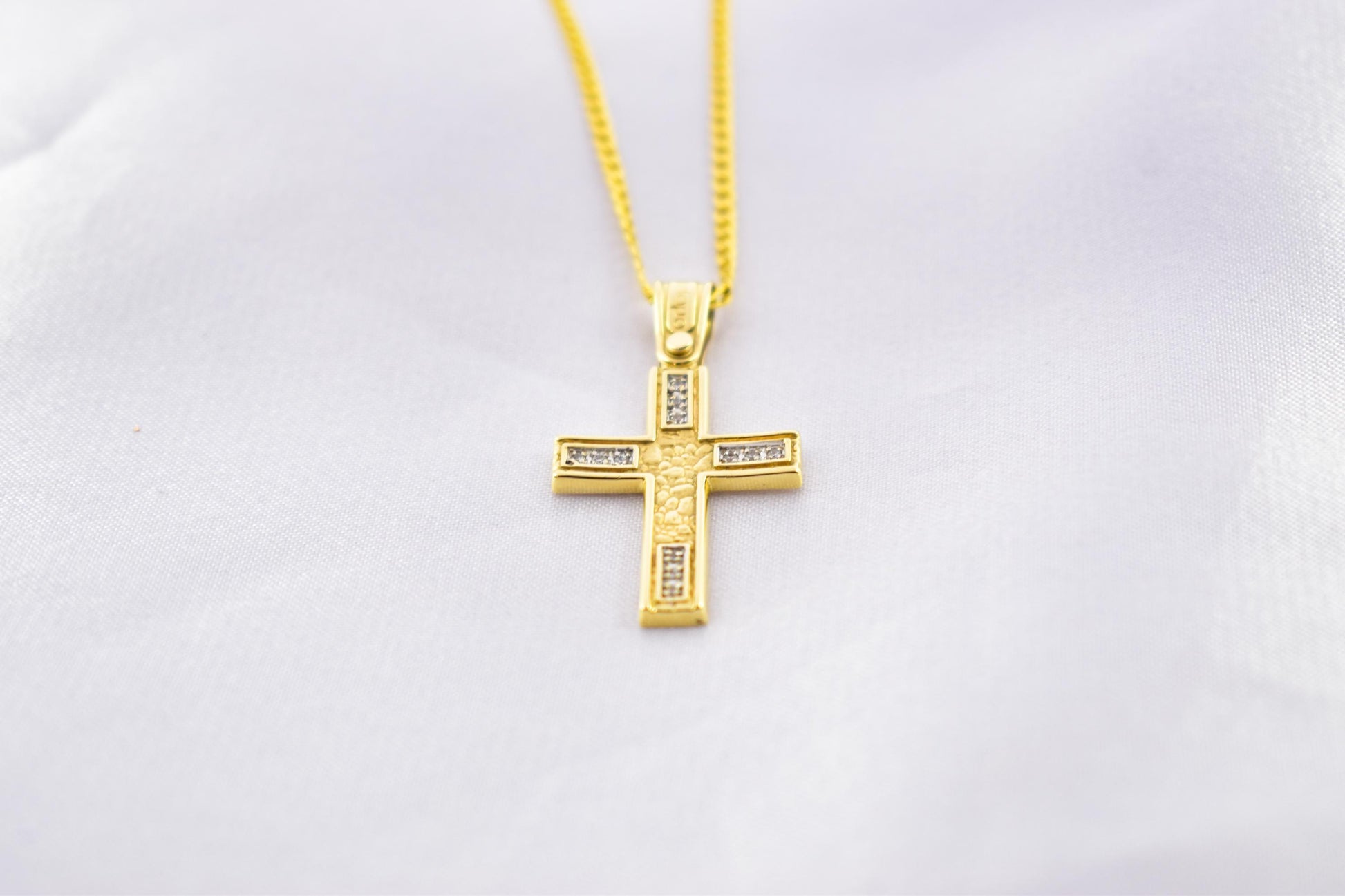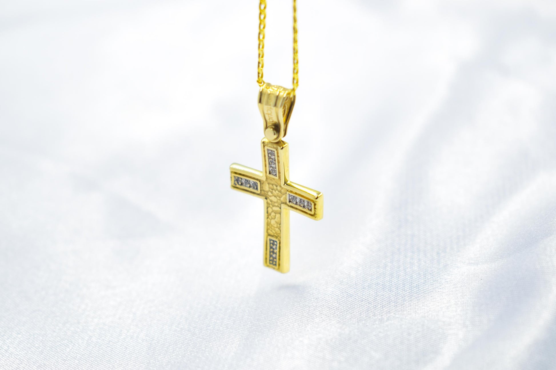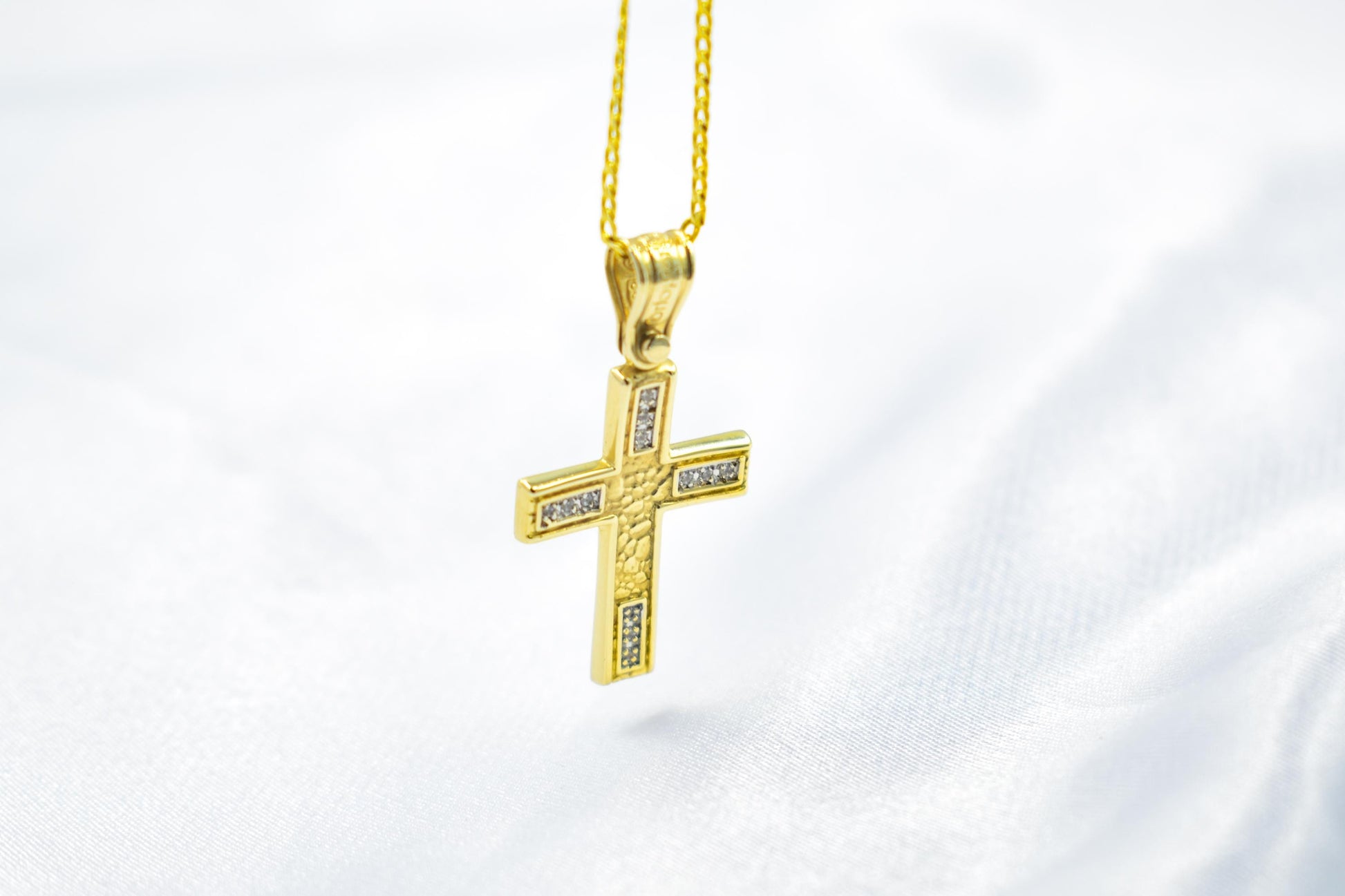 γυναικα 14K Solid Gold Cross Pendant with Zircon,Hammered Texture,Optional 14K Chain,Handmade Religious Jewellery,Women’s Men’s Cross,Baptism Gift